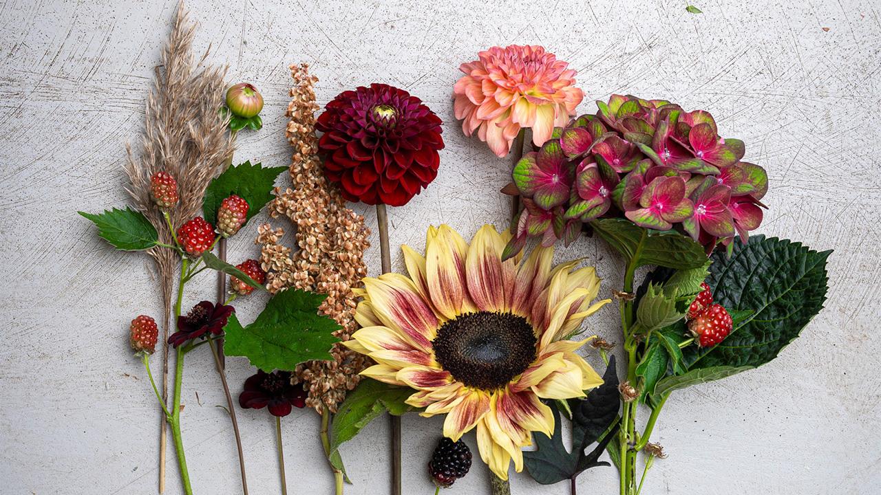 Sensommaren och hösten är den bästa tiden för blommor som solros, hortensia, dahlia, krysantemum, gladiolus och aster. Dekorativa bär, gräs och fröställningar är fina som komplement.