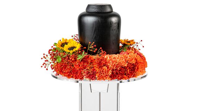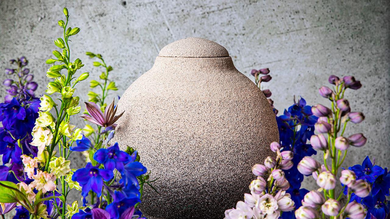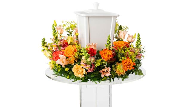Att dekorera med blommor runt eller nedanför urnan skapar en varm känsla. Urnan kan till exempel placeras i en vacker krans eller kanske på en äng av riddarsporrar. Valet av blommor kan göra dekorationen väldigt personlig och väcka fina minnen. Om den avlidna till exempel hade rosor i sin trädgård kan urnan omges av en dekoration som för tankarna till en vacker rosberså.
