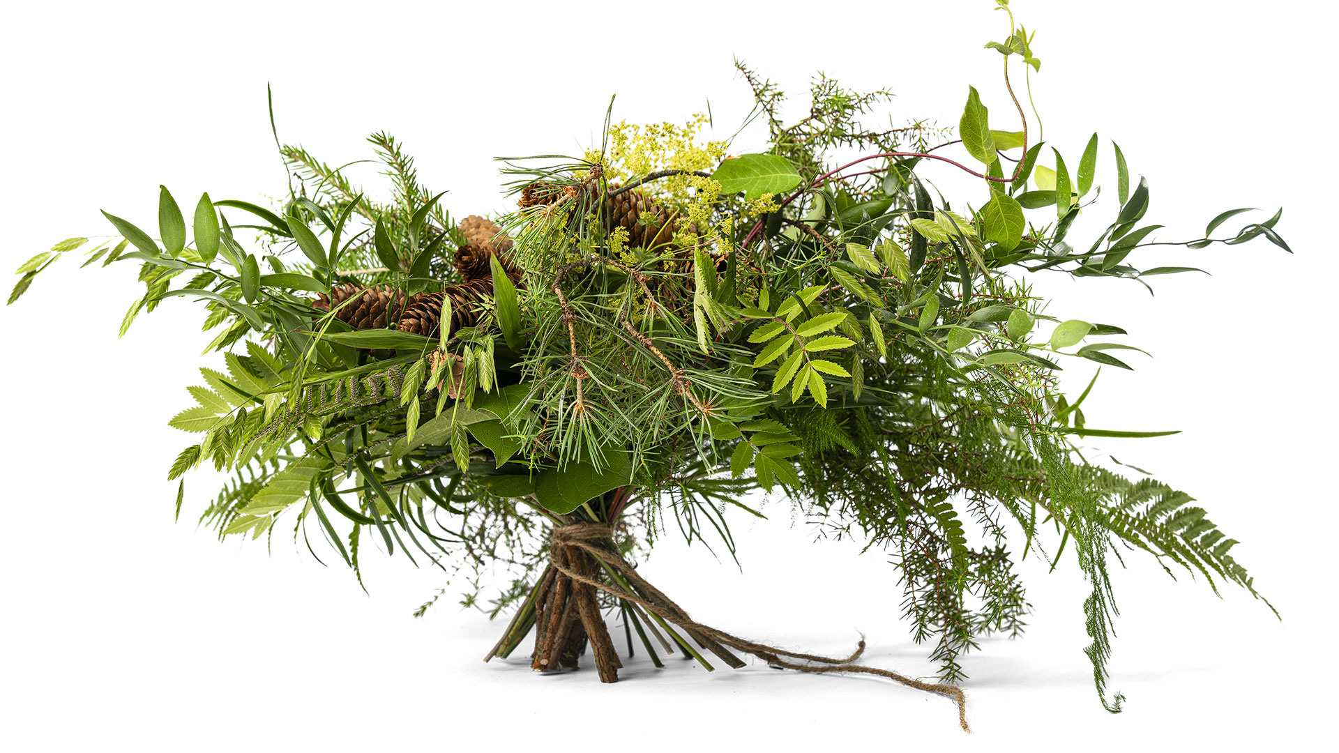 En grönskande bukett med inslag och detaljer från skogen.895 kr