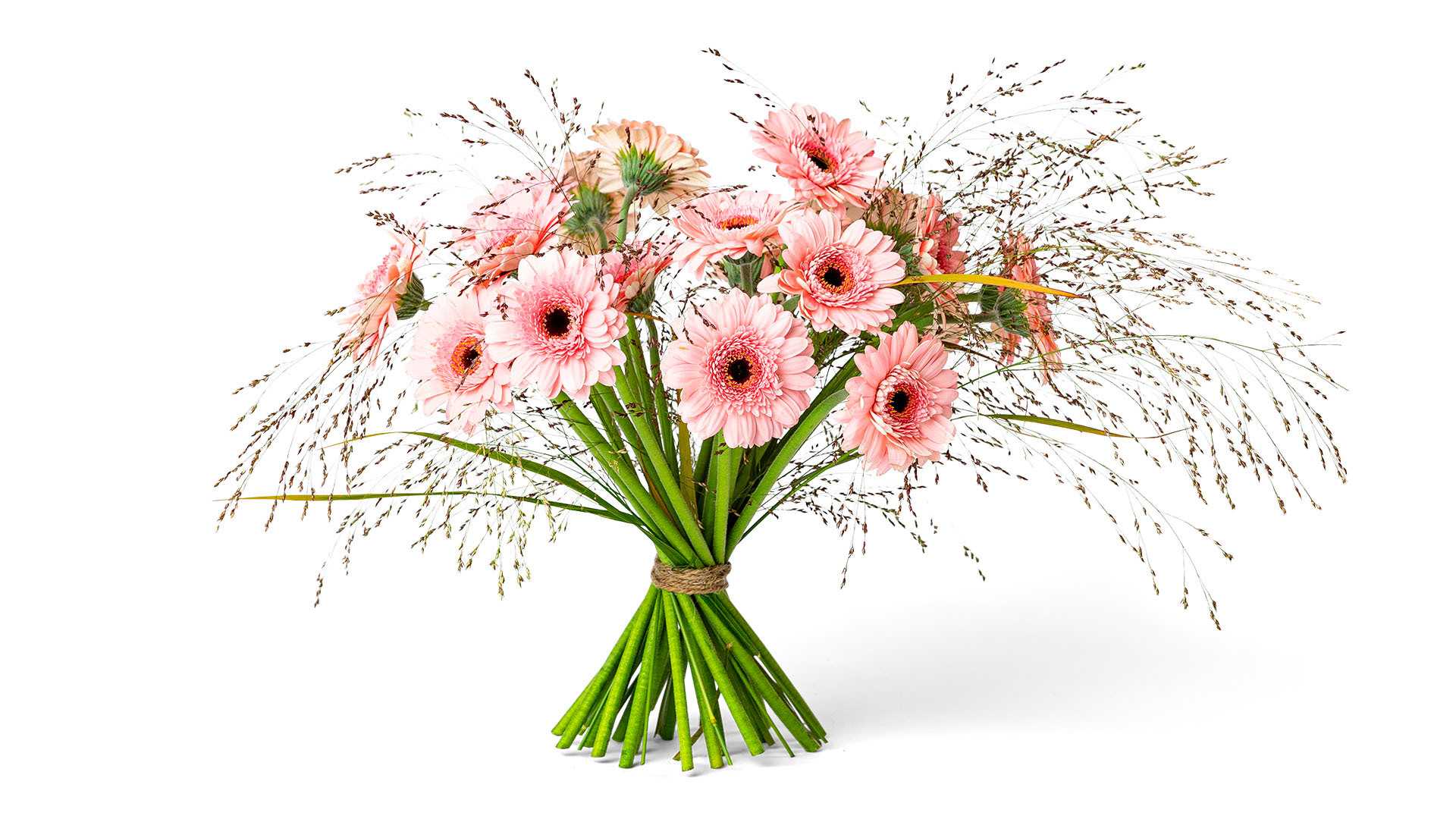 En luftig bukett med rosa germini och skira grässtrån.845 kr