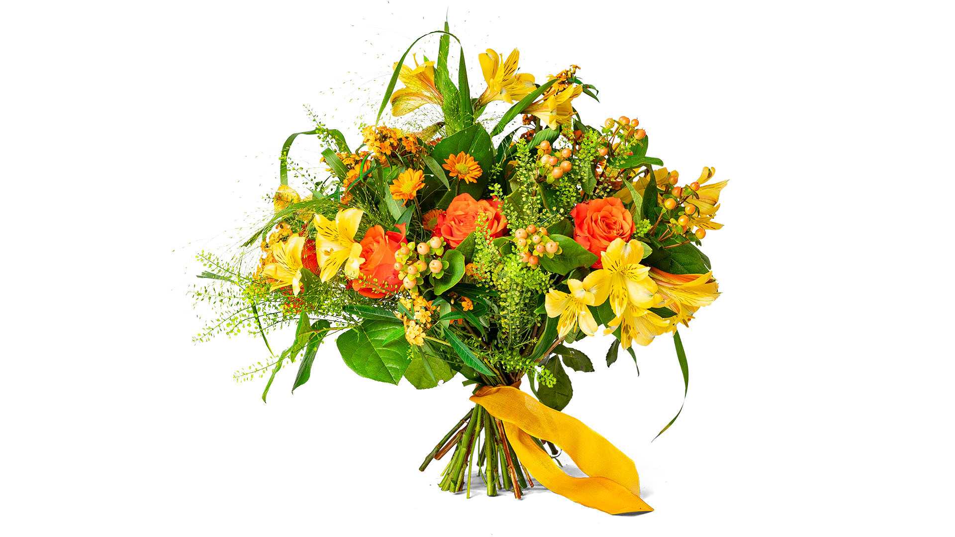 En lysande bukett fylld med blommor i nyanser av gult och orange.945 kr