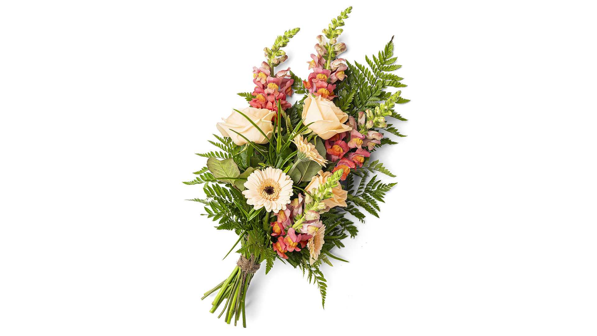 En liggande bukett med blommor i toner av orange och aprikos tillsammans med vackert grönt.795 kr