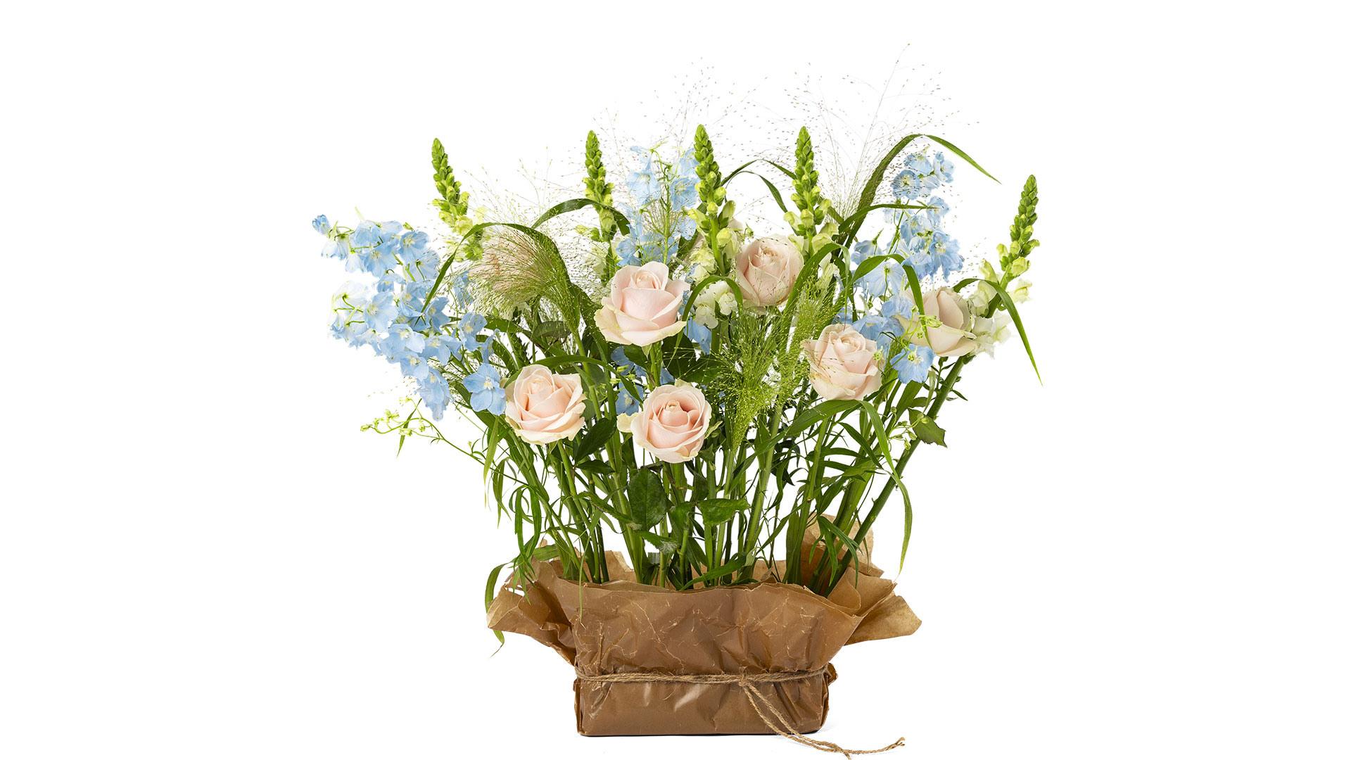 En blomsterdekoration med blommor i olika ljusa pastellfärger, inslagen i vaxat papper för att enkelt kunna förflyttas till exempelvis en efterföljande minnesstund.Bredd: ca 40 cm