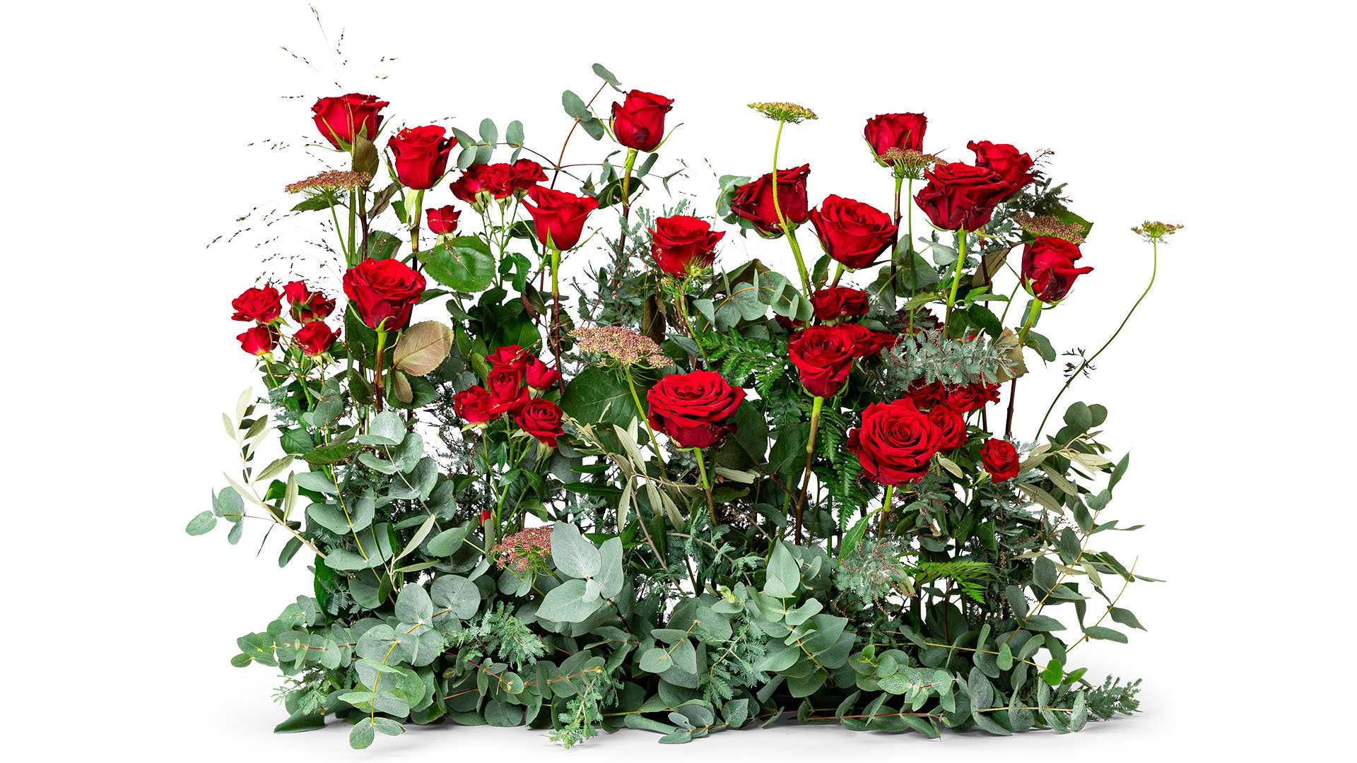 En hög stor blomsterdekoration i form av en växande blomstertuva med vackra djupröda rosor och silvergrå eukalyptus.