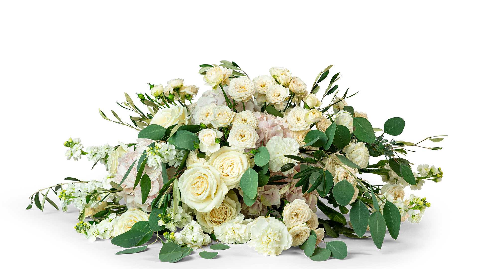 En stor blomsterdekoration med cremevita rosor och andra vita blommor tillsammans med silvergrå eukalyptus.Bredd: ca 50 cm