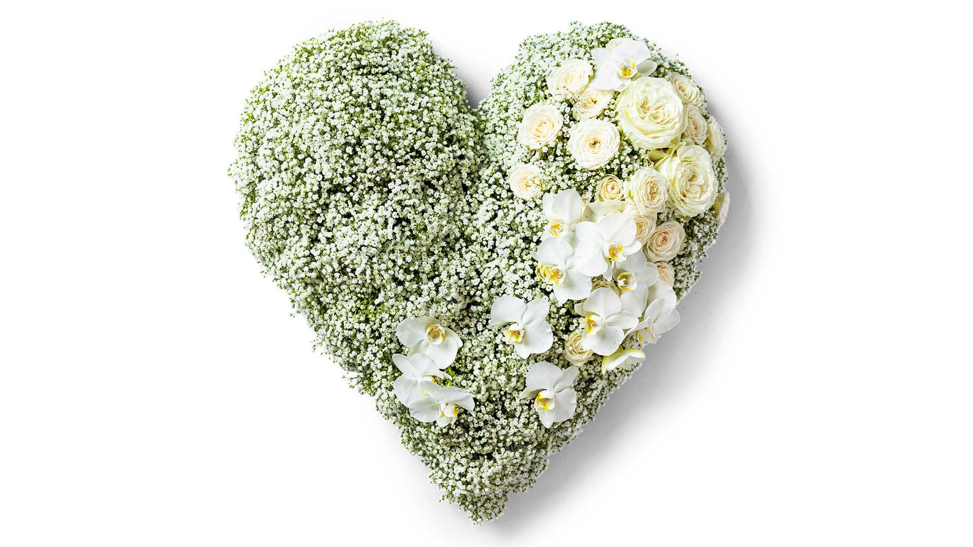 Ett fyllt hjärta med brudslöja, orkidéer och rosor i olika vita nyanser.Format: Ø Stort hjärta ca 55 cm (på bilden).