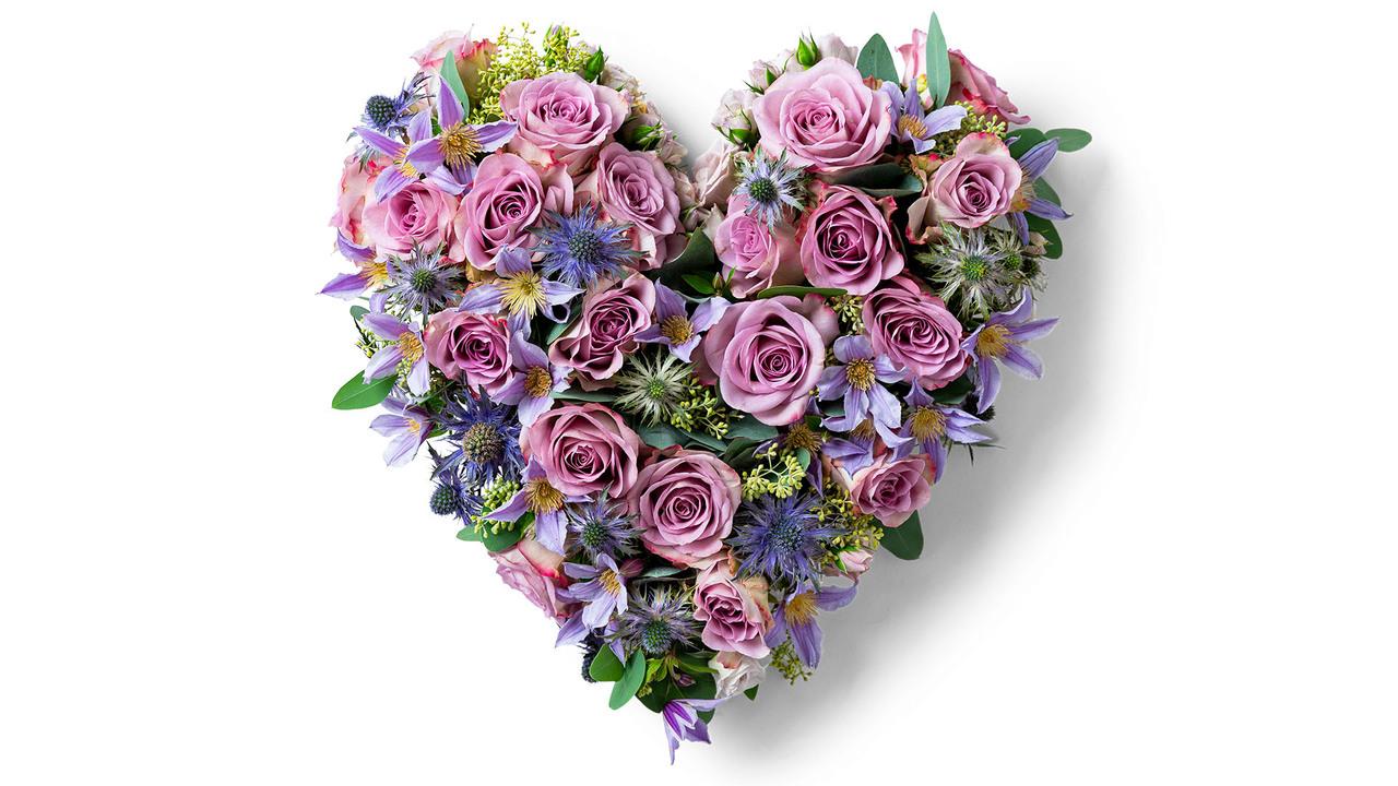 Ett fyllt hjärta med rosor och klematis i olika lila toner tillsammans med tistlar och gröna blad.Format: Ø Stort hjärta ca 55 cm (på bilden visas ett mindre hjärta).