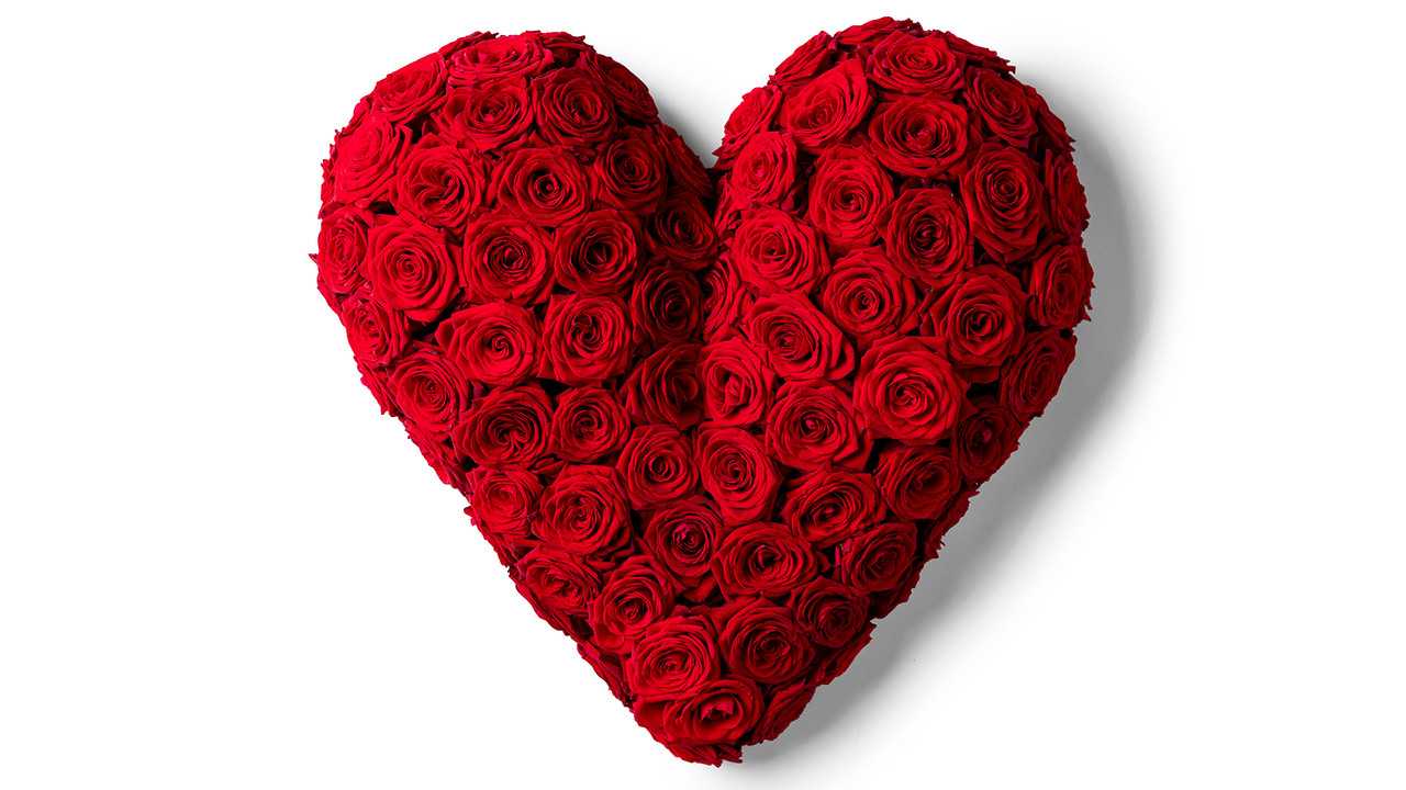 Ett fyllt kärlekshjärta med vackra djupröda rosor.Format: Ø Stort hjärta ca 55 cm (på bilden).