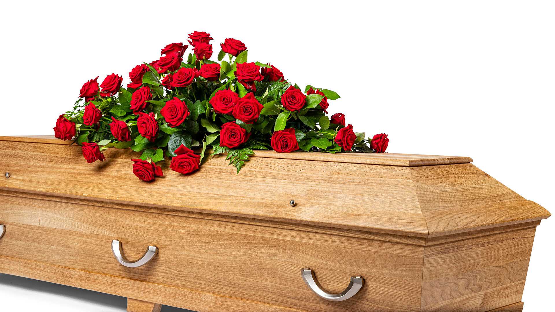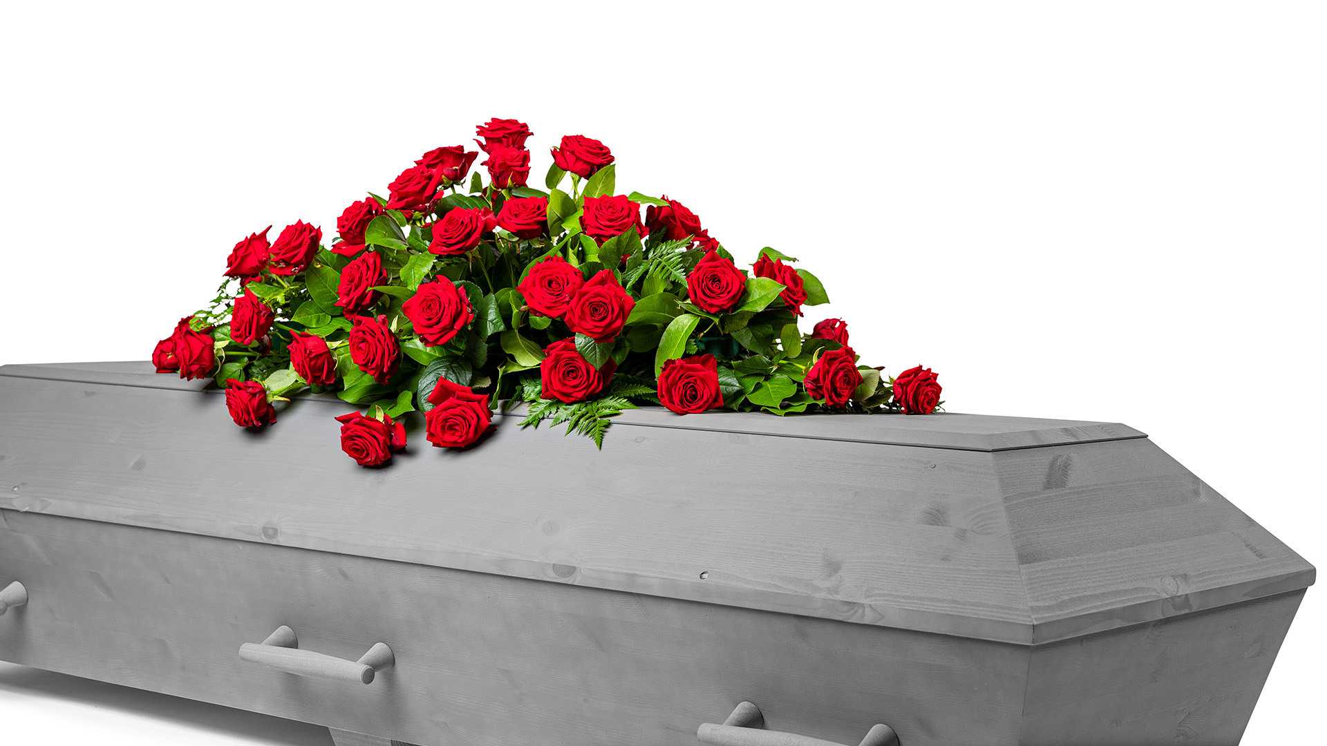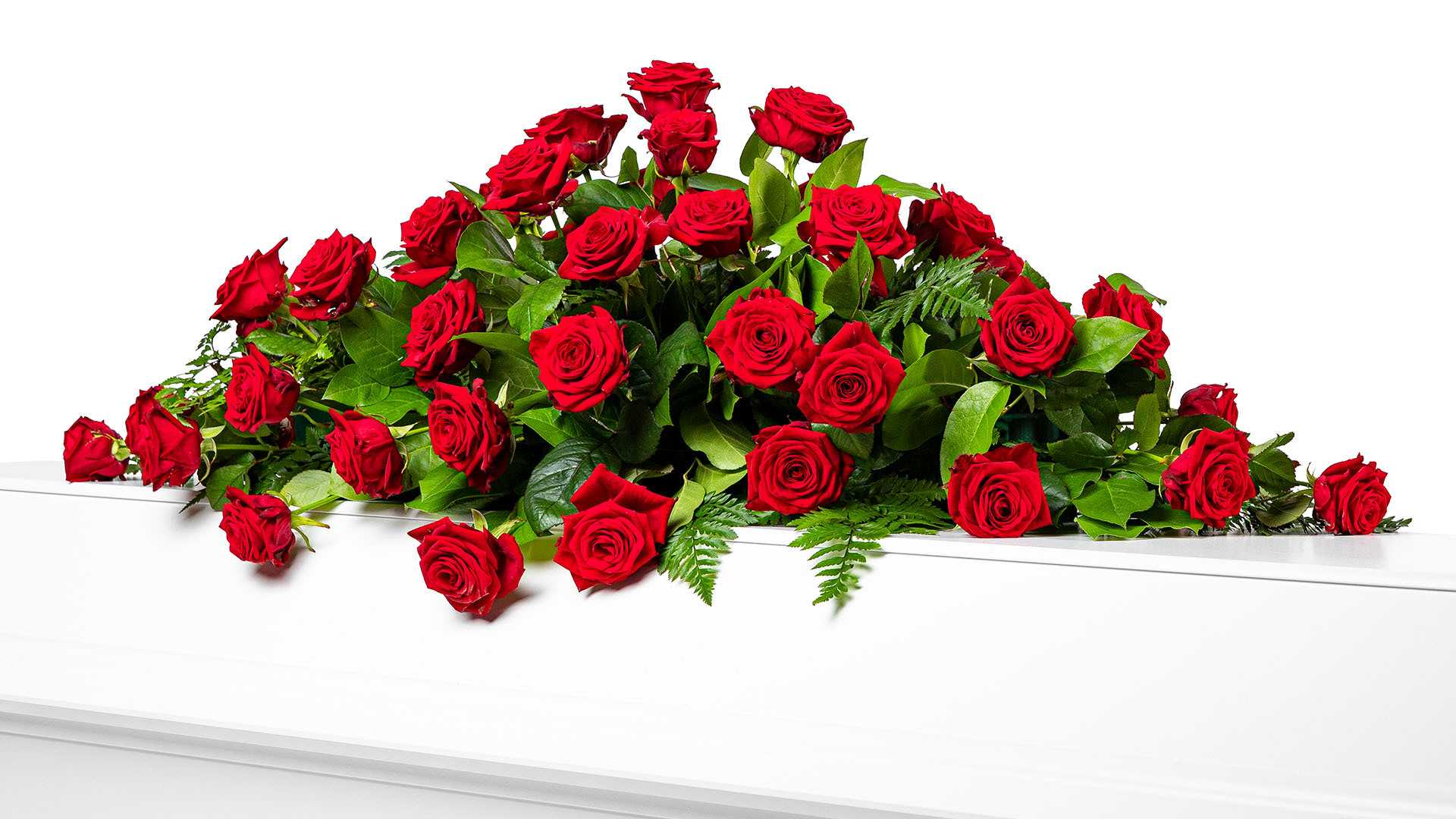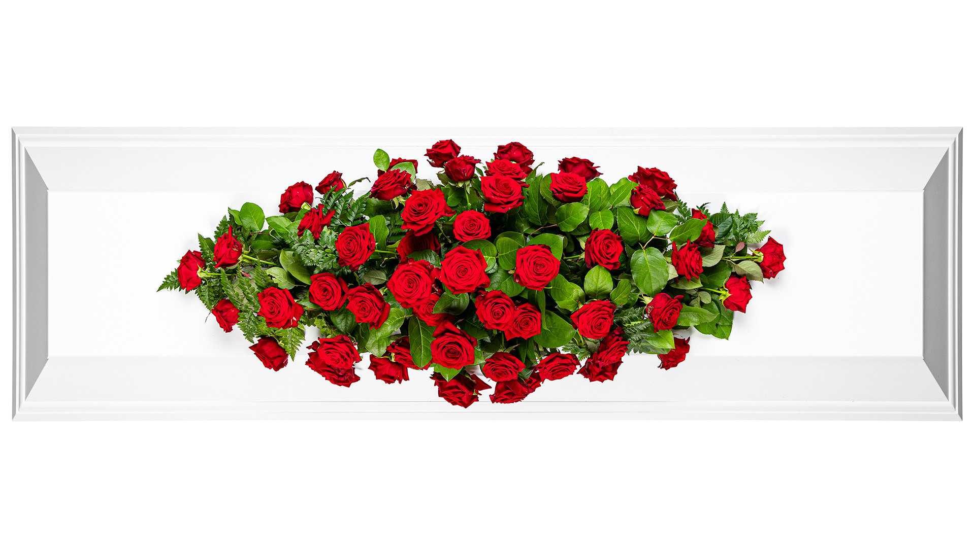 En klassisk mindre kistdekoration med vackra djupröda rosor och frodigt grönt.Längd: ca 80 cm