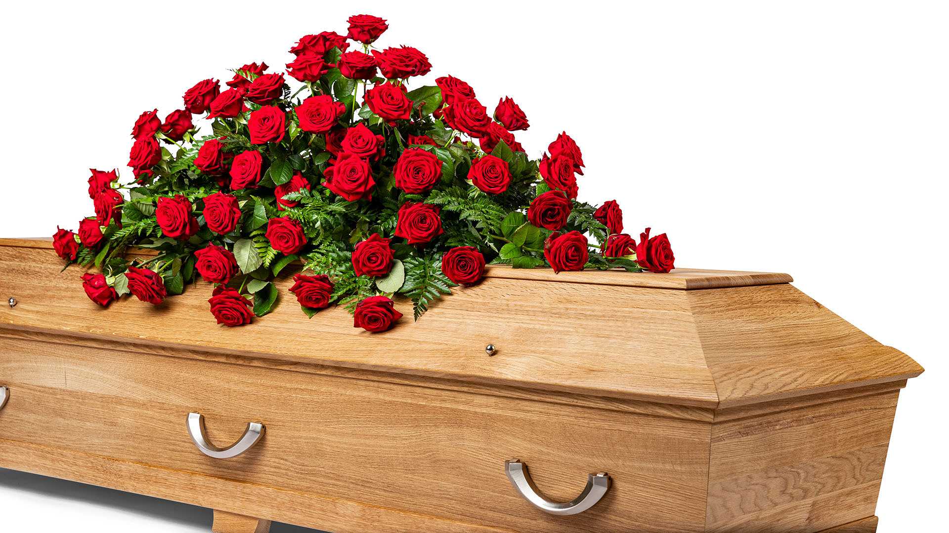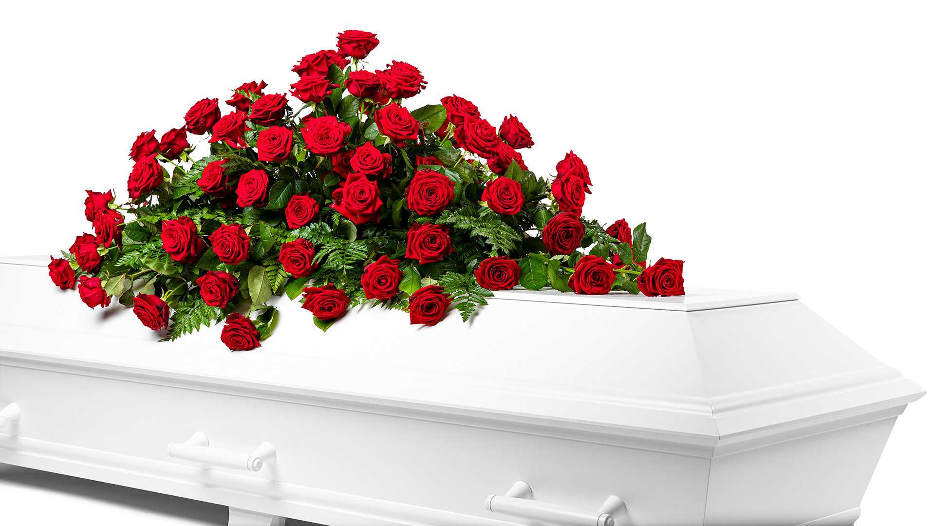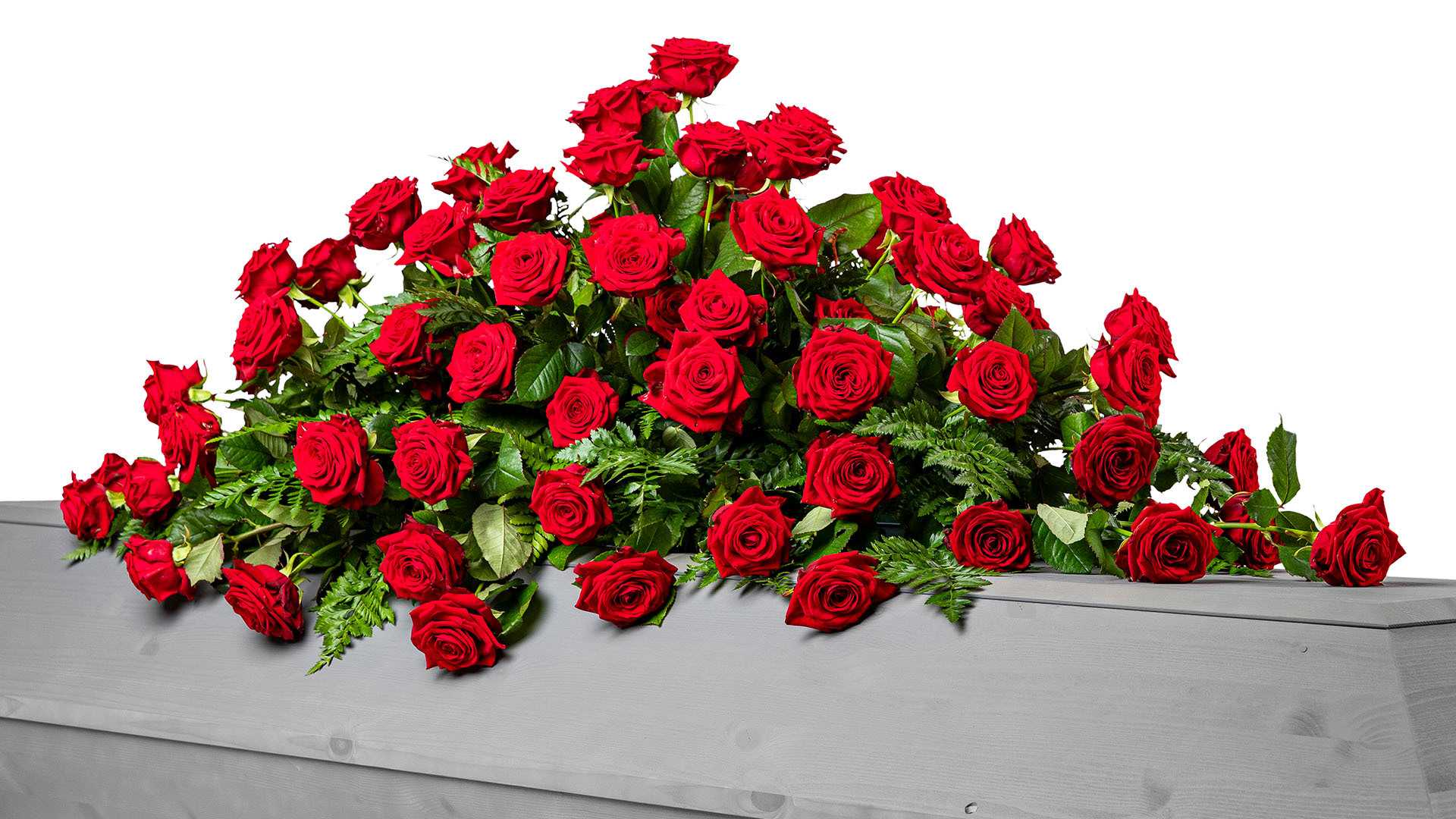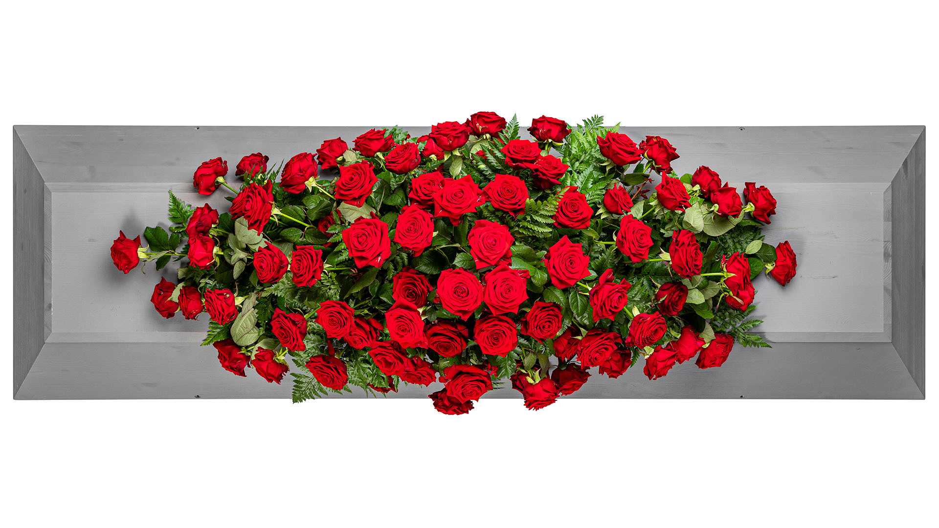 En klassisk stor kistdekoration med vackra djupröda rosor och gröna inslag.Längd: ca 110 cm