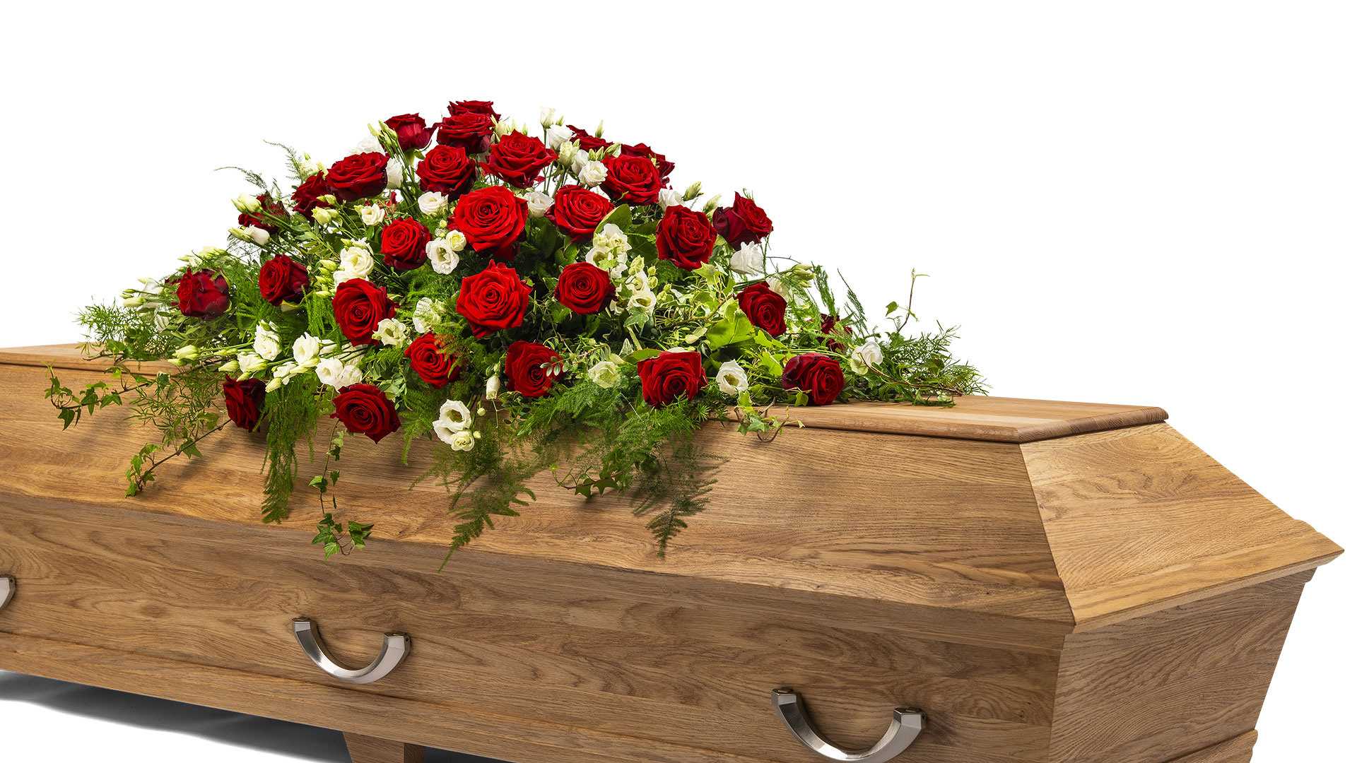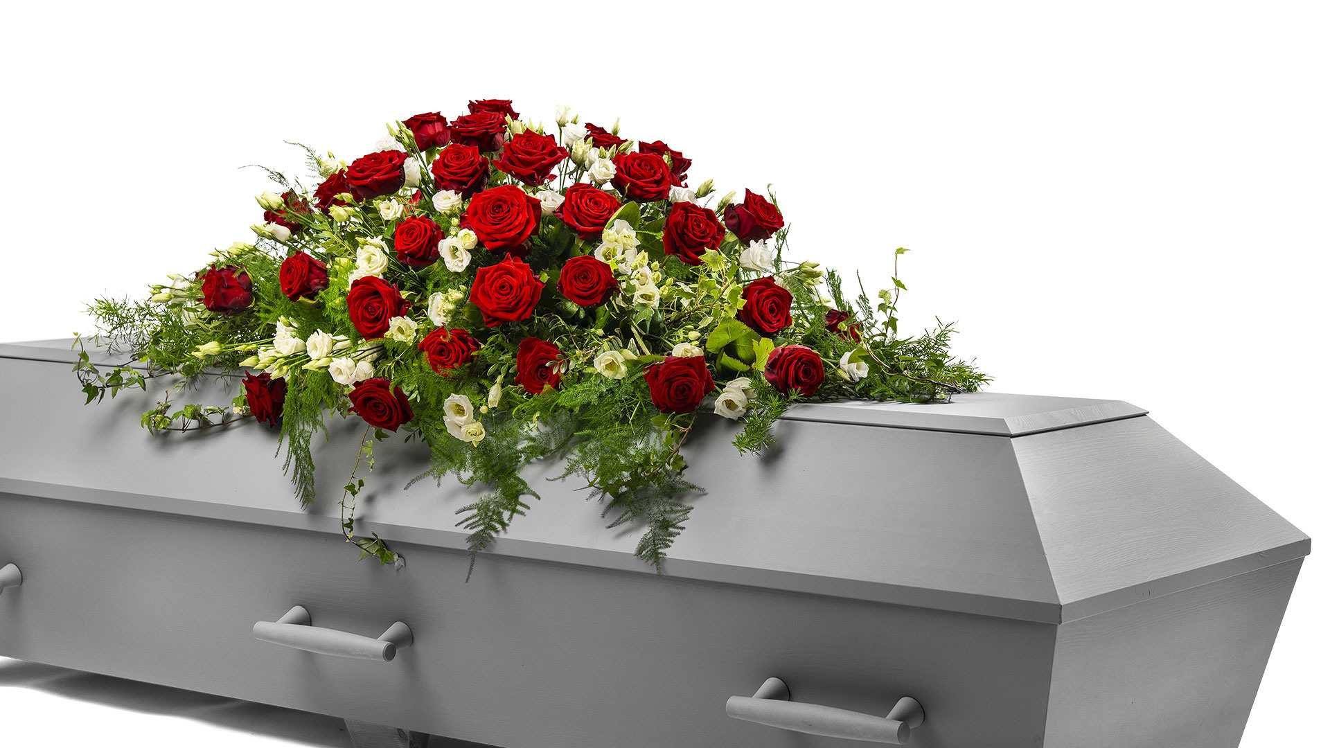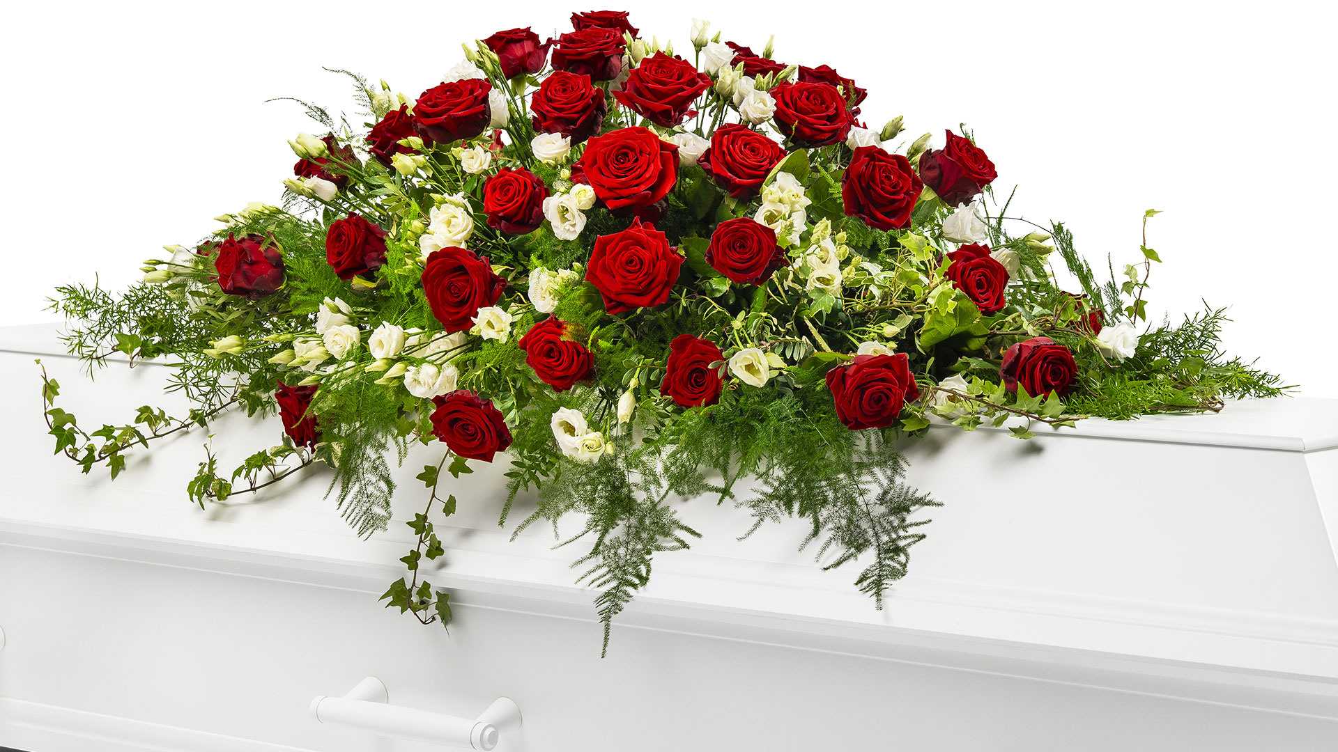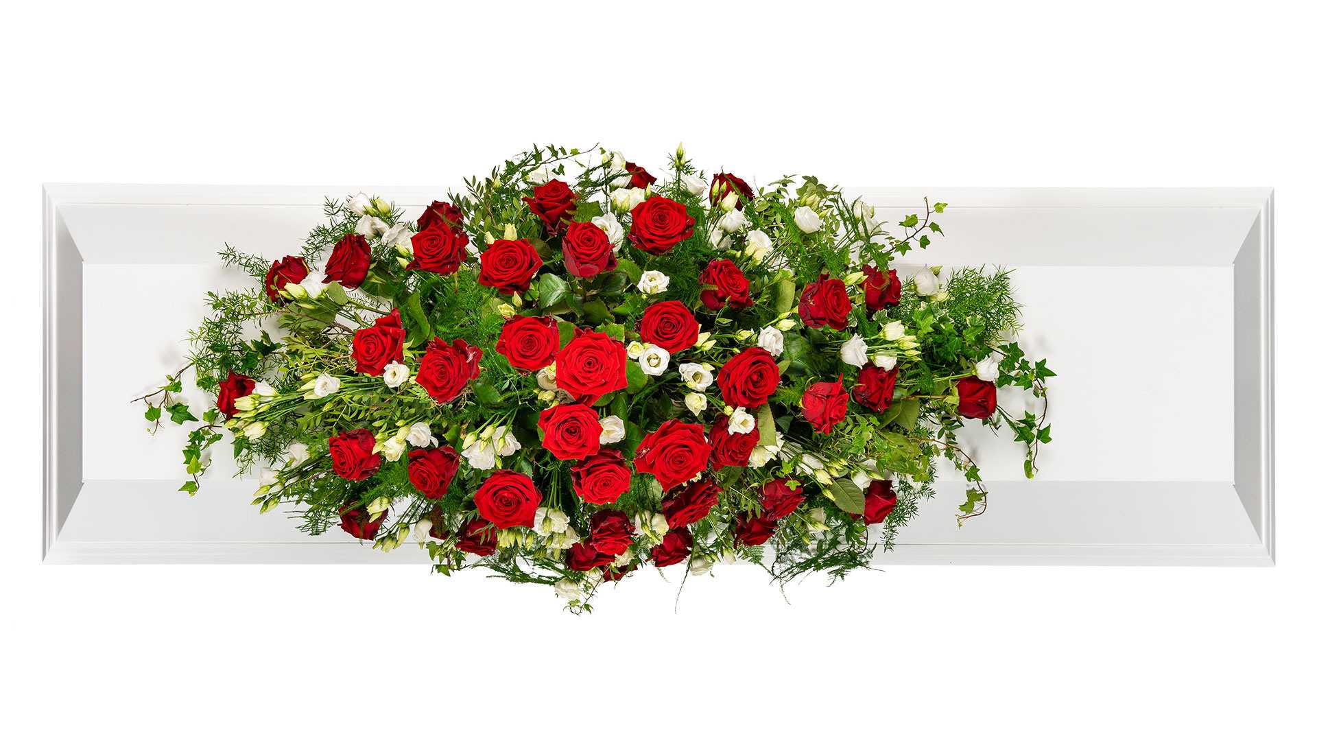 En låg kistdekoration med vackra djupröda rosor, vita inslag och mjukt slingrande grönt.Längd: ca 110 cm