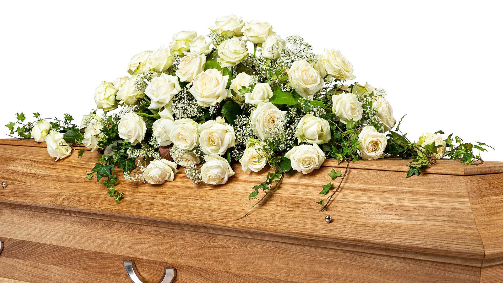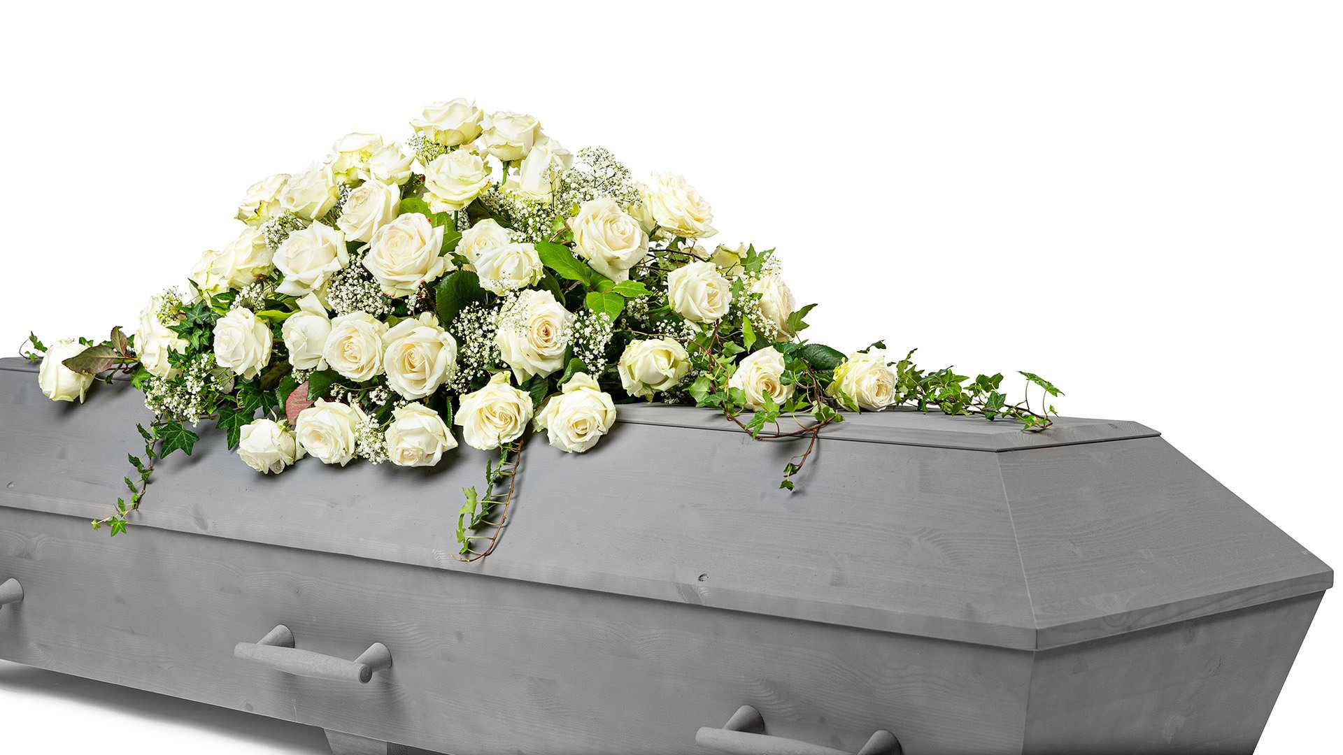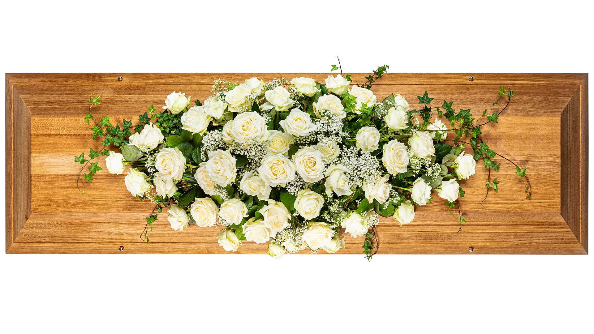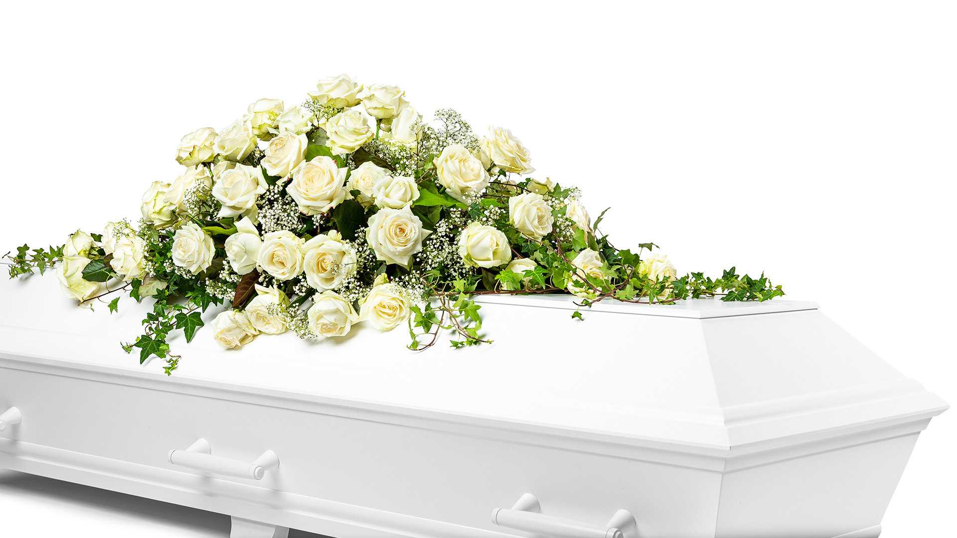 En klassisk stor kistdekoration med cremevita rosor, kvistar av skir brudslöja och slingrande grönt.Längd: ca 110 cm