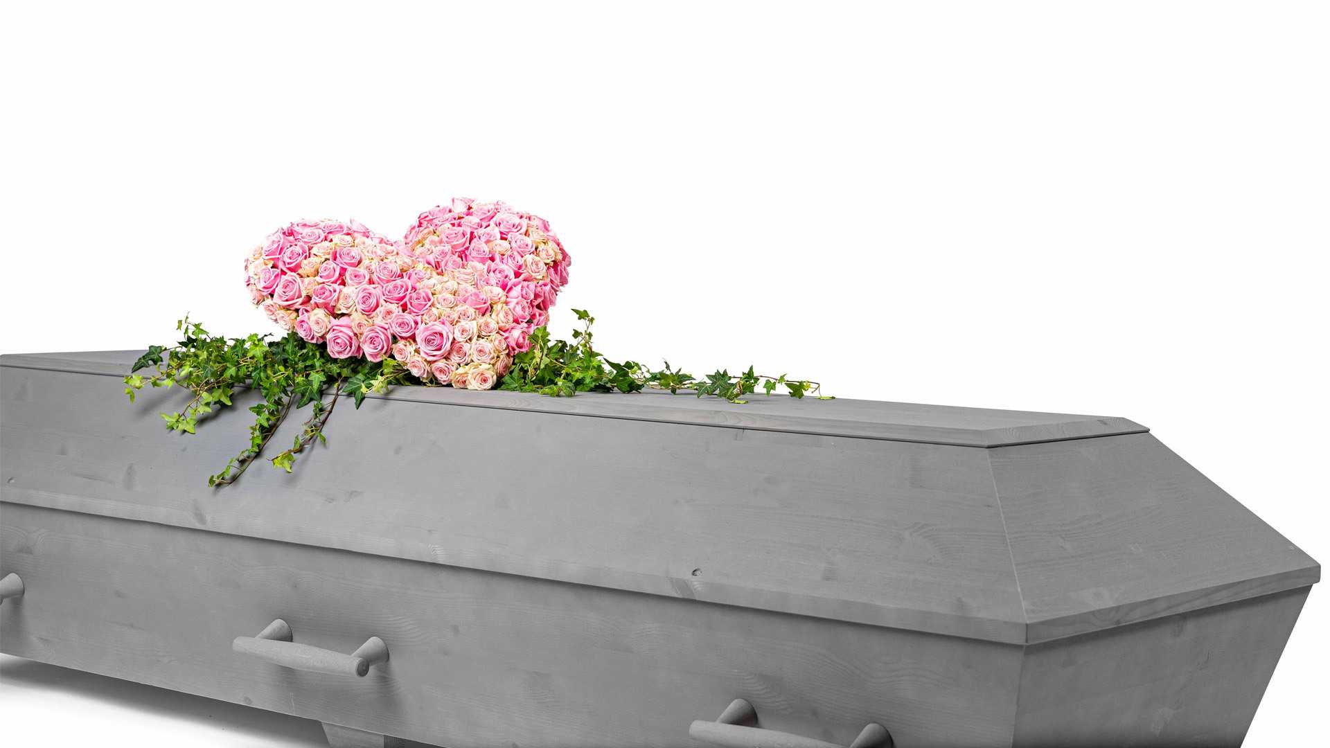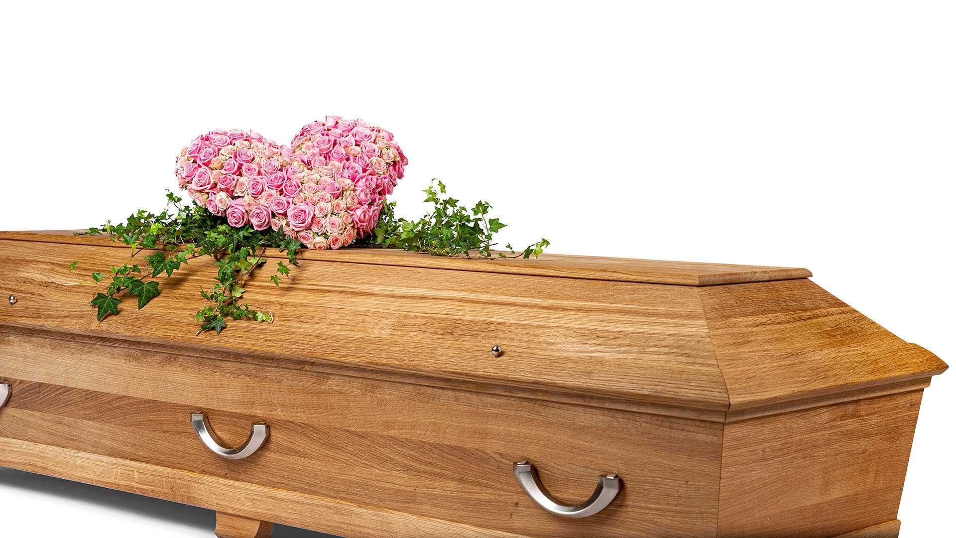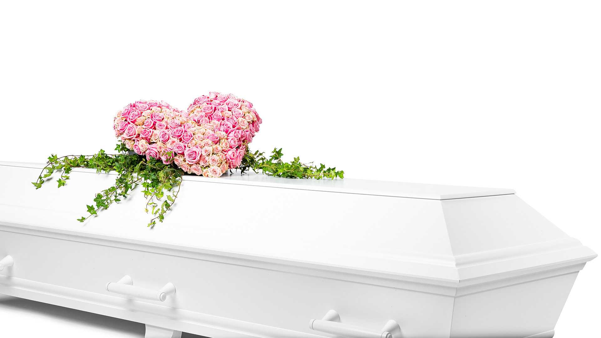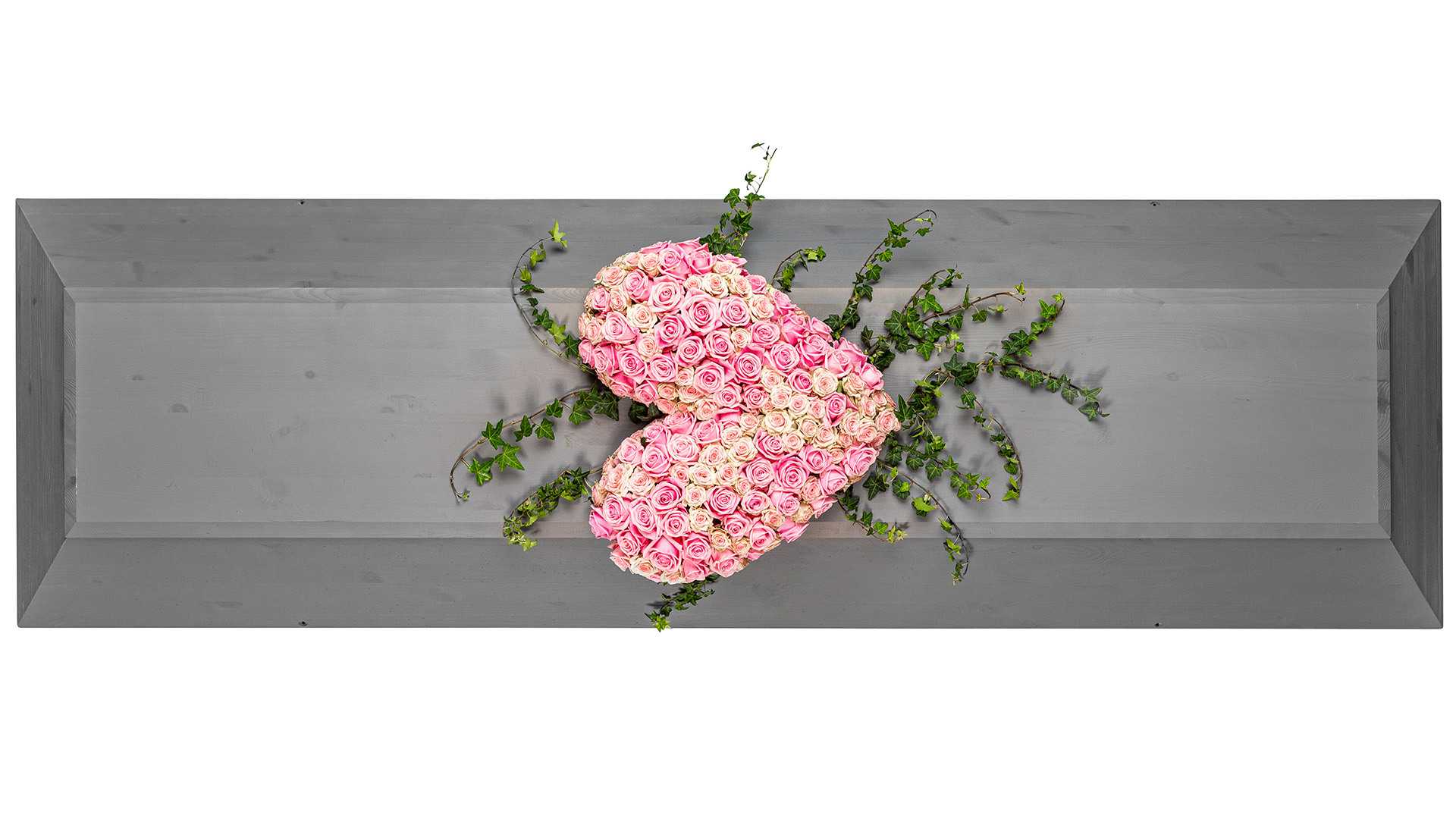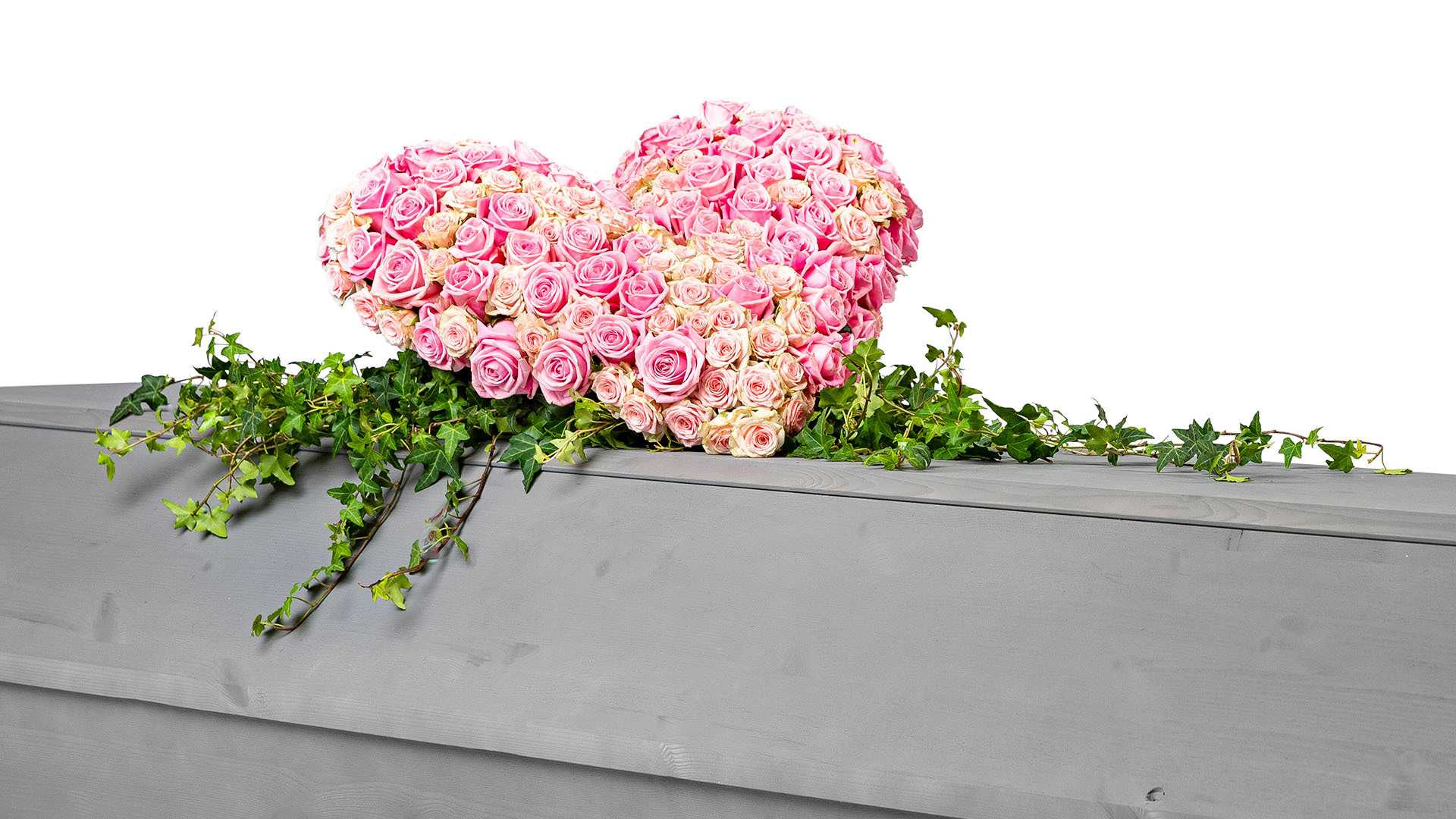 En mindre kistdekoration med rosa rosor och rosenknoppar formade som ett hjärta liggande på en bädd av slingrande murgröna.Format: Ø Hjärta ca 40 cm