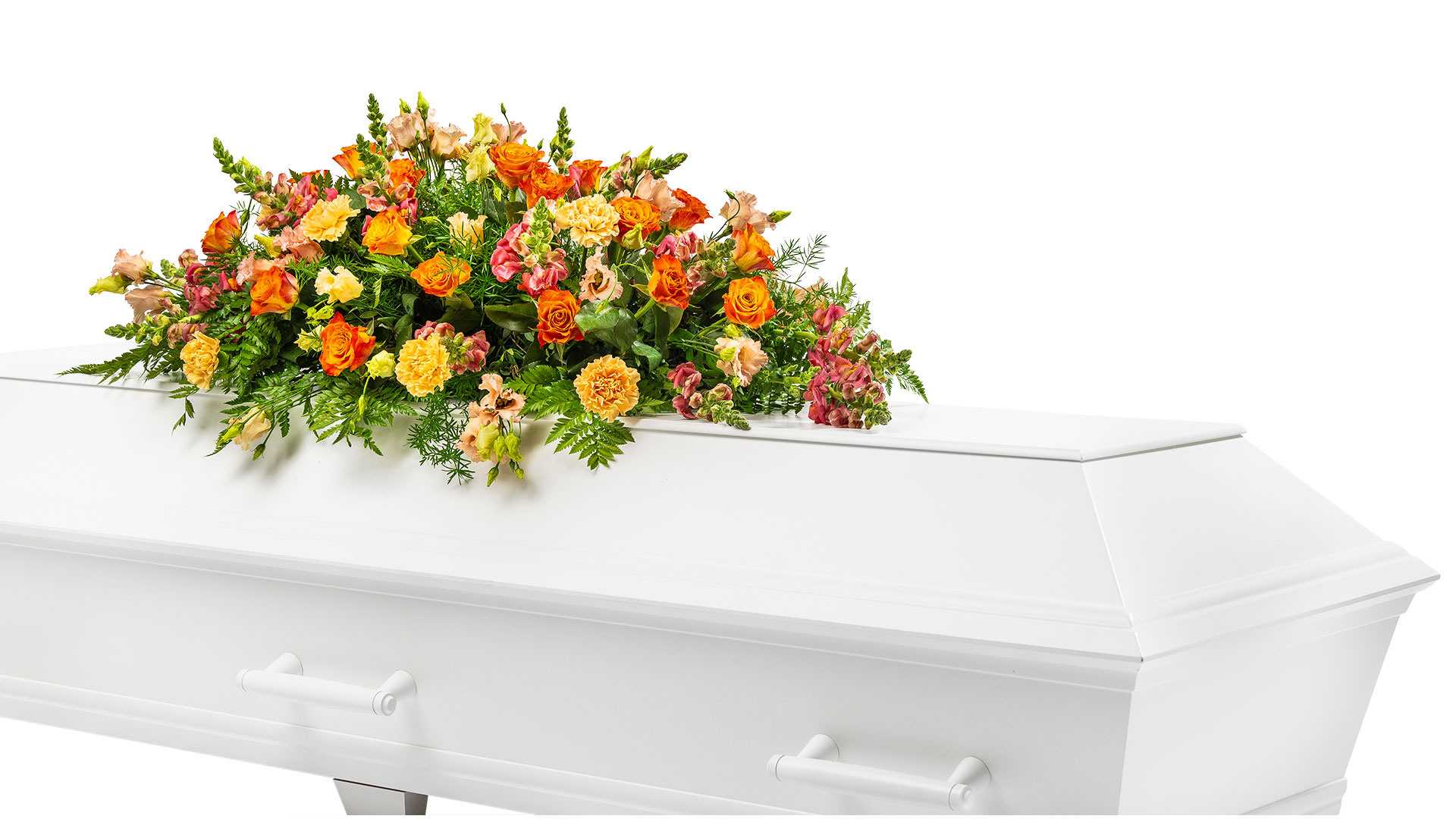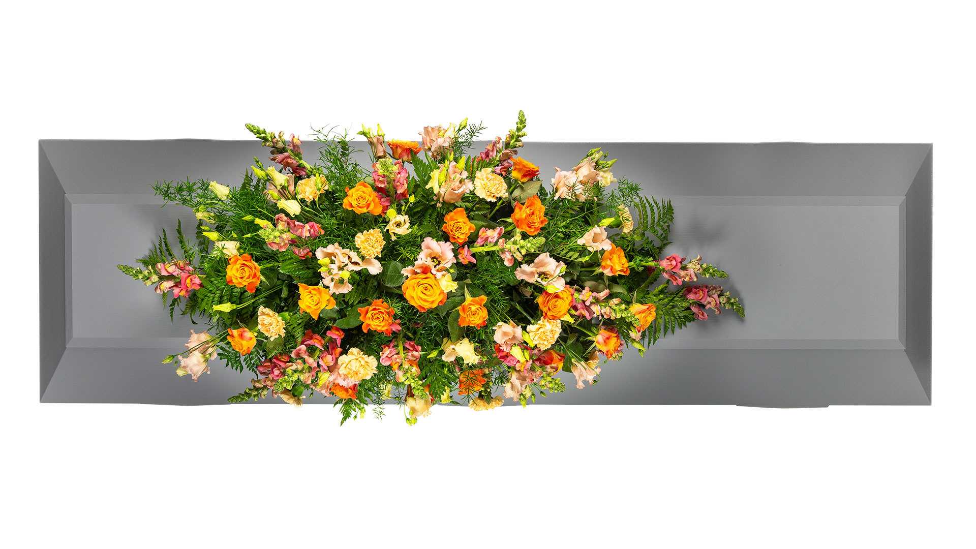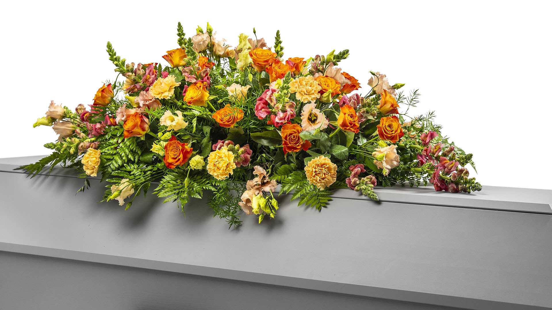 En mindre kistdekoration i en mjuk och följsam form med blommor i toner av orange och aprikos.