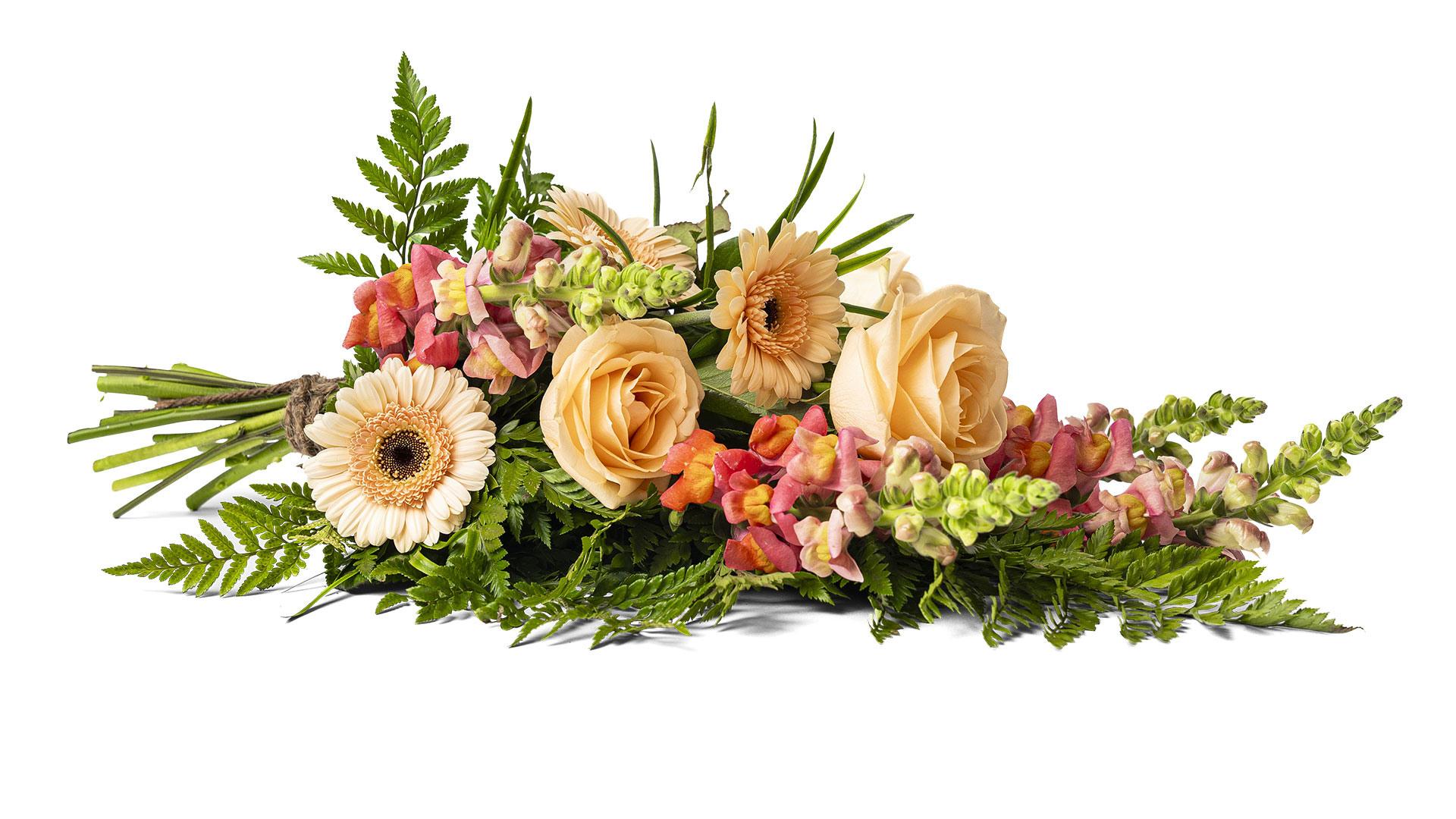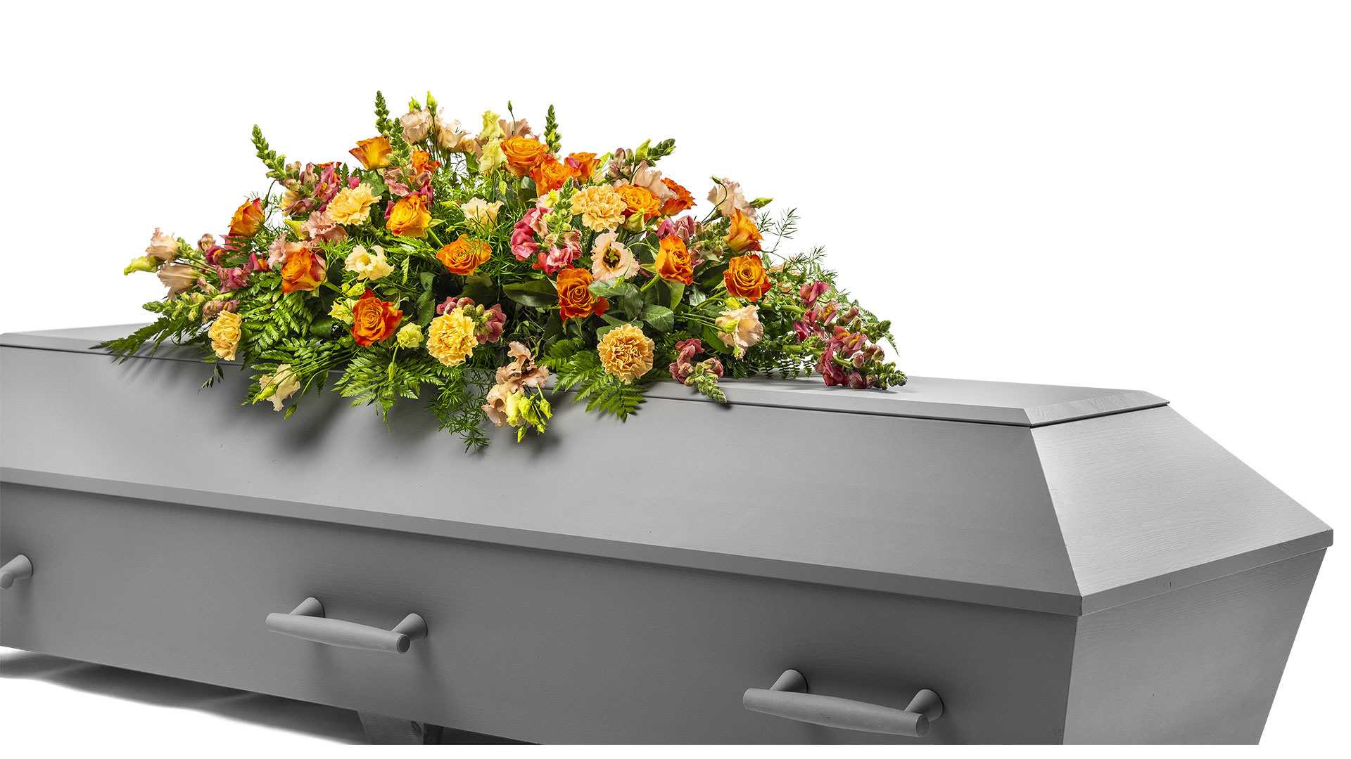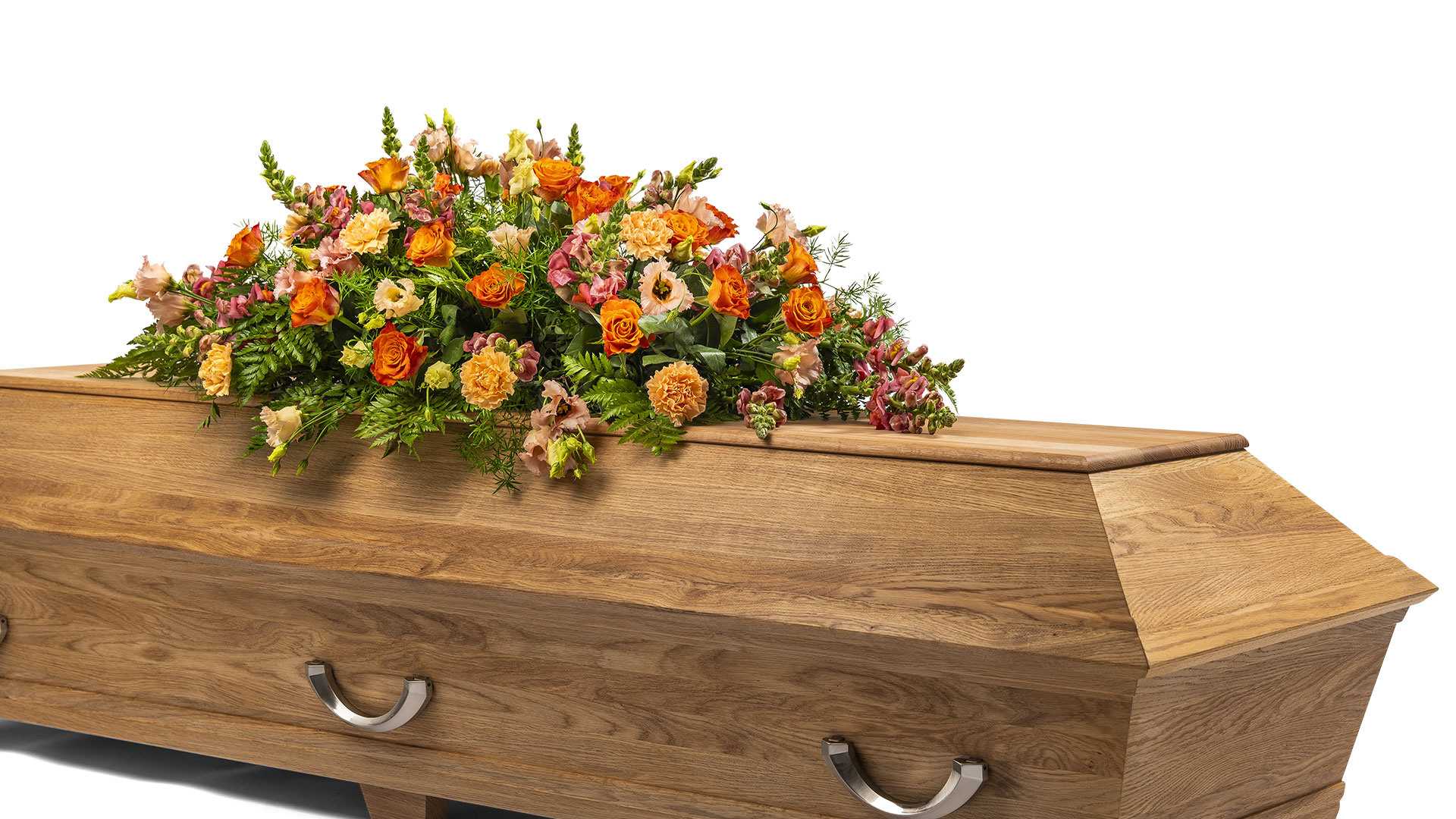 En mindre kistdekoration i en mjuk och följsam form med blommor i toner av orange och aprikos.