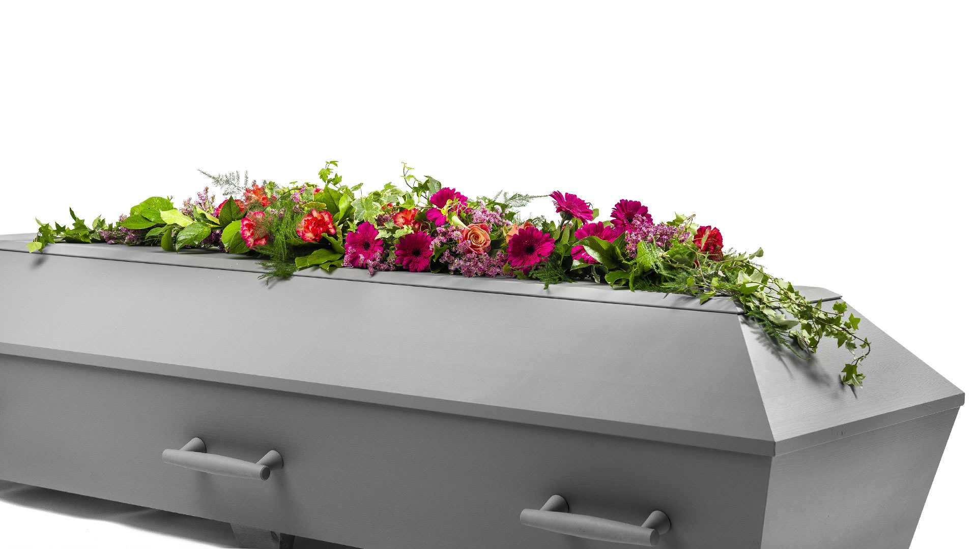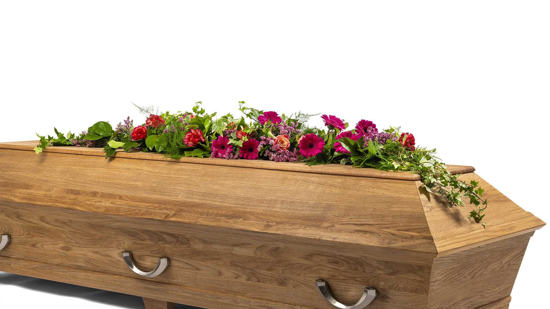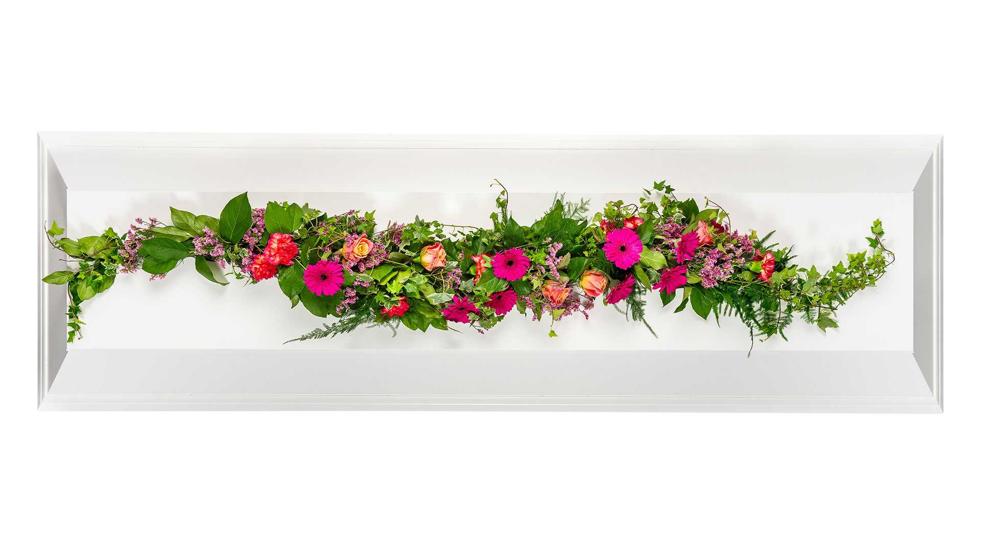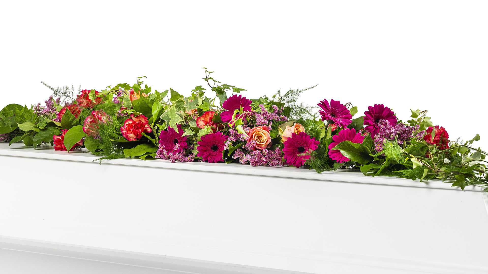 En låg kistdekoration med blommor i toner av cerise och aprikos som slingrar sig över kistan i en mjuk form. Denna dekoration är bunden som en girlang, enbart på sina egna stjälkar.Längd: ca 160 cm
