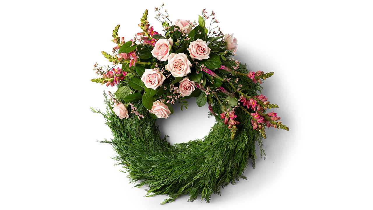En klassisk krans med rosa rosor och blandade blommor i samma färgskala.Format: Ø Mindre krans med färre blommor, stomme ca 55 cm (på bilden).