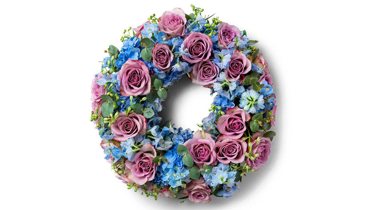 En krans med lila rosor och blålila riddarsporrar.Denna krans kan även användas som urndekoration.