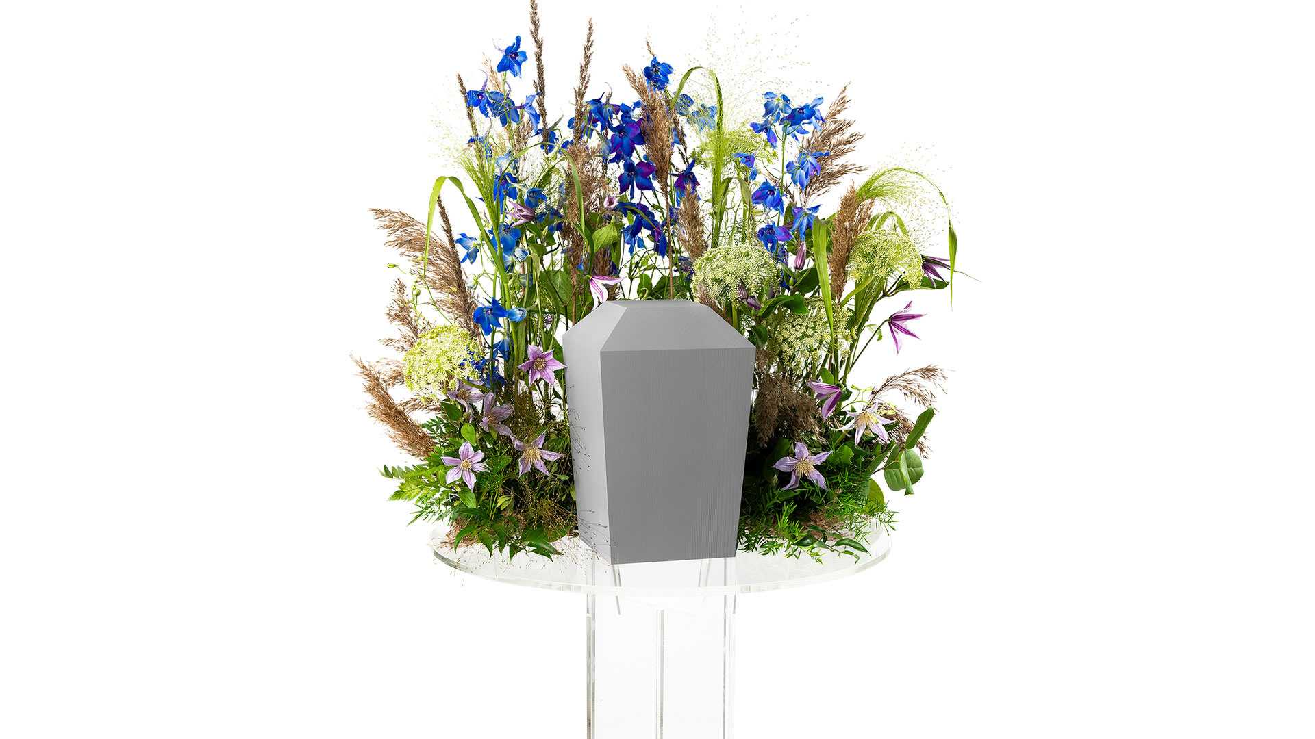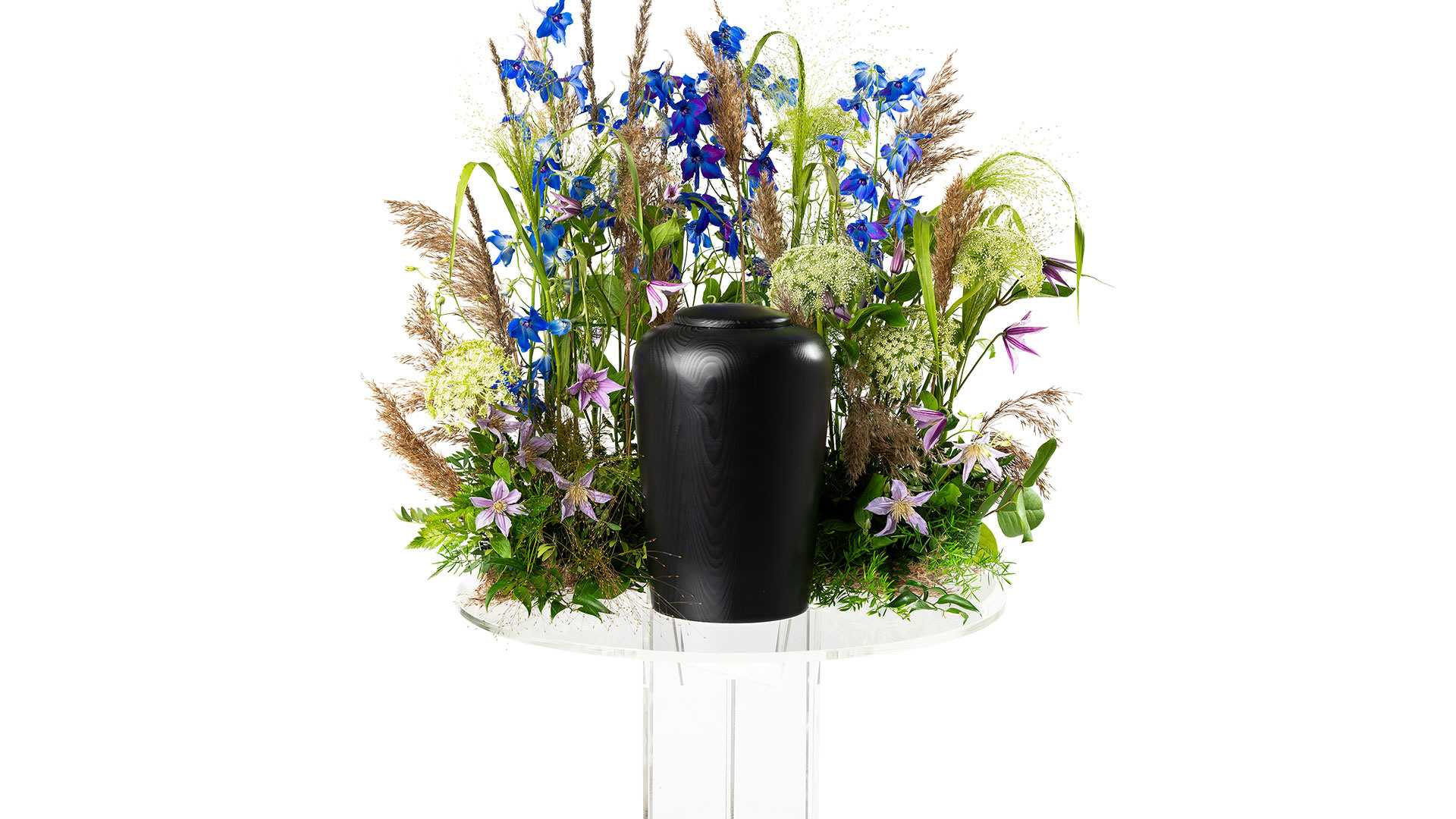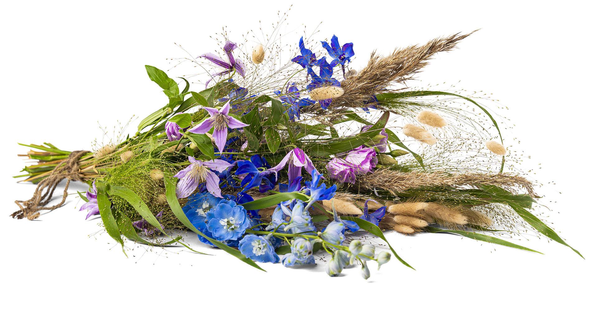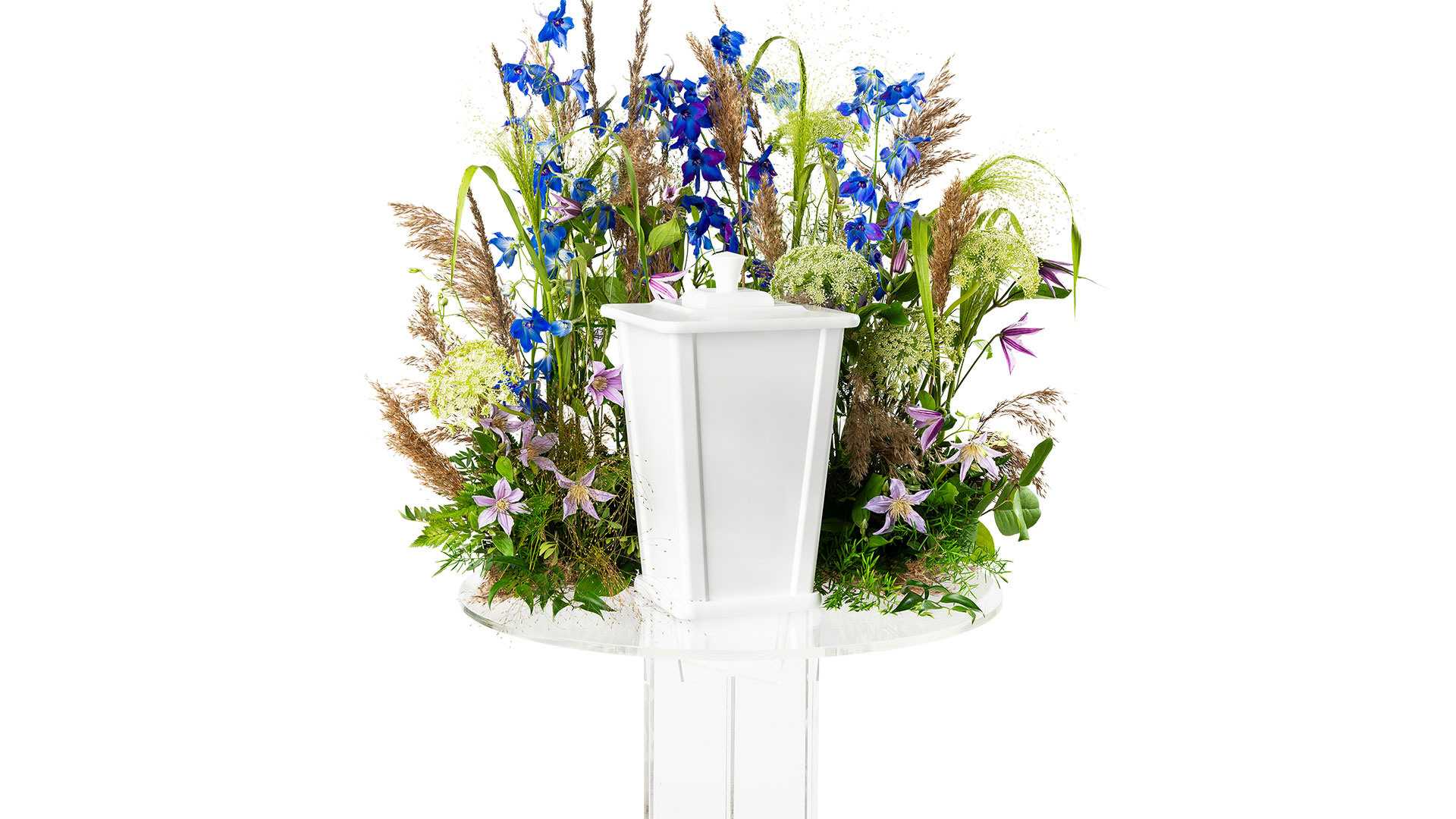 En omfamnande urndekoration i blålila och grönt inspirerad av hav och strand.Bredd: ca 45 cm