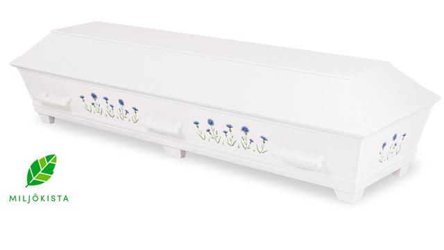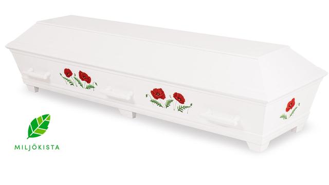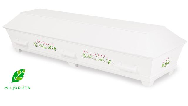 I vårt sortiment har vi kistor märkta med en speciell symbol: ett grönt löv. Vi kallar dessa kistor för Miljökistor och de är speciellt framtagna för att vara skonsammare mot miljön. De är framtagna utifrån en helhetssyn som inkluderar medvetna val av trä, textil, färg och lim, samt att mängden metaller hålls till ett minimum. Läs mer om våra Miljökistor här.