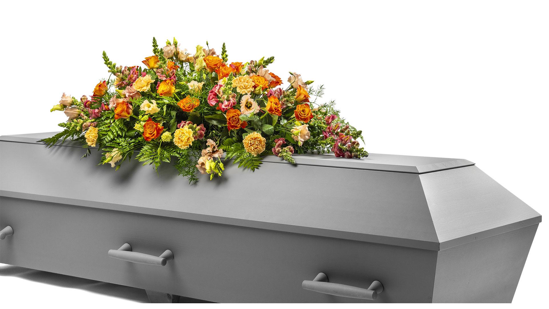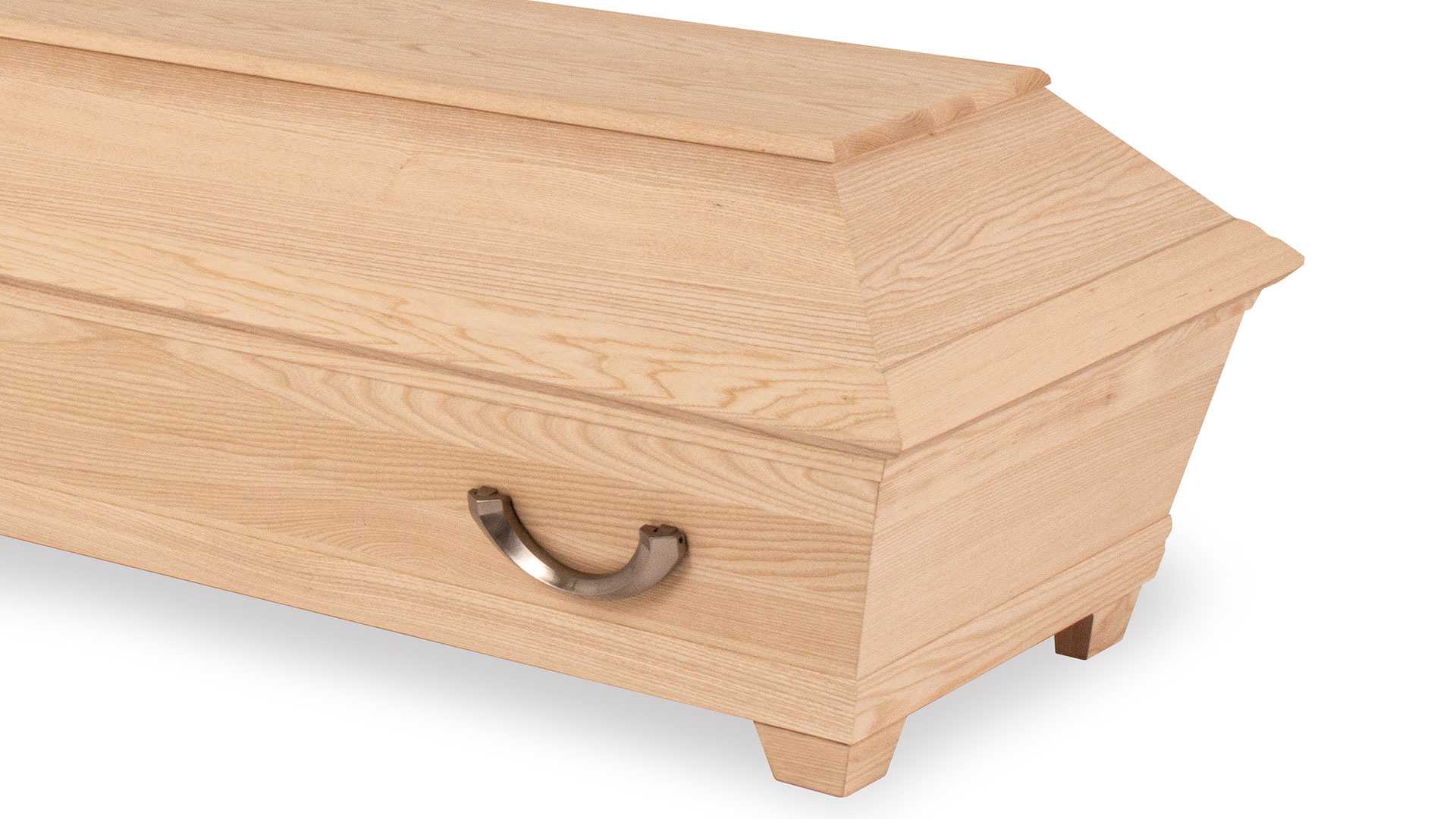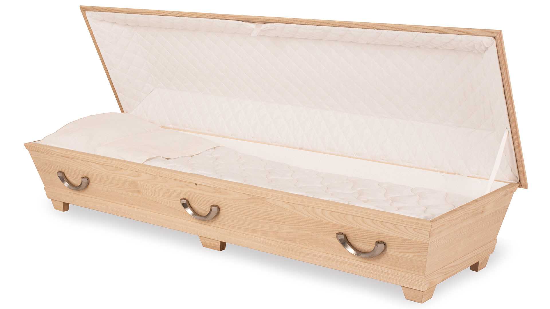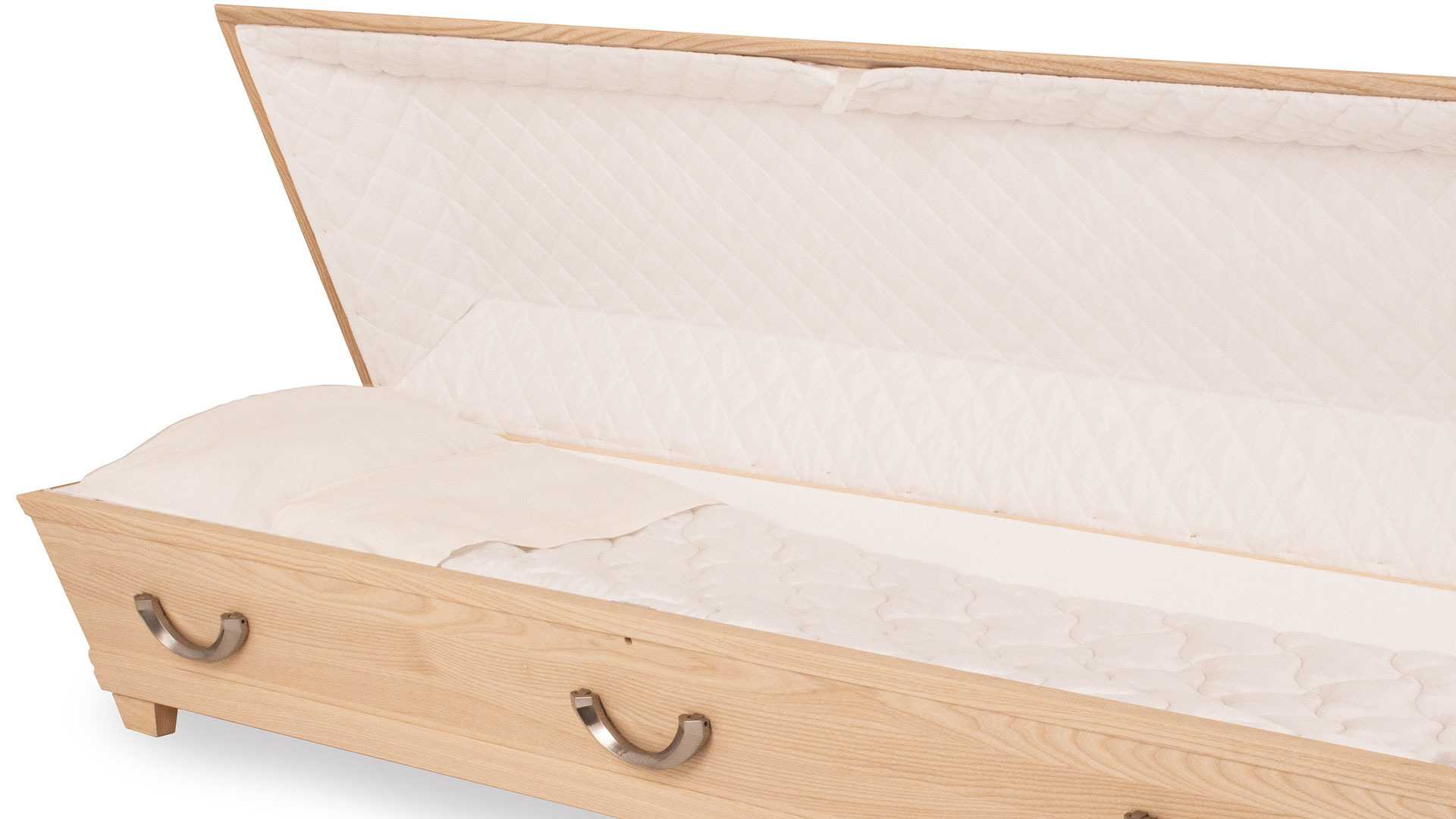 Kista Elegant tillverkad av massiv ask, med handtag av metall. Denna variant är mattlackerad. Inredningen består av en vadderad bädd, klädda sidor, kudde och mjukt, vadderat täcke med lakansflik. Textilierna är av 100 % återvunnen polyester. Lockets insida är klätt med mjukt, vitt tyg. Kistan finns även i en större storlek.29 995 kr