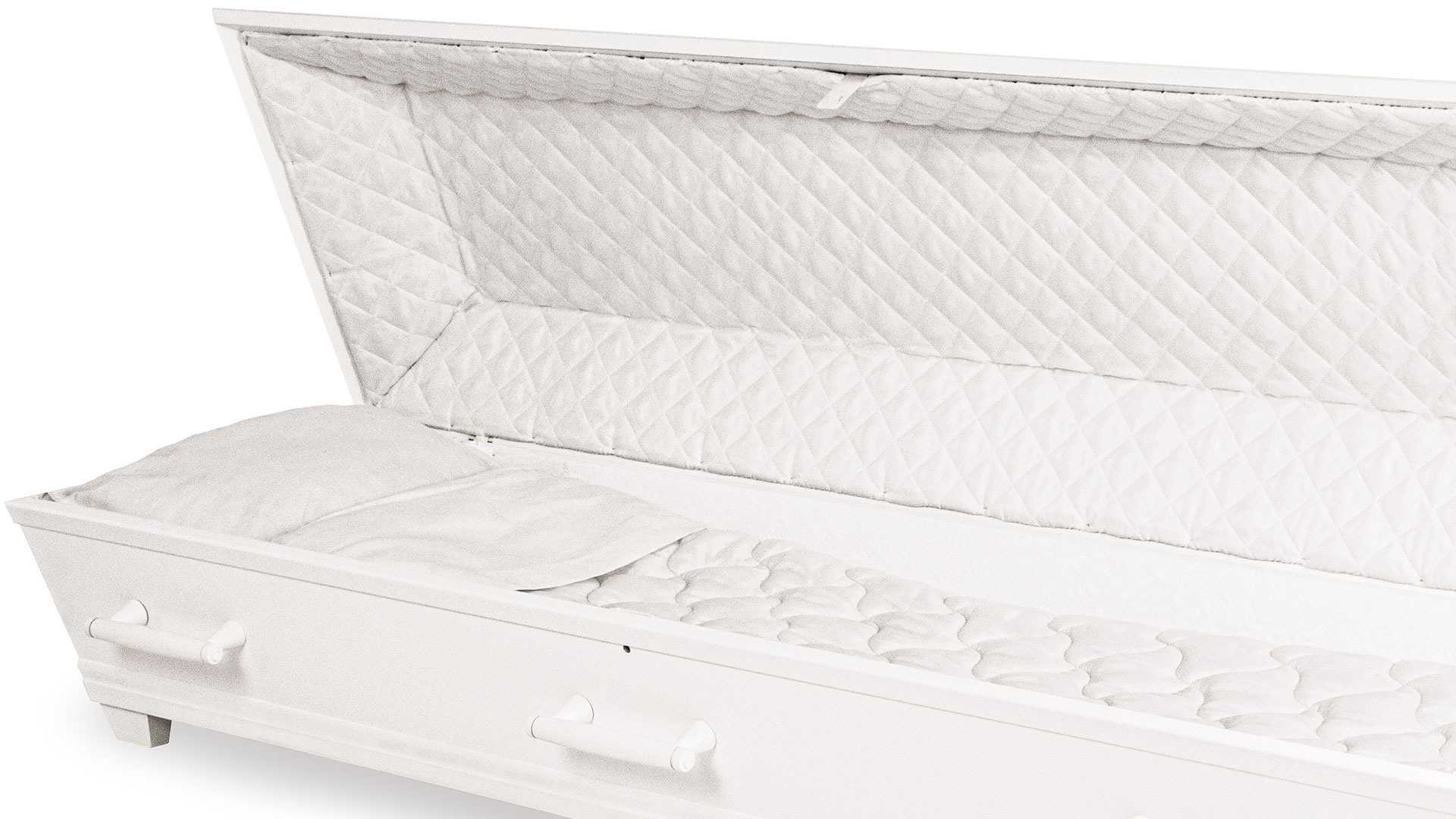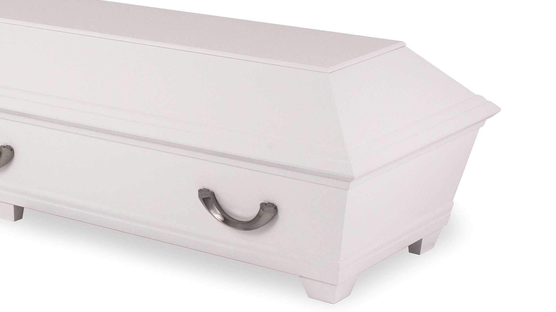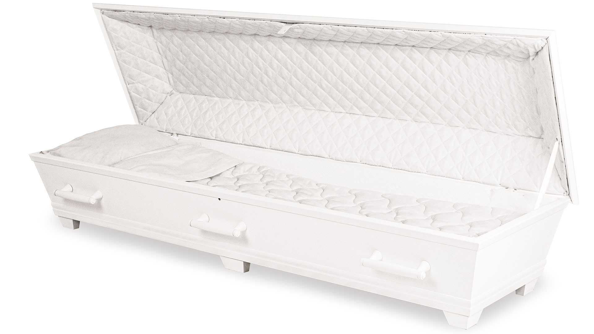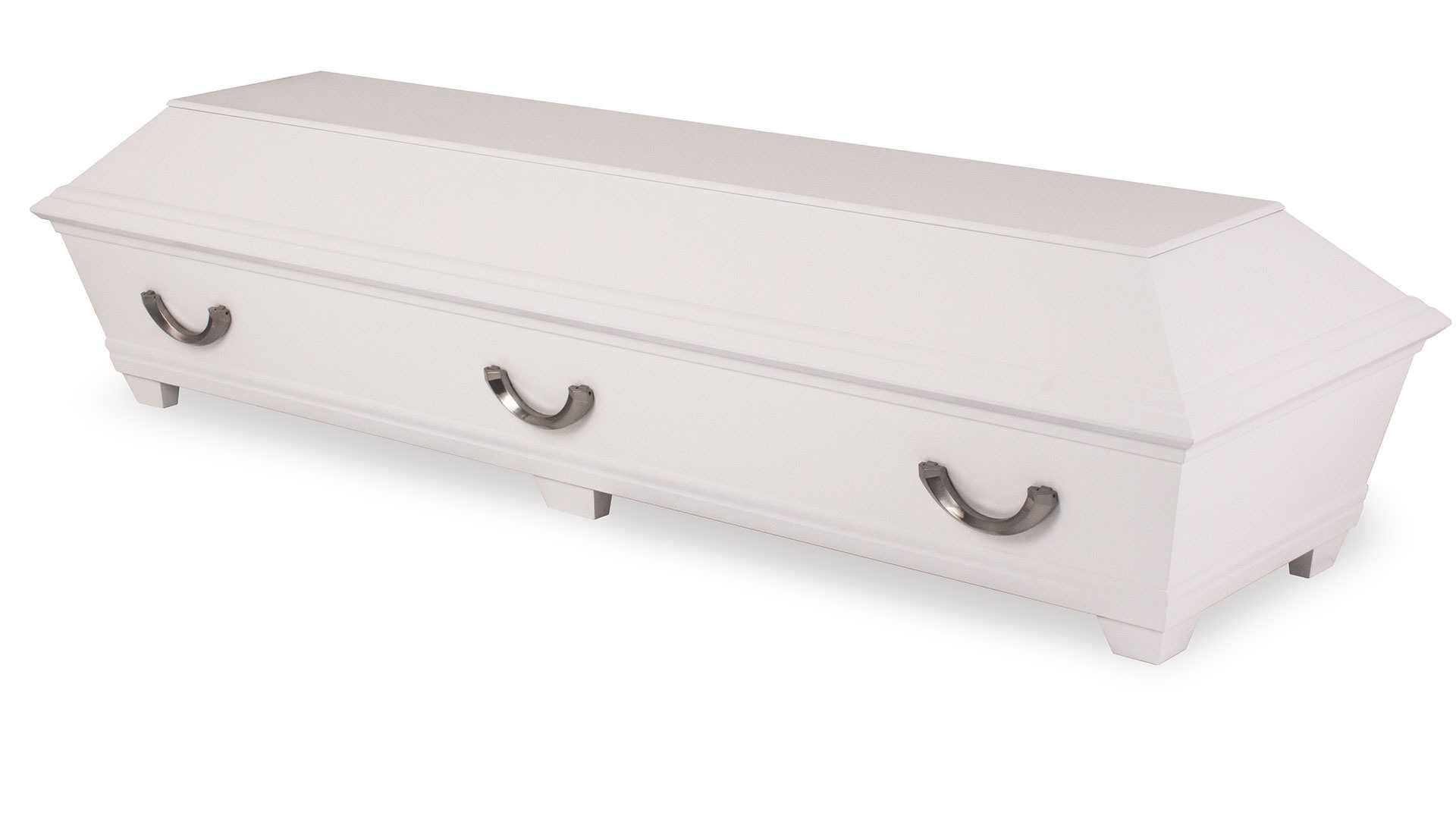 Kista Elegant tillverkad av möbelskiva, med handtag av metall. Denna variant är målad i en sidenmatt vit kulör. Inredningen består av en vadderad bädd, klädda sidor, kudde och mjukt, vadderat täcke med lakansflik. Textilierna är av 100 % återvunnen polyester. Lockets insida är klätt med mjukt, vitt tyg. Kistan finns även i större storlekar (mot pristillägg).10 395 kr