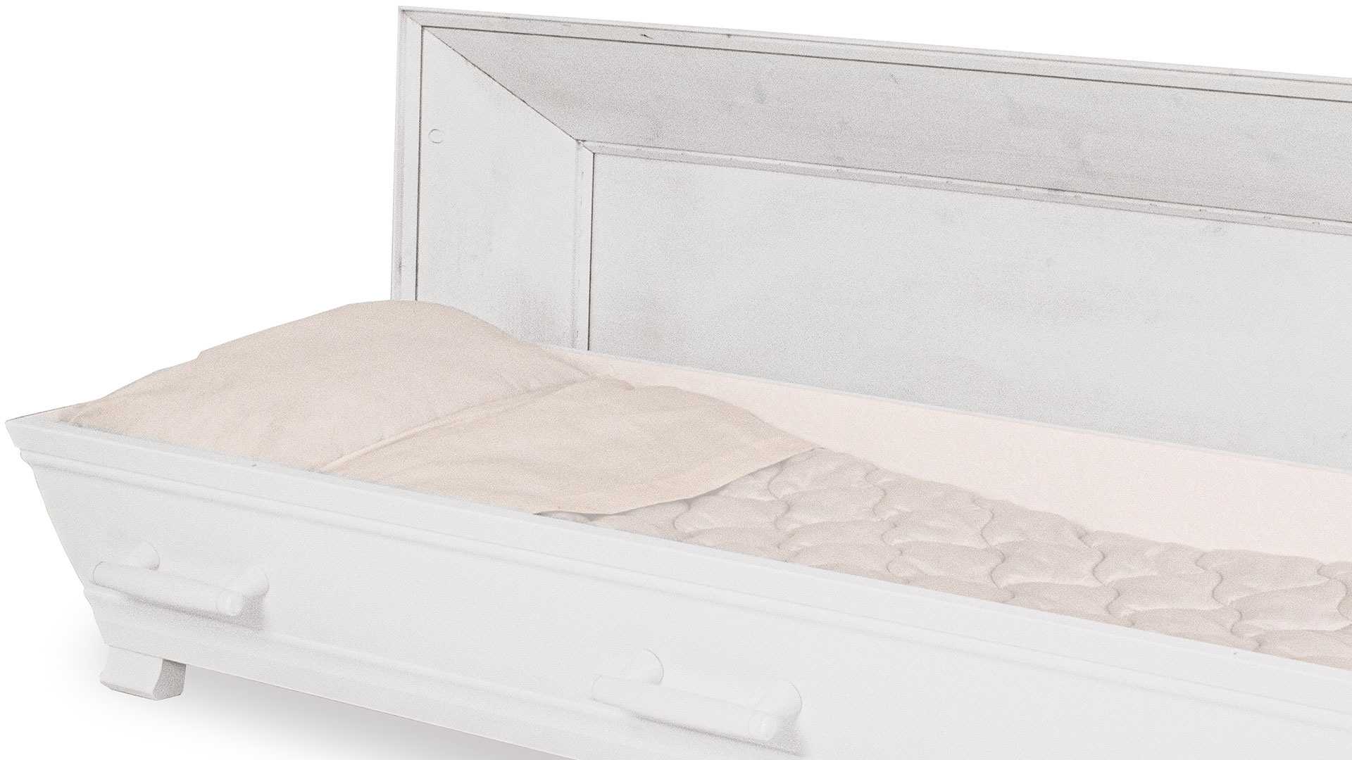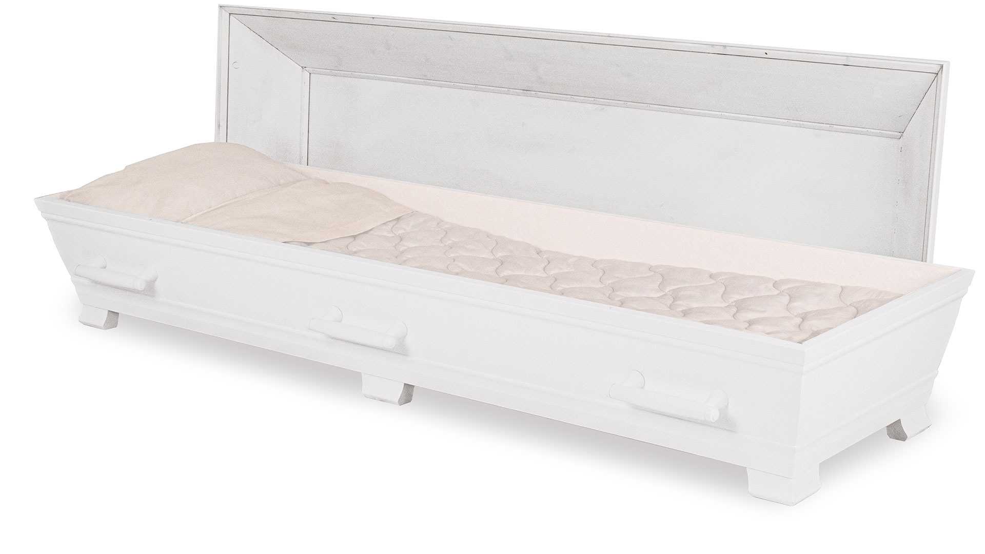 Klassisk är en kista tillverkad av massiv svensk furu. Denna variant är vitmålad. Inredningen består av en vadderad bädd, klädda sidor, kudde och mjukt, vadderat täcke med lakansflik. Textilierna är av BCI-certifierad bomull. Lockets insida är oinrett. Kistan finns även i större storlekar (mot pristillägg).9 895 kr