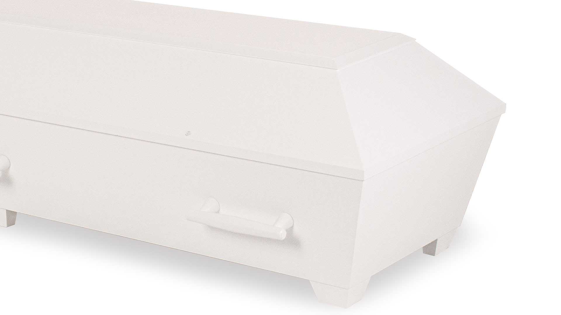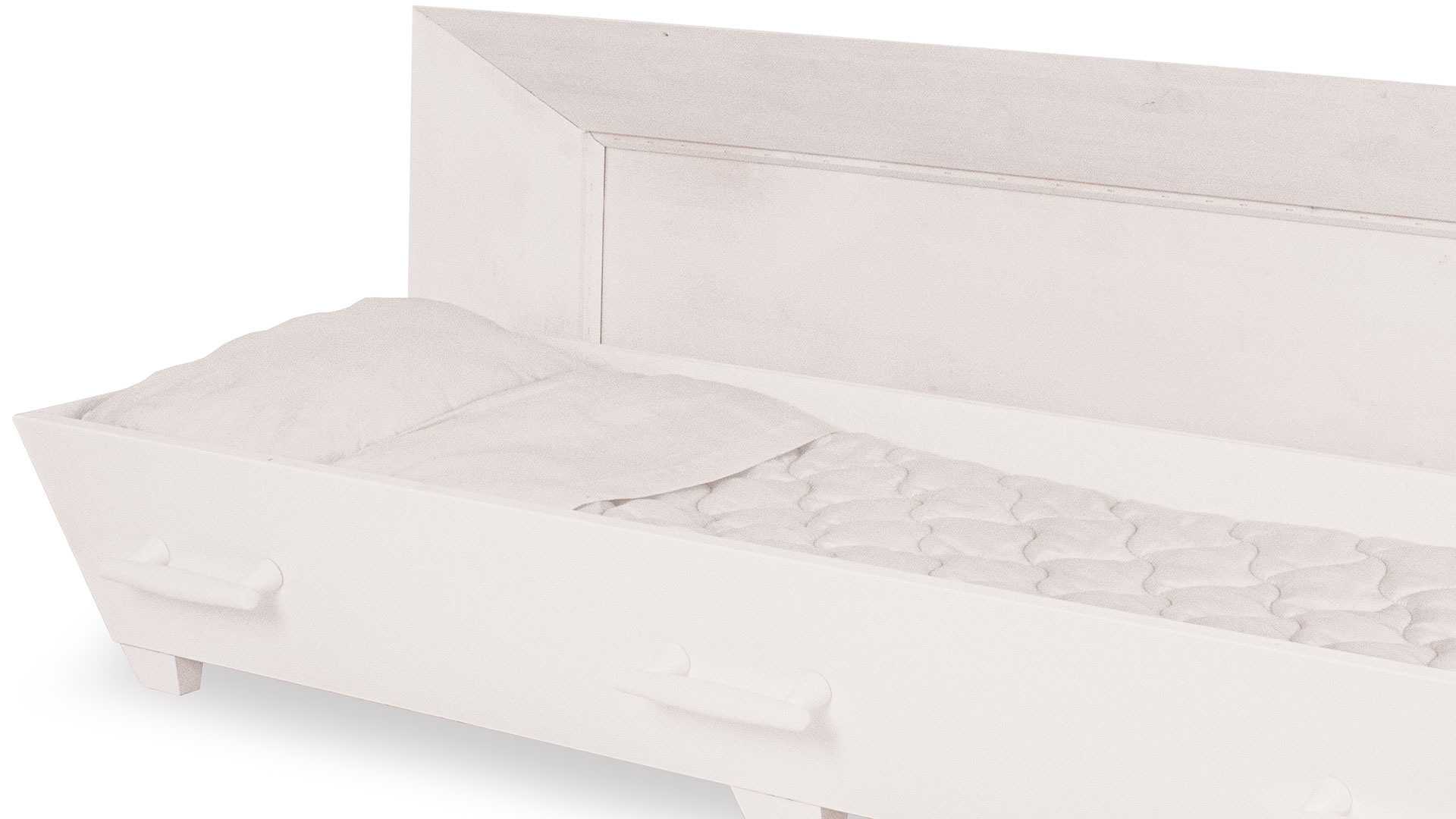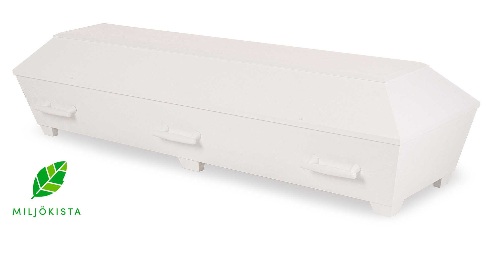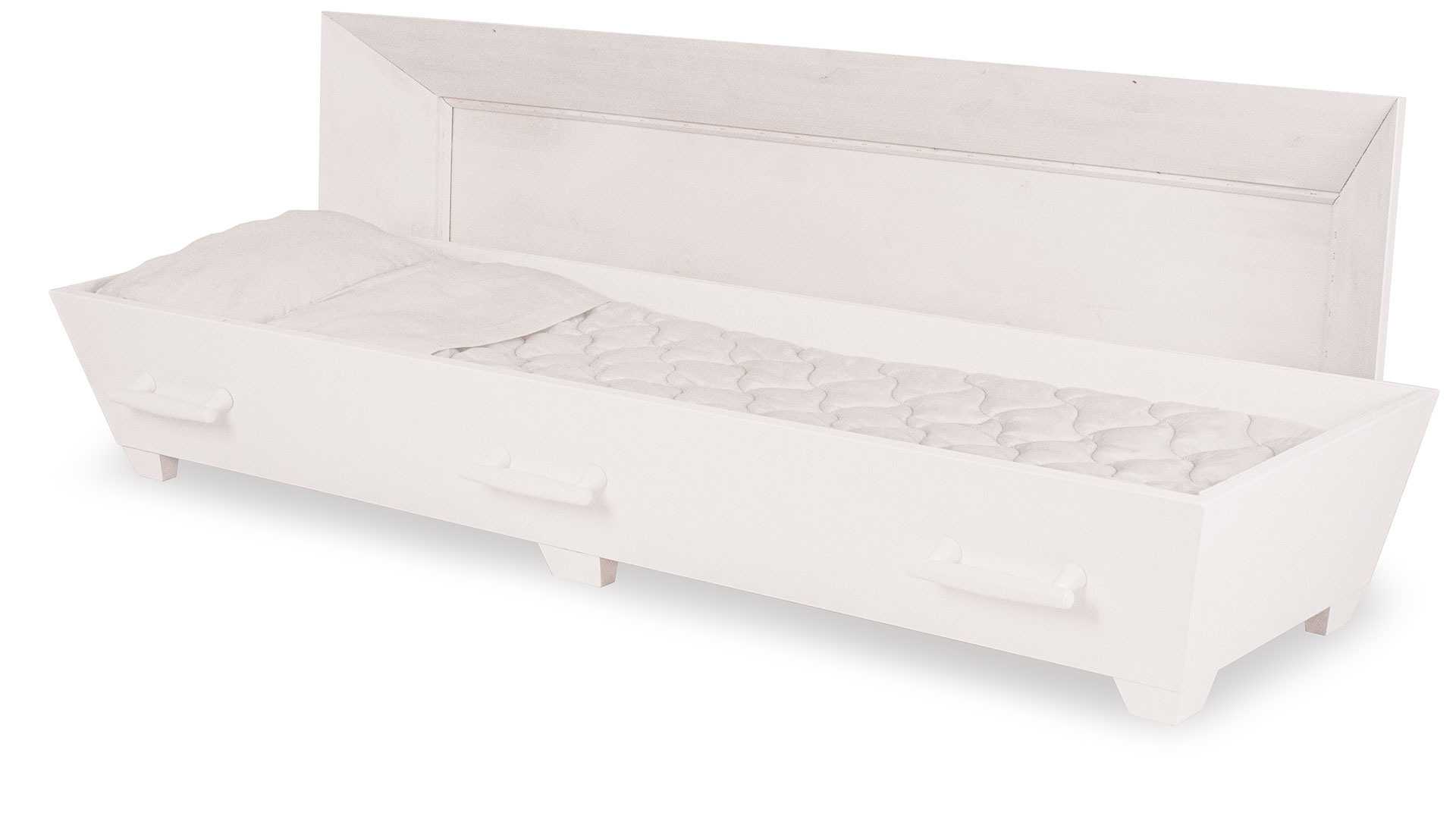 Modern är en kista tillverkad av massiv svensk furu. Denna variant är vitmålad. Inredningen består av en vadderad bädd, klädda sidor, kudde och mjukt, vadderat täcke med lakansflik. Textilierna är av BCI-certifierad bomull. Lockets insida är oinrett. Kistan finns även i större storlekar (mot pristillägg).9 895 kr