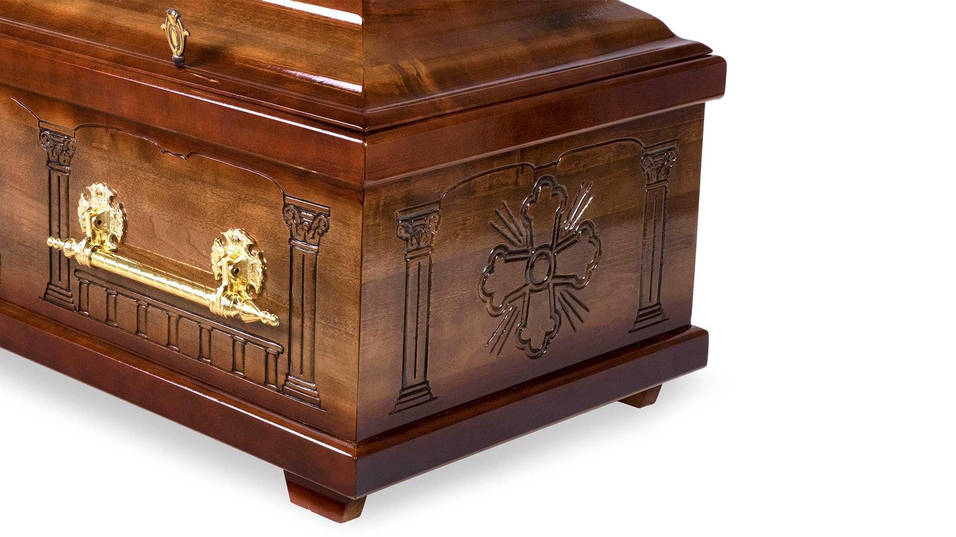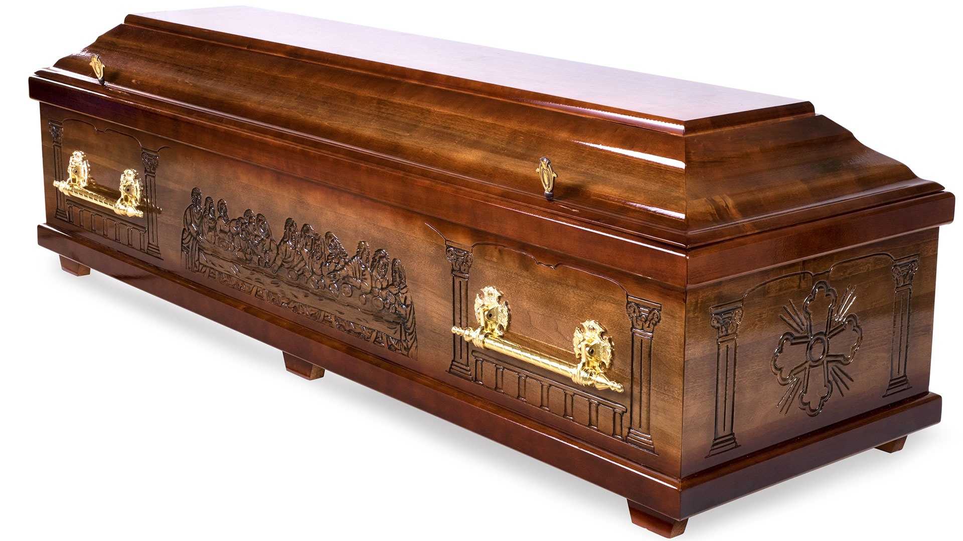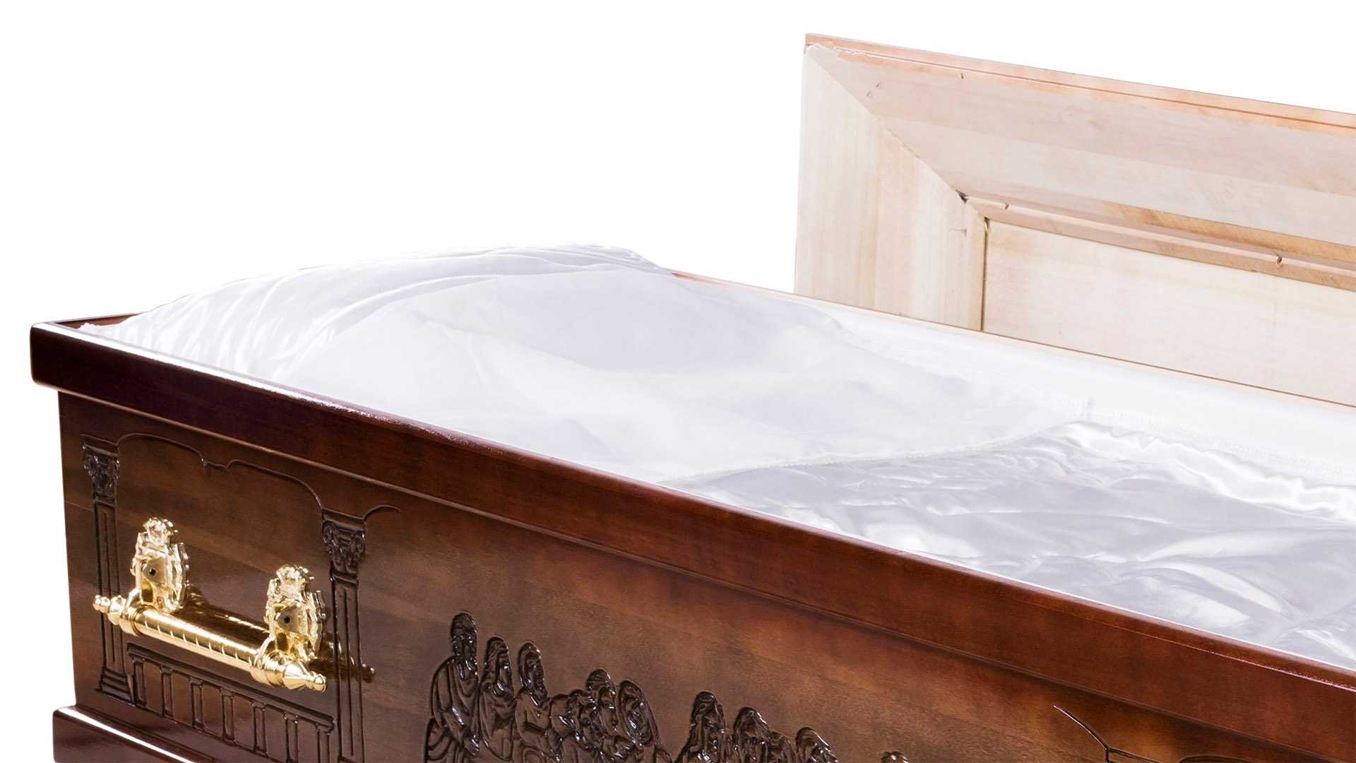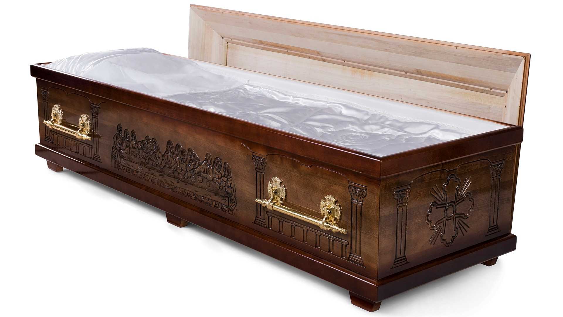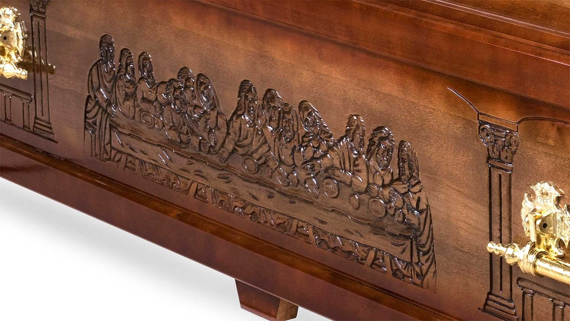 Nattvarden är en exklusiv ortodox kista av poppel. Den är brunbetsad och sidor och gavel är dekorerade med reliefmönster från Den sista måltiden. Inredd med vadderad bädd, klädda sidor, kudde och mjukt, vadderat täcke i blankt, mönstrat sidentyg. Oinrett lock.12 995 kr