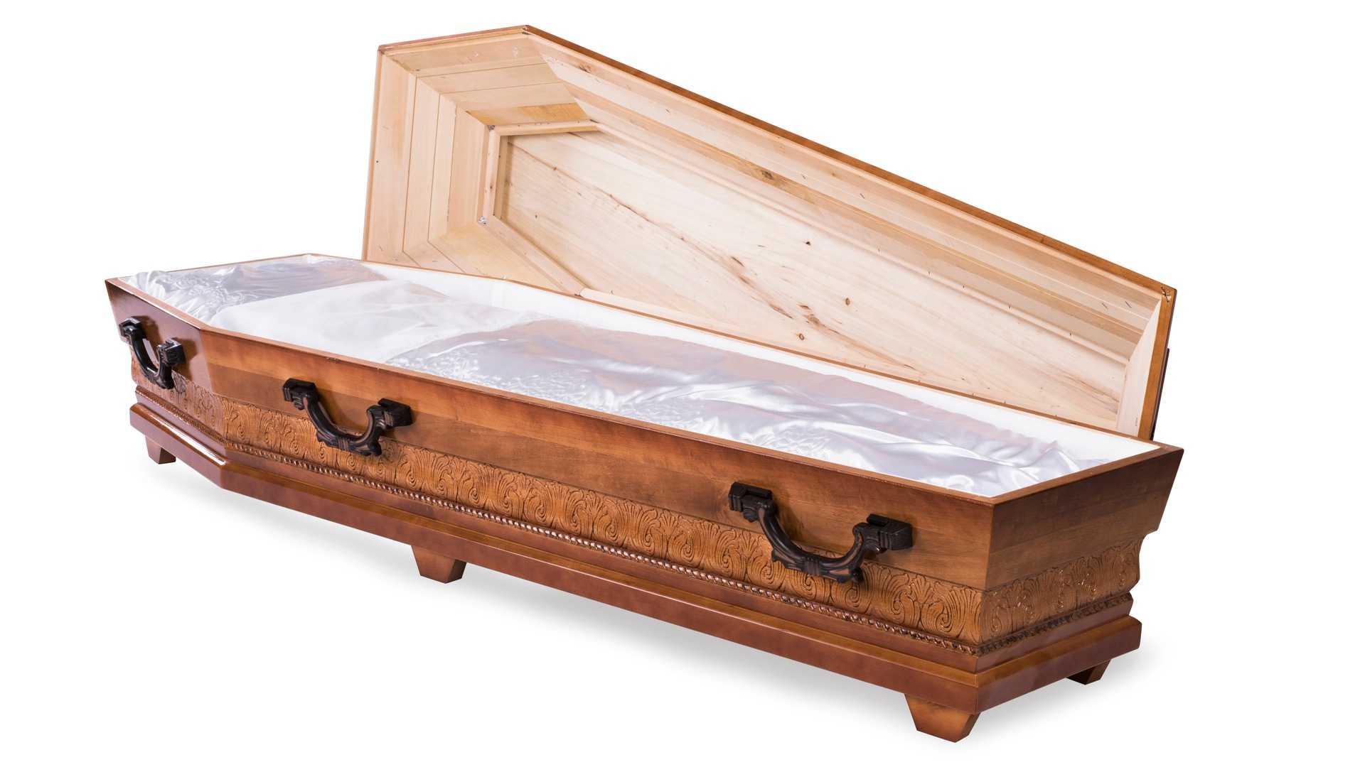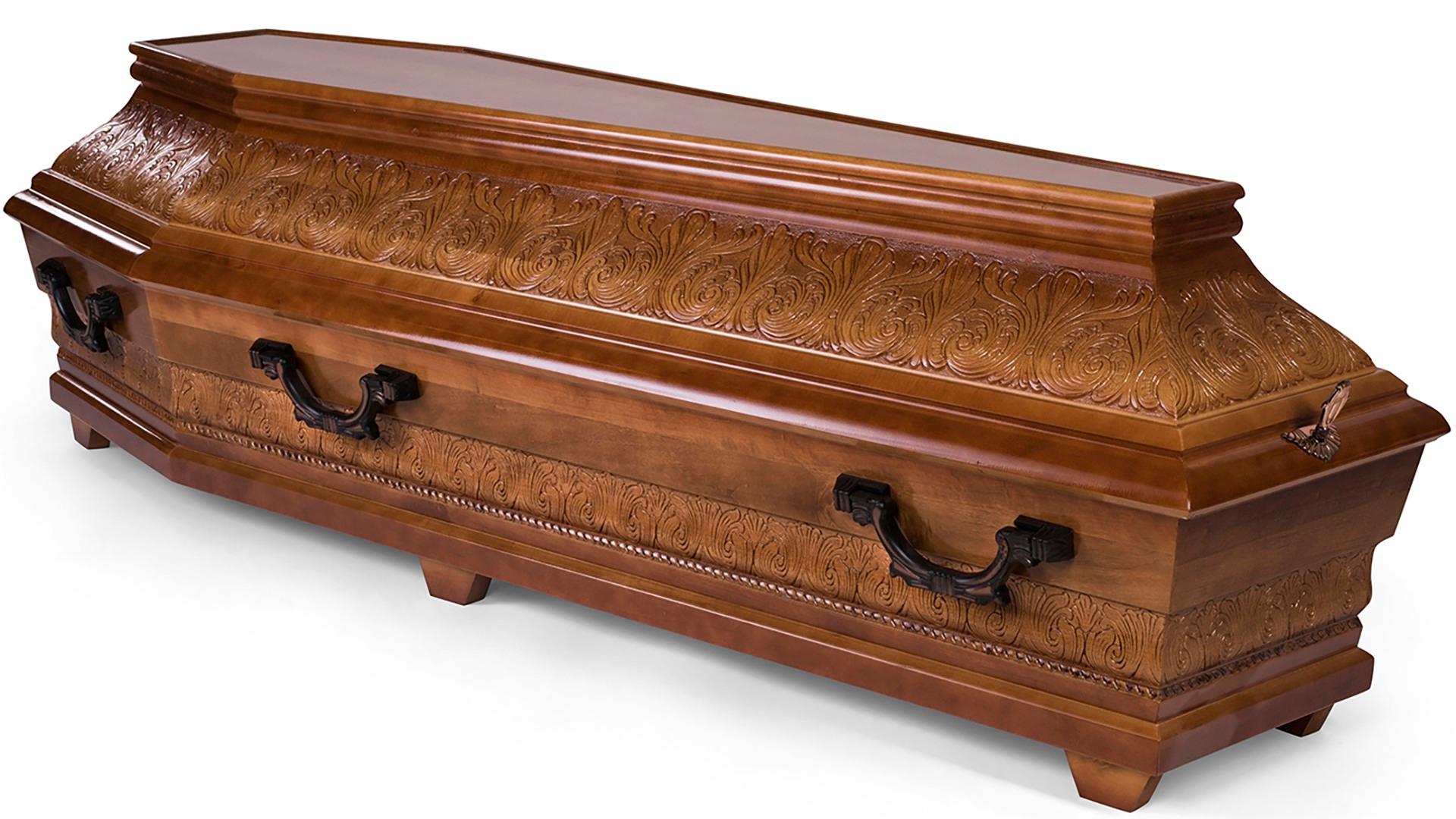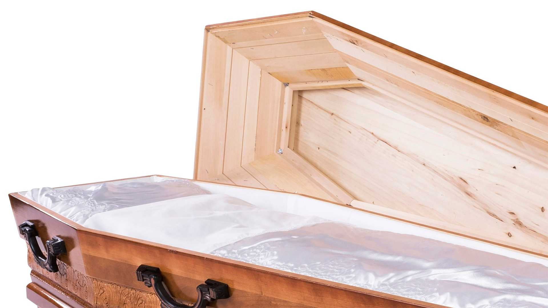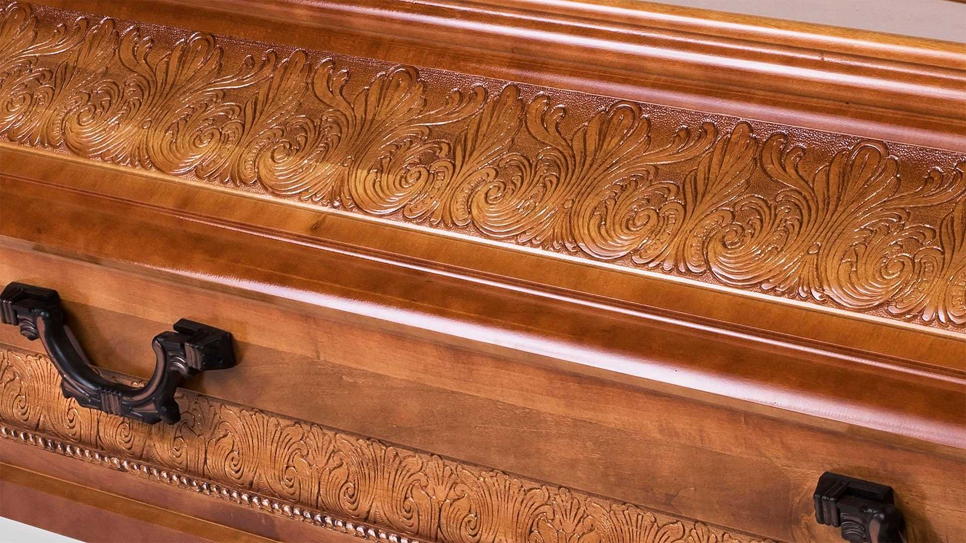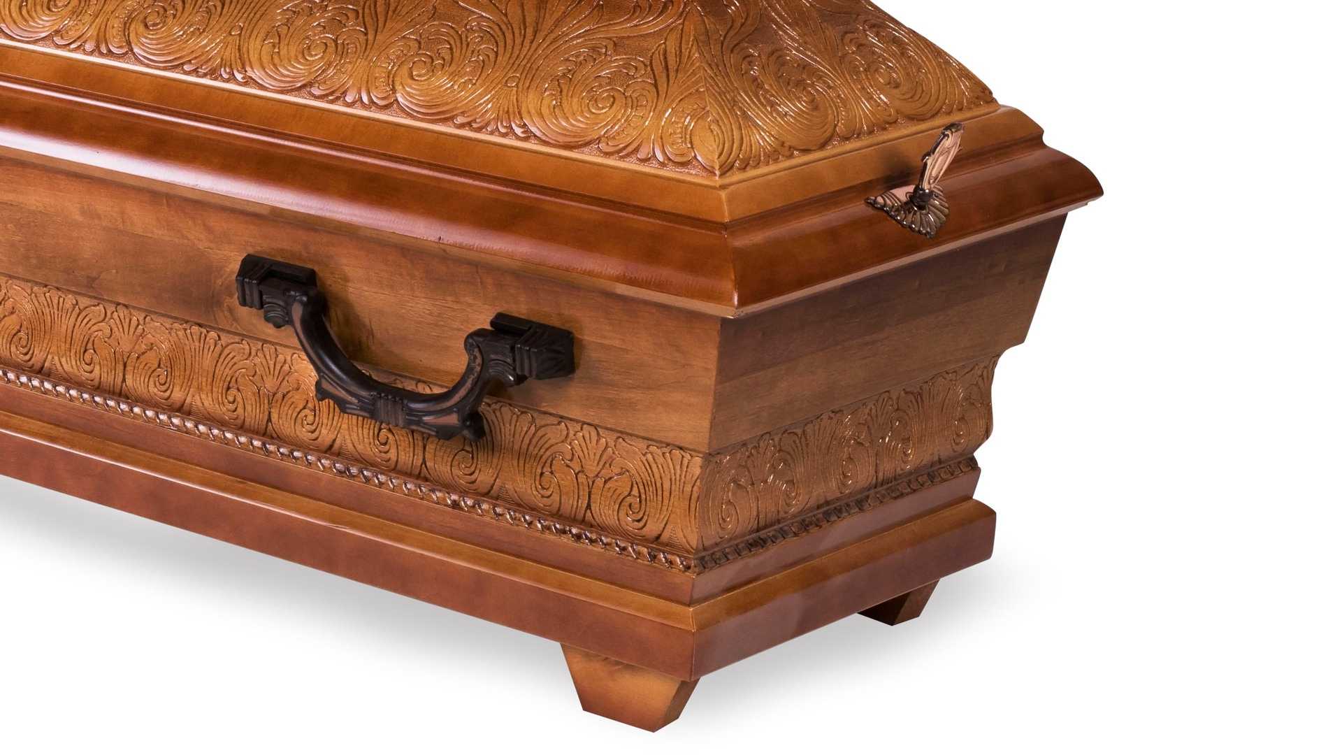 Sirlig är en exklusiv ortodox kista av poppel för jordbegravningar. Den är brunbetsad på ett sätt som framhäver mönstret och detaljerna. Inredd med en vadderad bädd, klädda sidor, kudde och ett mjukt, vadderat täcke i blankt, mönstrat sidentyg. Oinrett lock.11 495 kr