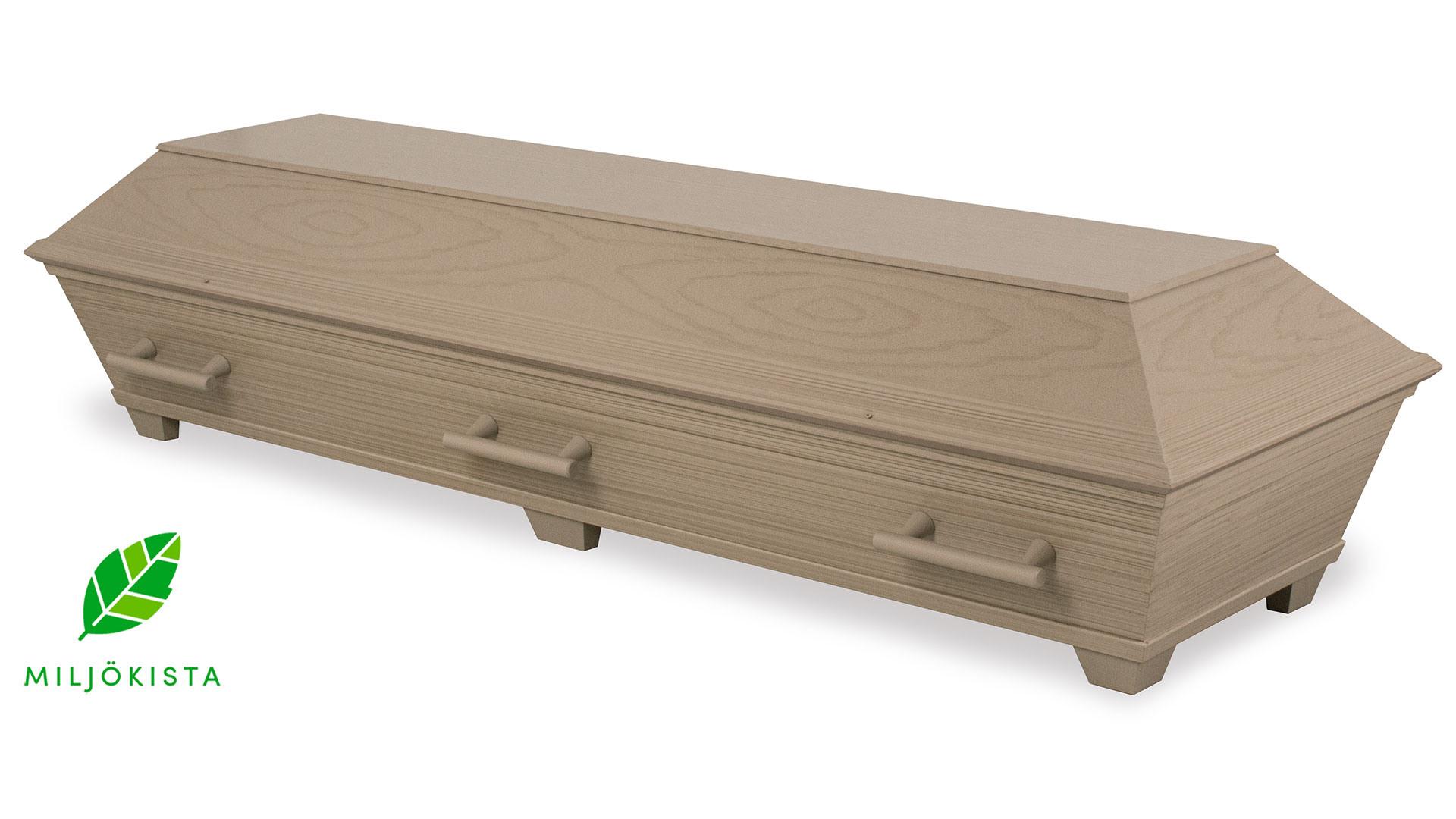 Tidlös är en stilren miljökista tillverkad av möbelskiva. Denna variant är ådringsmålad i en ljusbrun kulör. Inredningen består av en vadderad bädd, klädda sidor, kudde och mjukt, vadderat täcke med lakansflik. Textilierna är av 100 % återvunnen polyester. Lockets insida är oinrett. Kistan finns även i större storlekar (mot pristillägg).9 195 kr