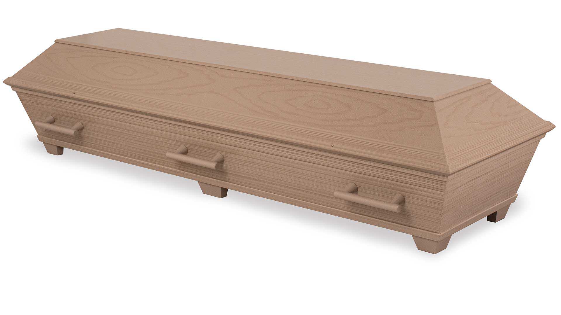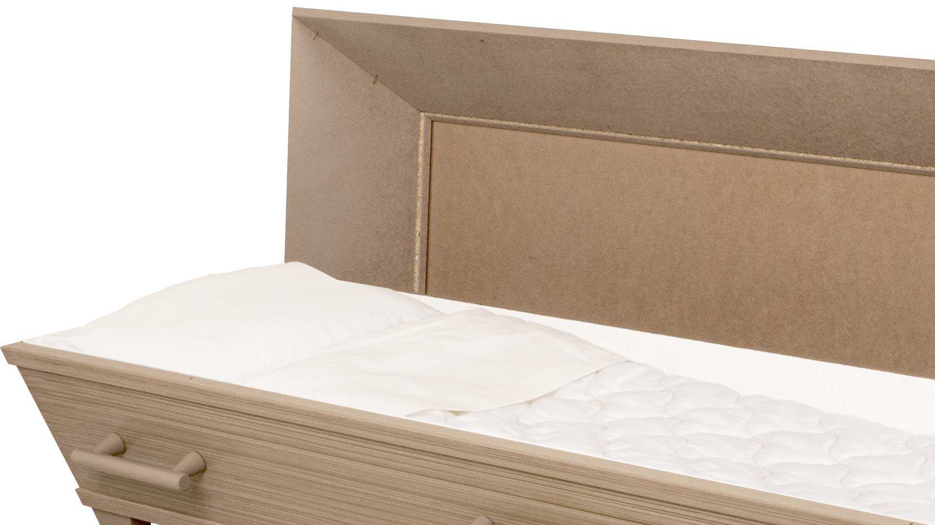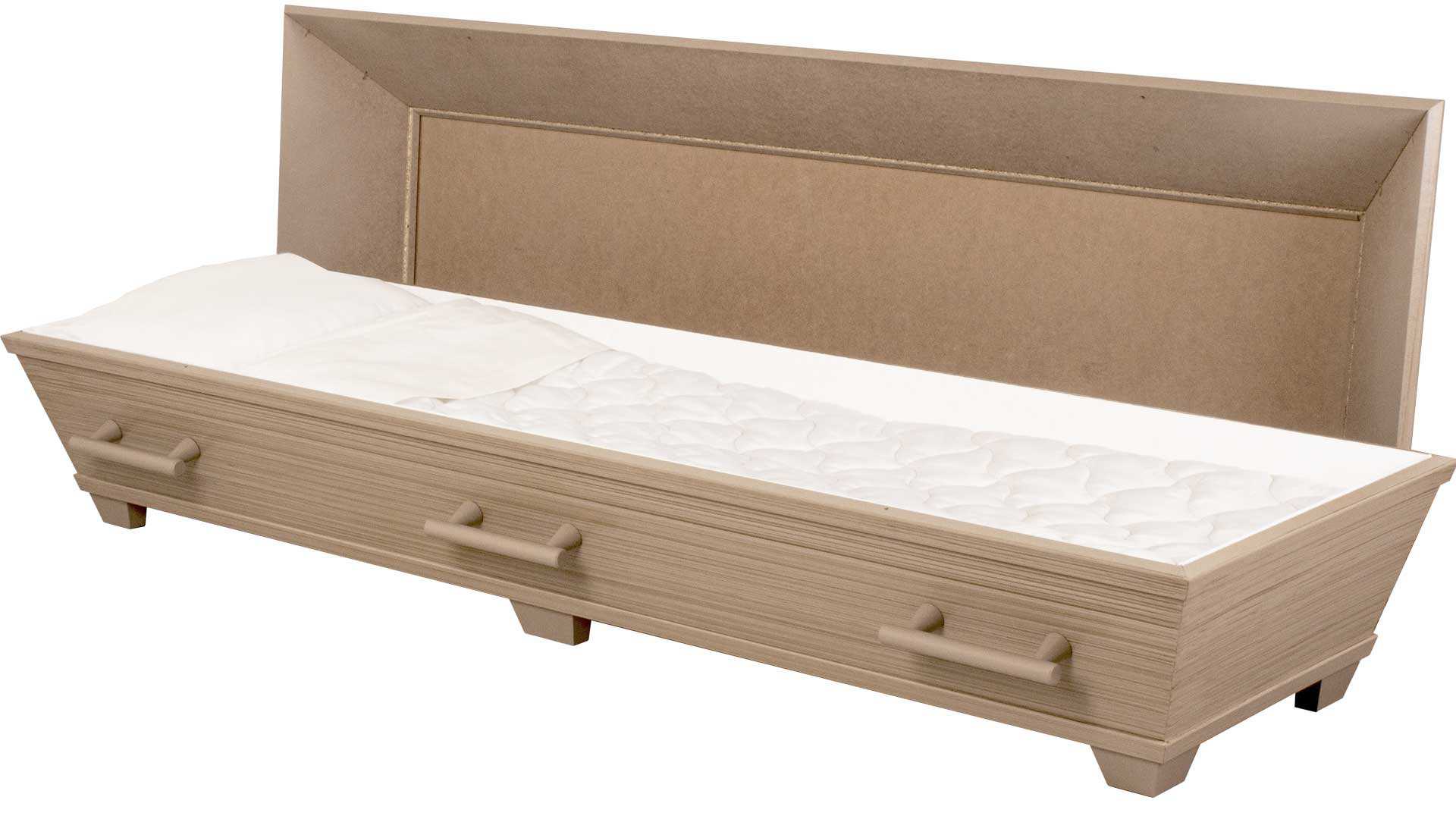 Tidlös är en stilren miljökista tillverkad av möbelskiva. Denna variant är ådringsmålad i en ljusbrun kulör. Inredningen består av en vadderad bädd, klädda sidor, kudde och mjukt, vadderat täcke med lakansflik. Textilierna är av 100 % återvunnen polyester. Lockets insida är oinrett. Kistan finns även i större storlekar (mot pristillägg).