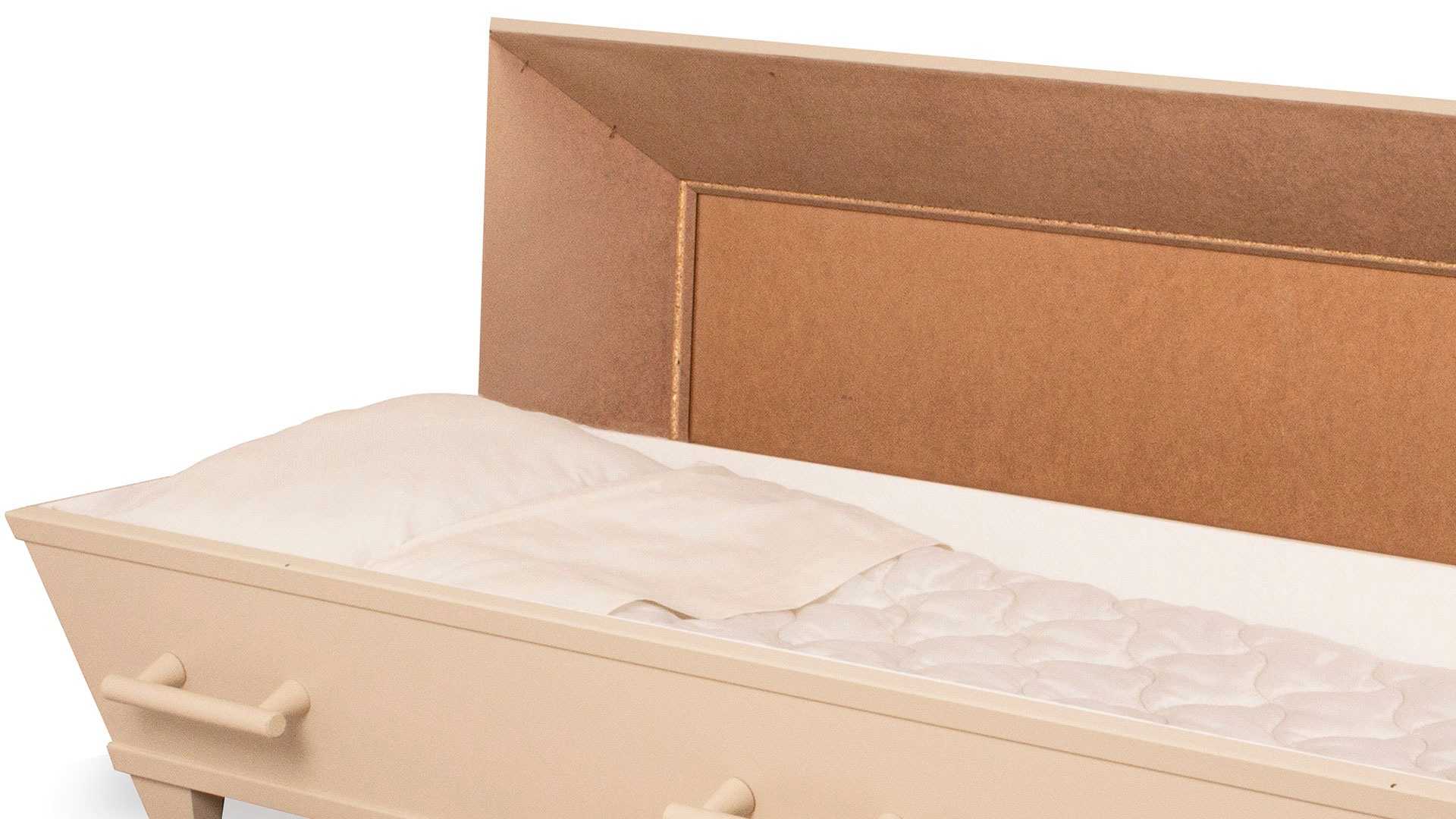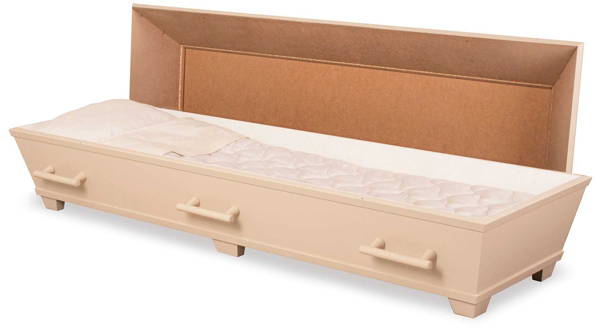 Tidlös är en stilren miljökista tillverkad av möbelskiva. Denna variant är målad i en ljust sandfärgad kulör. Inredningen består av en vadderad bädd, klädda sidor, kudde och mjukt, vadderat täcke med lakansflik. Textilierna är av 100% återvunnen polyester. Lockets insida är oinrett. Kistan finns även i större storlekar (mot pristillägg).7 695 kr