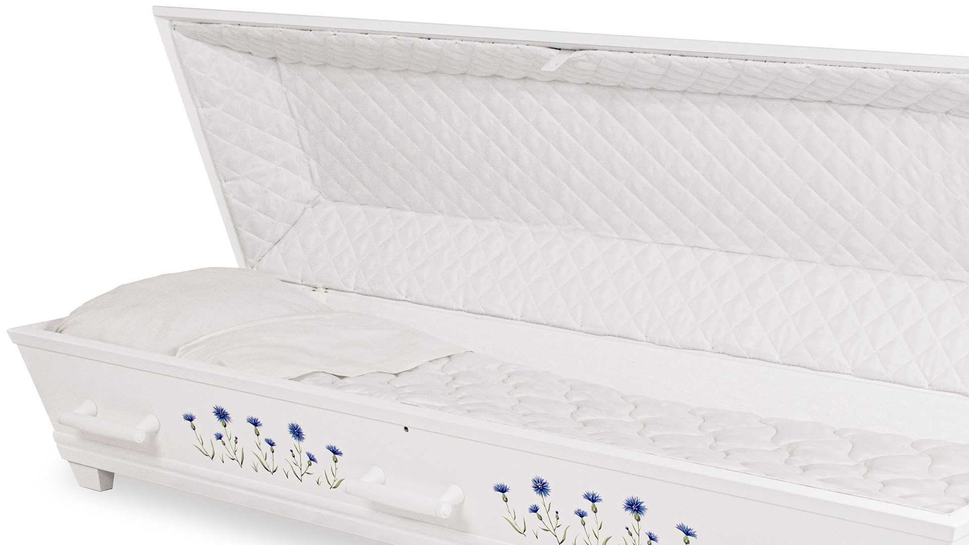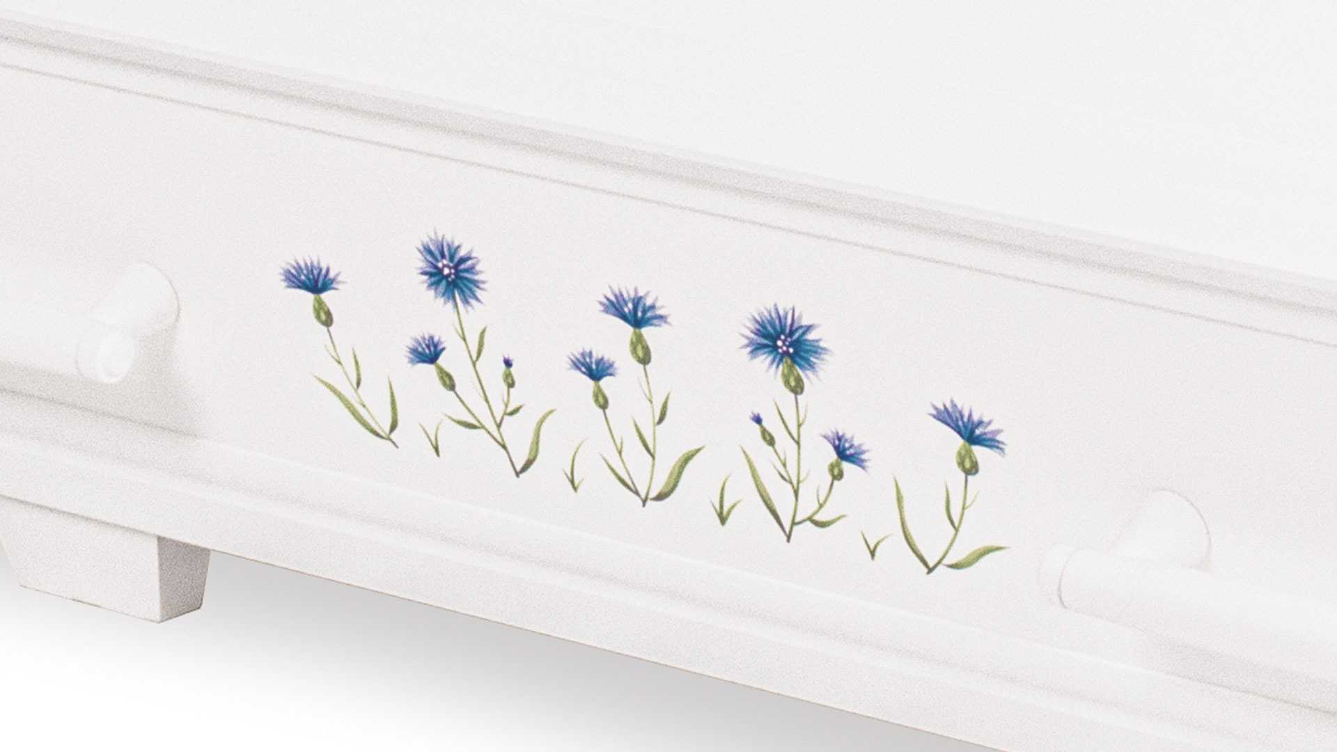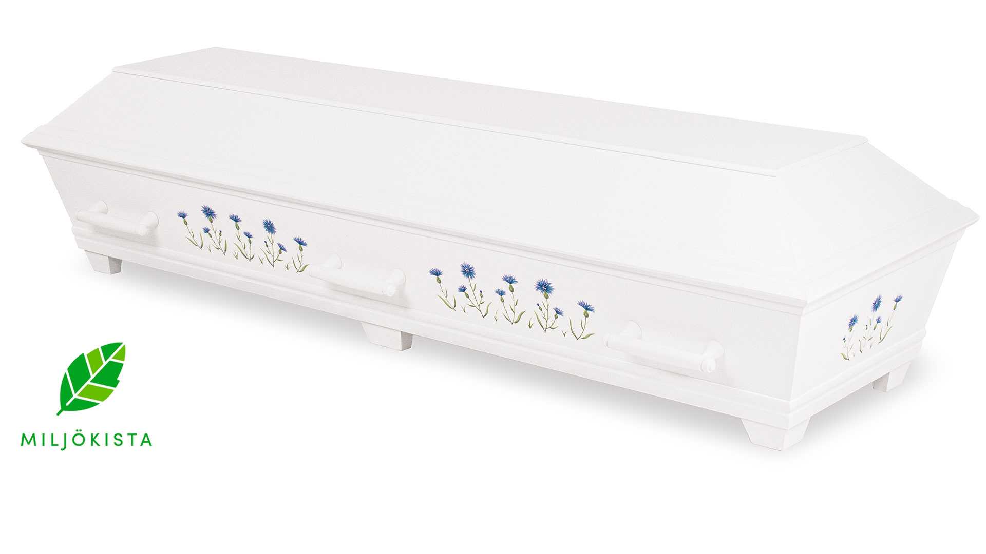 Tradition är en stilfull kista tillverkad av möbelskiva. Denna variant är vitmålad med blåklintsdekor. Inredningen består av en vadderad bädd, klädda sidor, kudde och mjukt, vadderat täcke med lakansflik. Lockets insida är klätt med mjukt, vitt tyg. Textilierna är av 100 % återvunnen polyester. Kistan finns även i en större storlek (mot pristillägg).11 695 kr