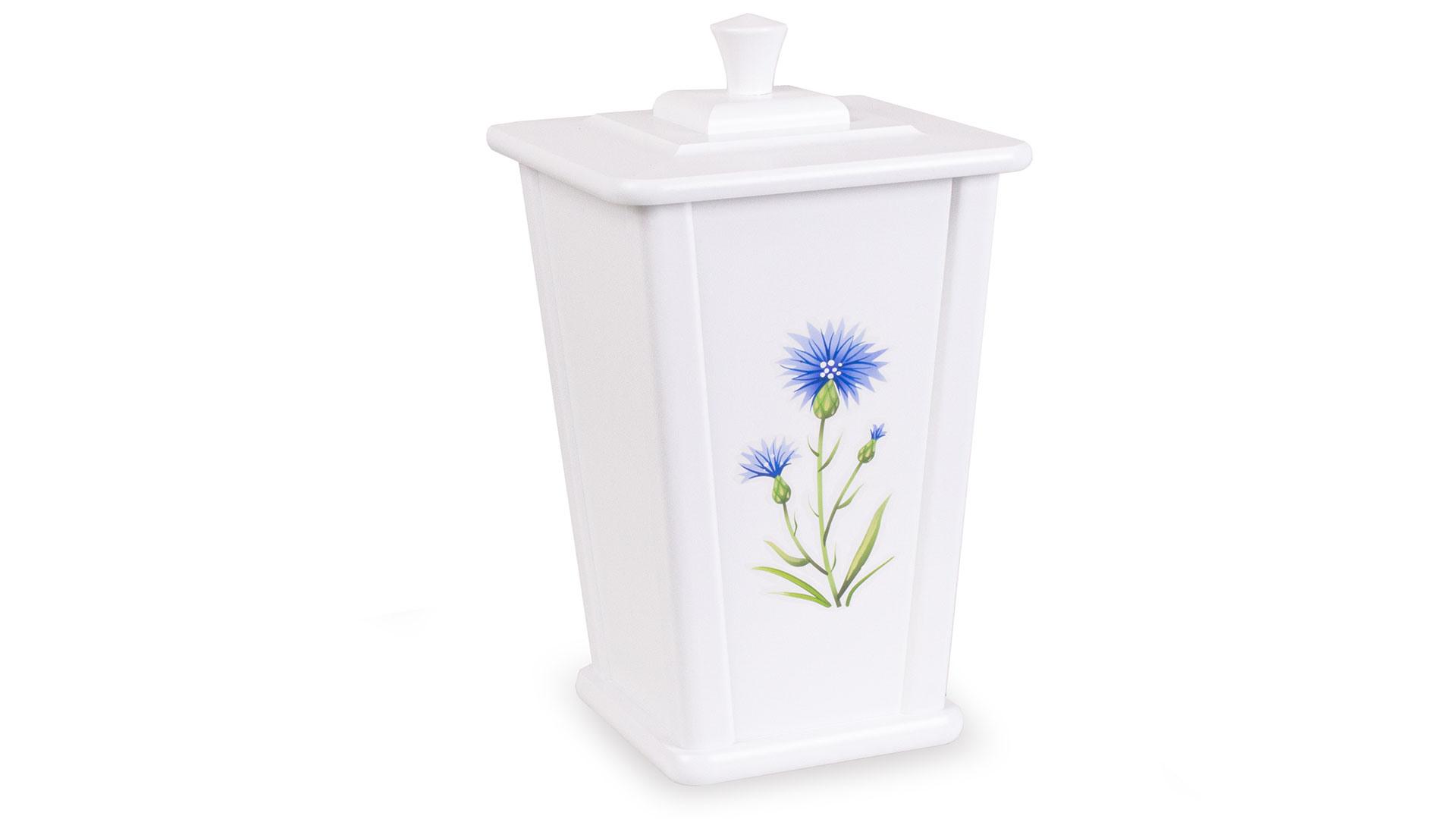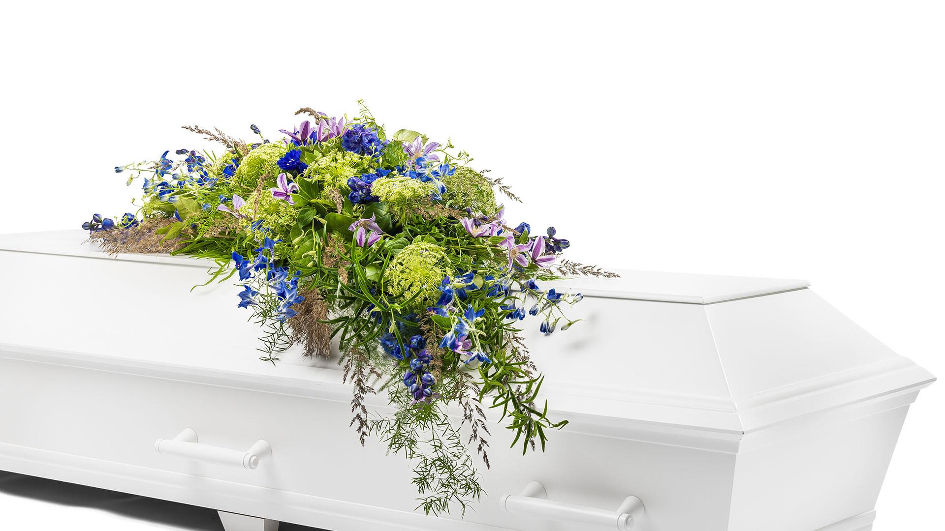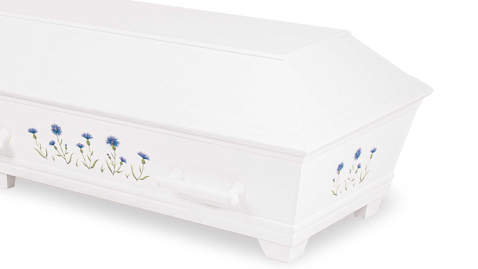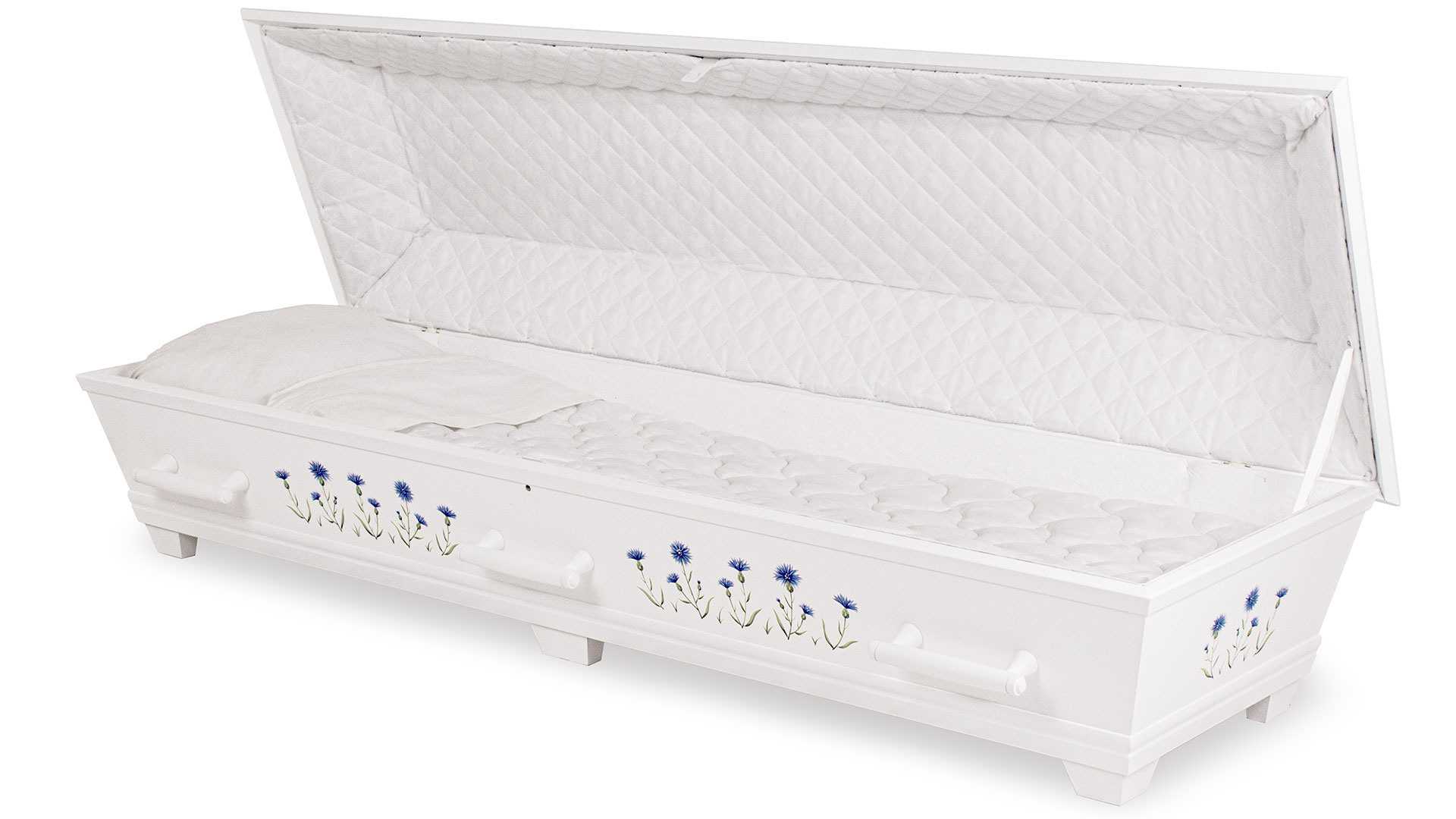 Tradition är en stilfull kista tillverkad av möbelskiva. Denna variant är vitmålad med blåklintsdekor. Inredningen består av en vadderad bädd, klädda sidor, kudde och mjukt, vadderat täcke med lakansflik. Lockets insida är klätt med mjukt, vitt tyg. Textilierna är av 100 % återvunnen polyester. Kistan finns även i en större storlek (mot pristillägg).11 695 kr