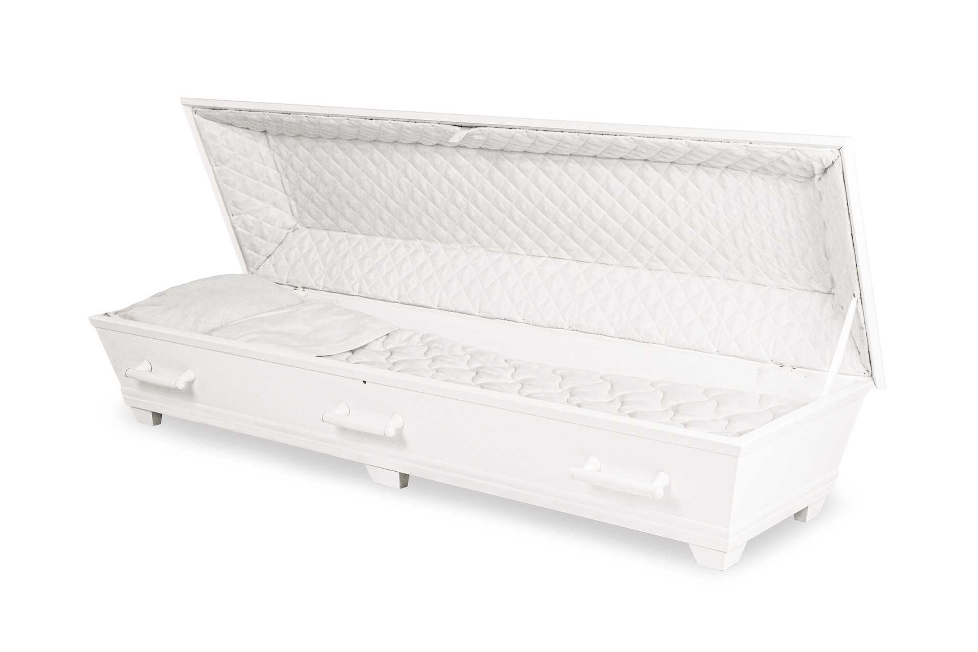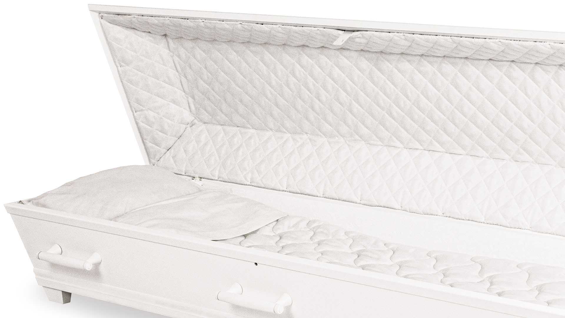 Tradition är en stilfull kista tillverkad av möbelskiva. Denna variant är vitmålad. Inredningen består av en vadderad bädd, klädda sidor, kudde och mjukt, vadderat täcke med lakansflik. Lockets insida är klätt med mjukt, vitt tyg. Textilierna är av 100 % återvunnen polyester. Kistan finns även i större storlekar (mot pristillägg).8 895 kr