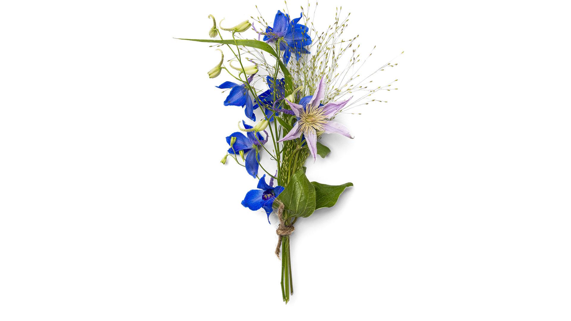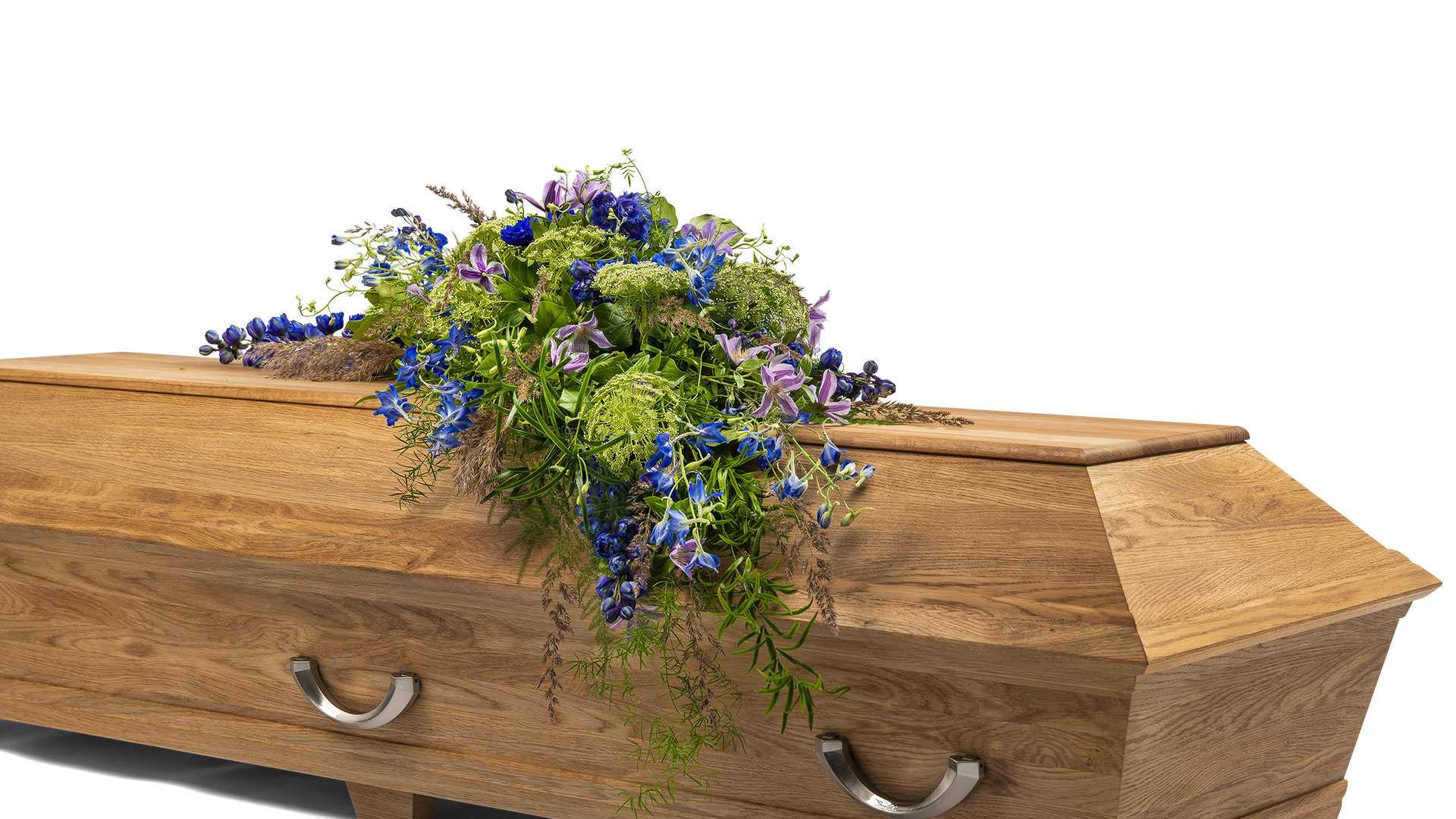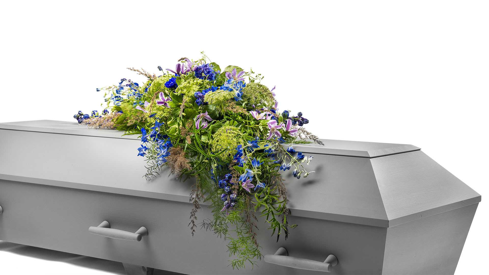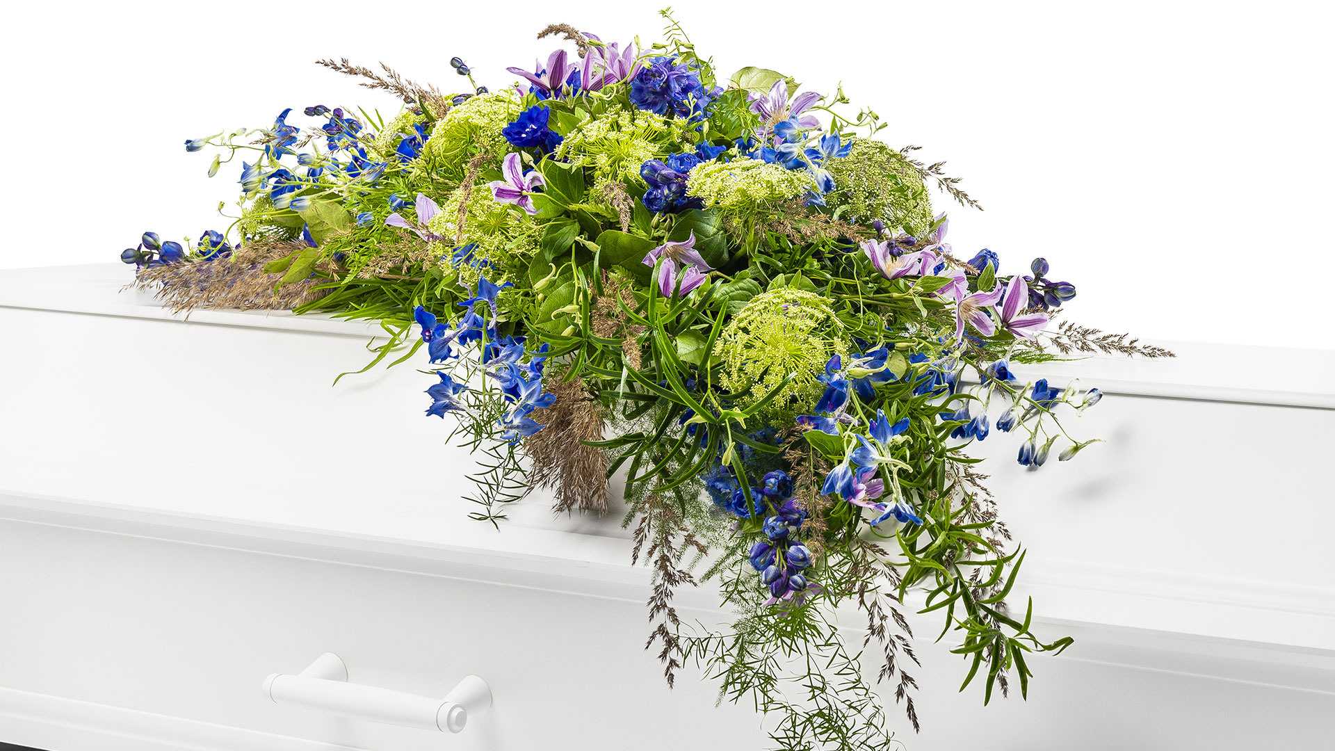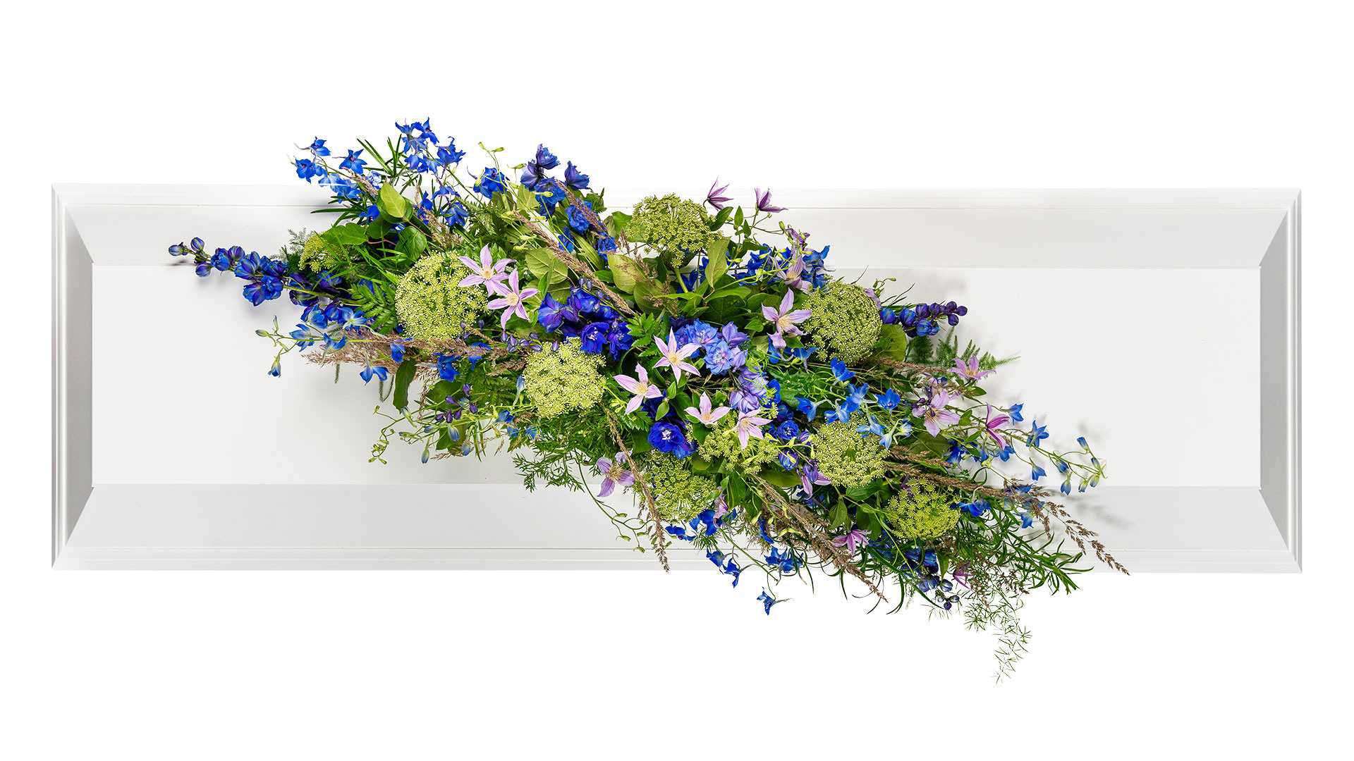 En låg kistdekoration med böljande form i blålila och grönt inspirerad av hav och strand.Längd: ca 120 cm