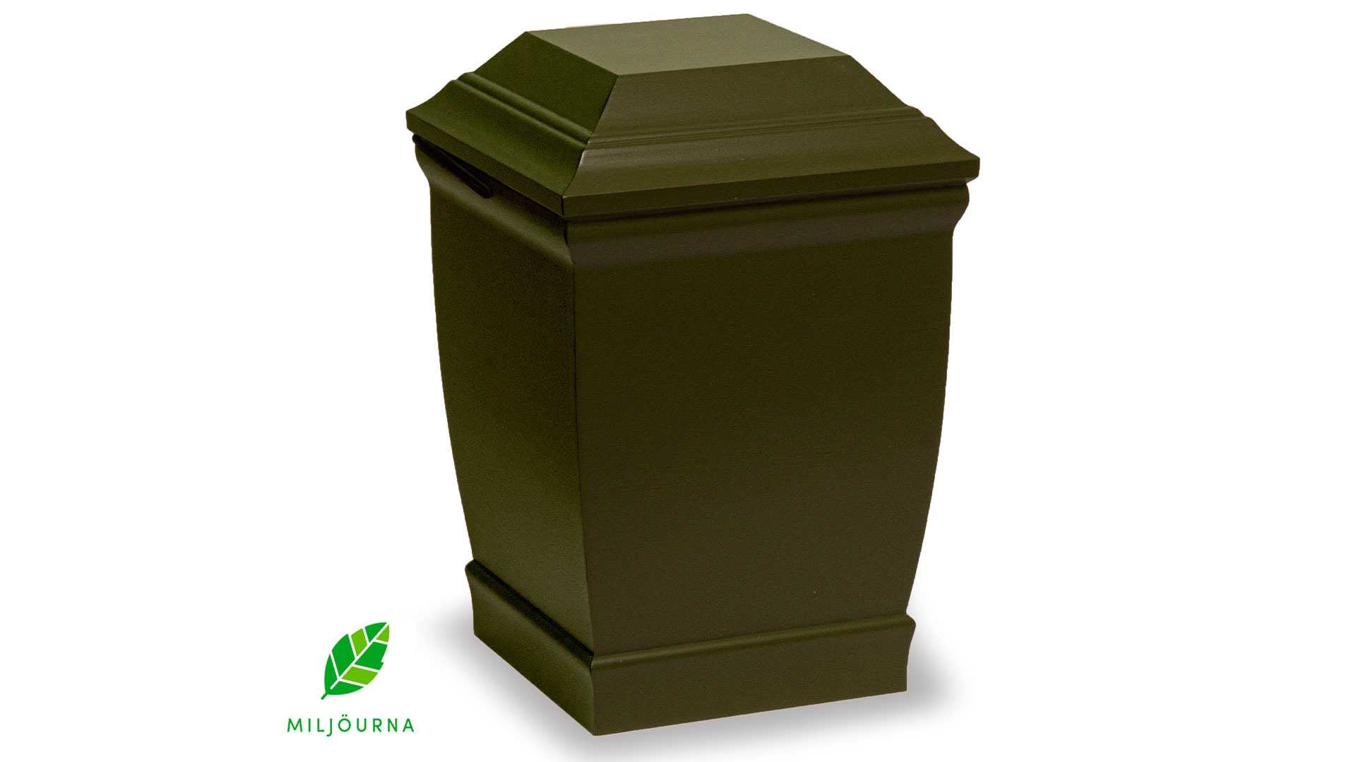 Klassisk är en urna tillverkad av massiv furu och är 100% nedbrytbar. Denna variant är målad i en mörkgrön kulör. Urnan är förgänglig och lämplig för gravsättning. Levereras med sänkband.