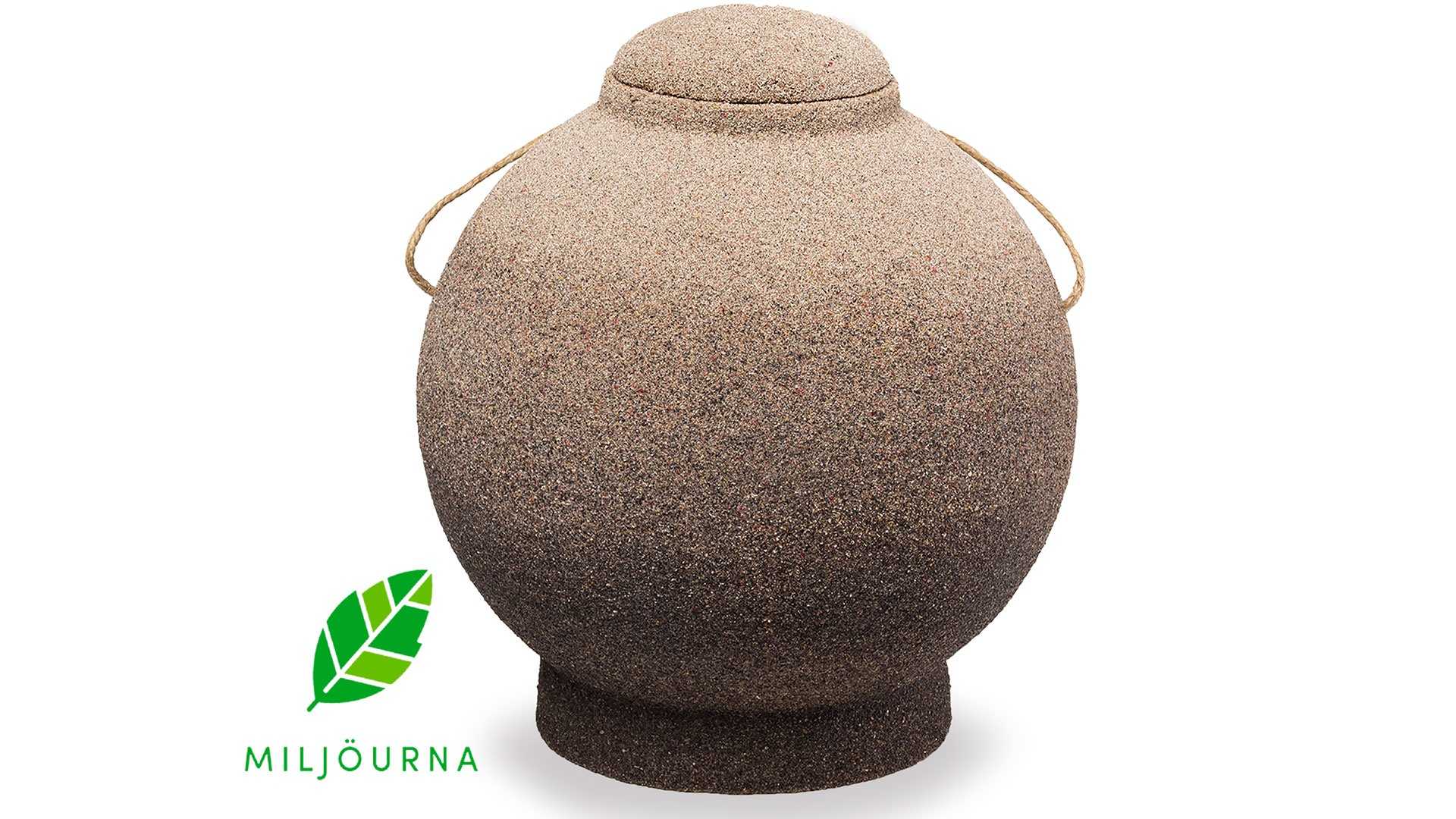 Urna av sand från vår svenska kust. Denna variant har en rund form och är tonad i en mörk nyans. Urnan är förgänglig och är speciellt framtagen för spridning i vatten men är även lämplig för gravsättning i jord. Levereras med sänkband.3 095 kr