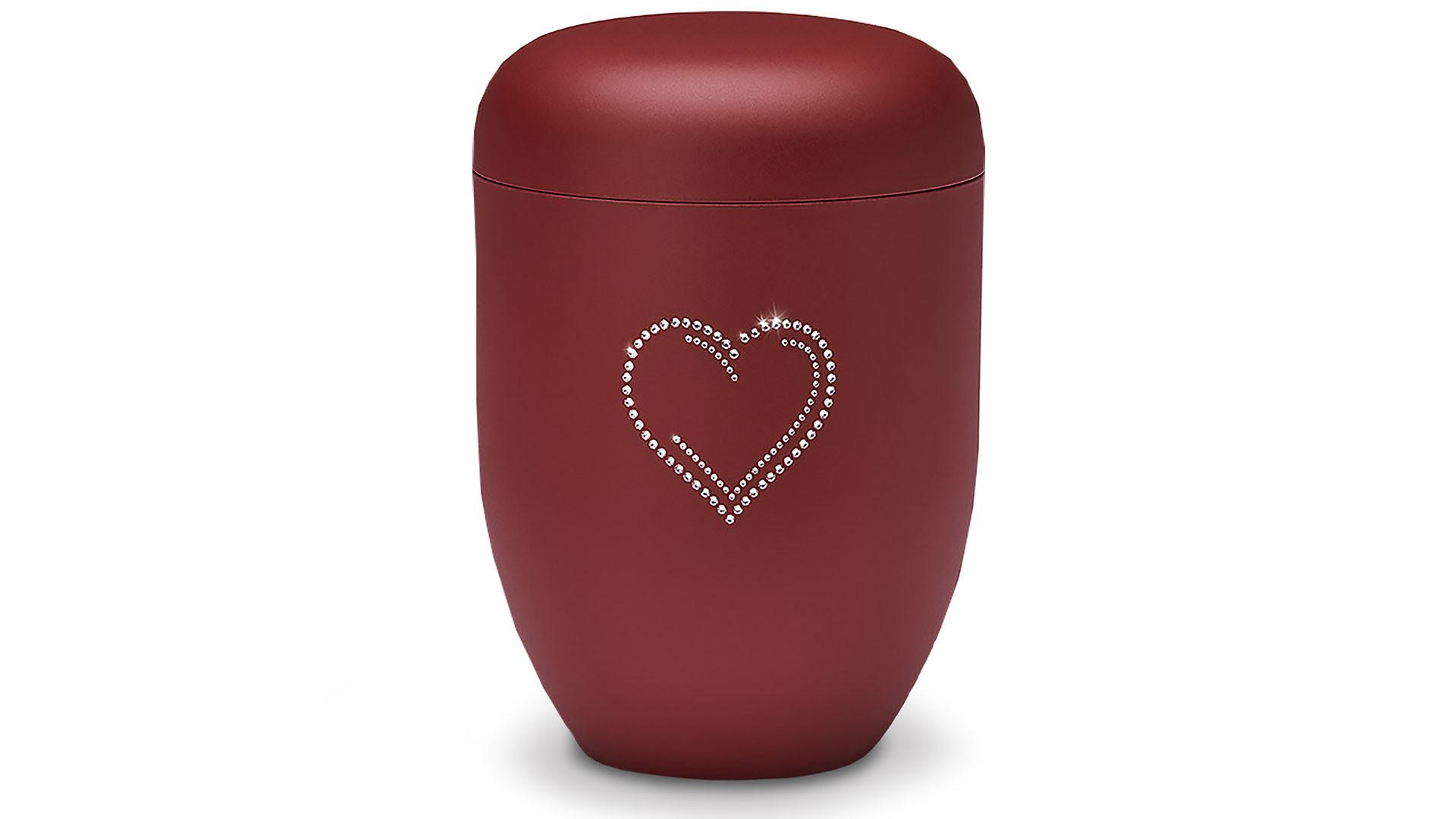 Sober är en stilren urna tillverkad av biofiber och är 100 % nedbrytbar. Denna variant är målad i rött och dekorerad med ett hjärta av Swarovski-kristaller. Urnan är förgänglig och har en stor öppning upptill vilket gör den lämplig för såväl gravsättning som för minneslund/askgravlund, där endast askpåse får användas. Levereras med sänkband.3 595 kr