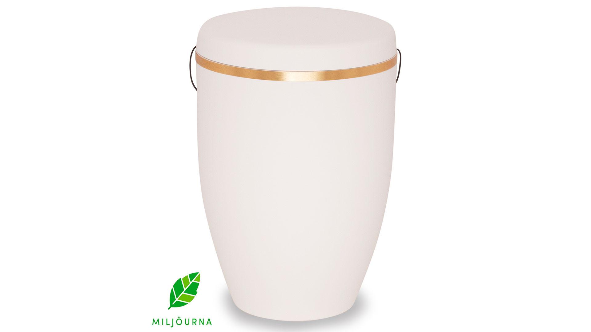 Stilig är en urna tillverkad av biofiber och är 100 % nedbrytbar. Denna variant är målad i vitt med en rand i guld. Urnan är förgänglig och har en stor öppning upptill vilket gör den lämplig för såväl gravsättning som för minneslund/askgravlund, där endast askpåse får användas. Levereras med sänkband.2 995 kr