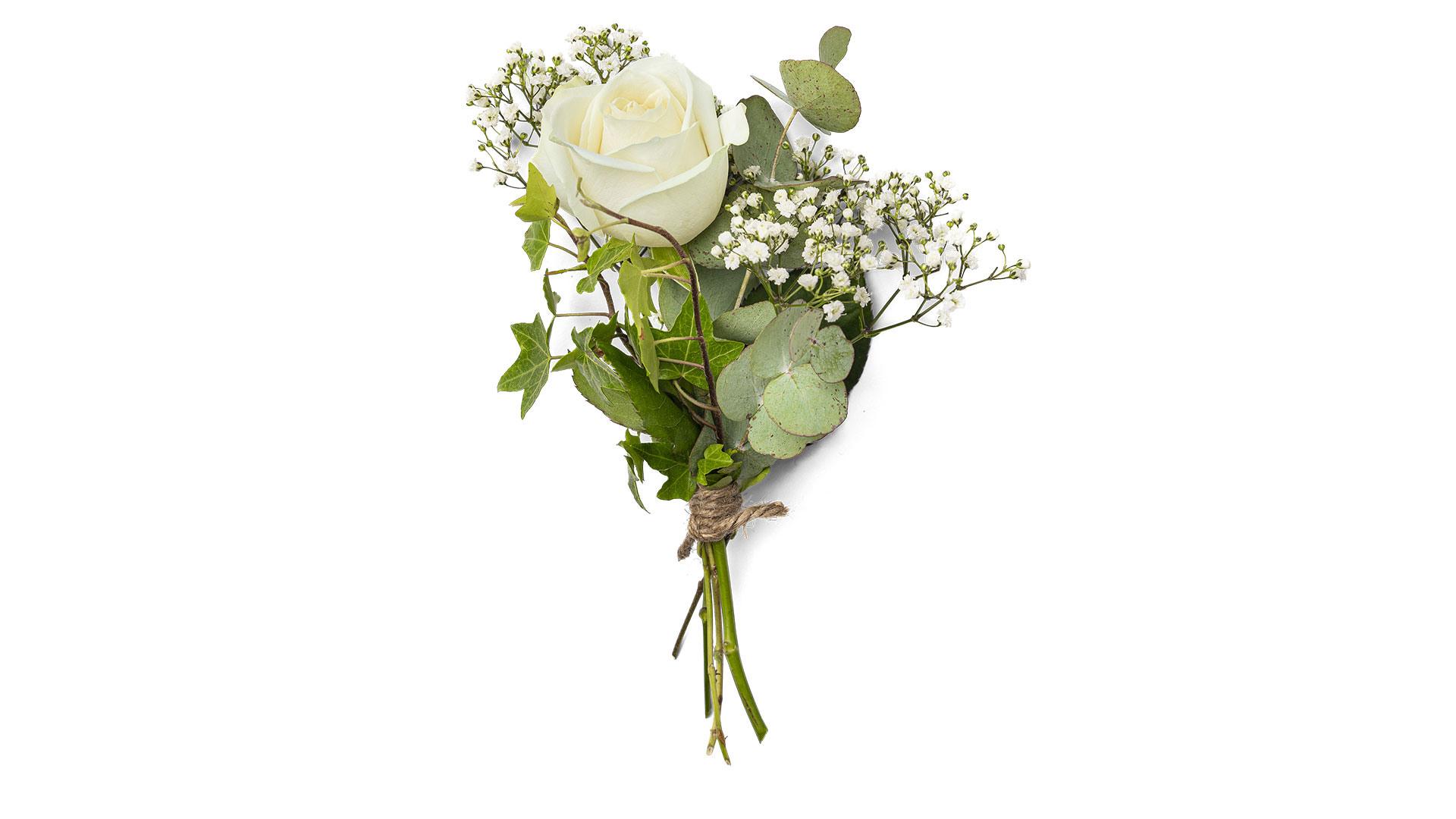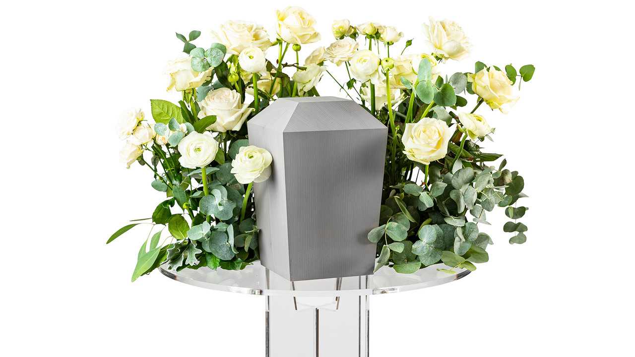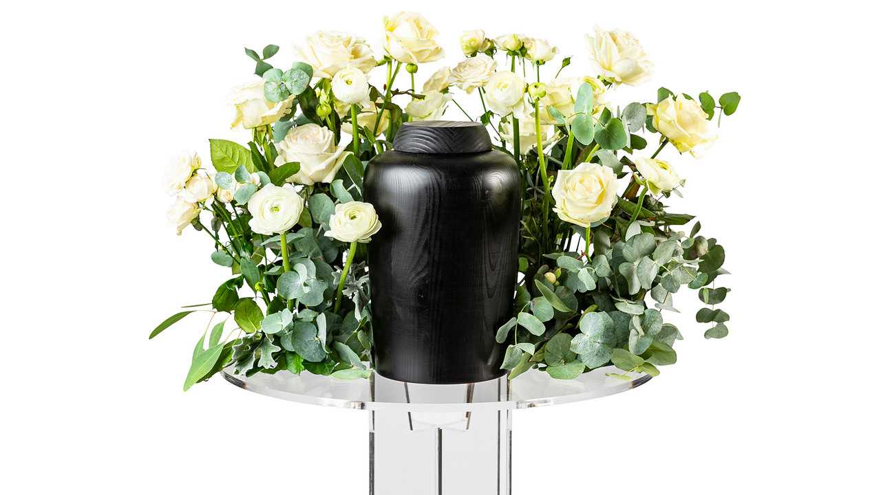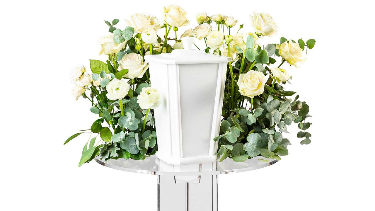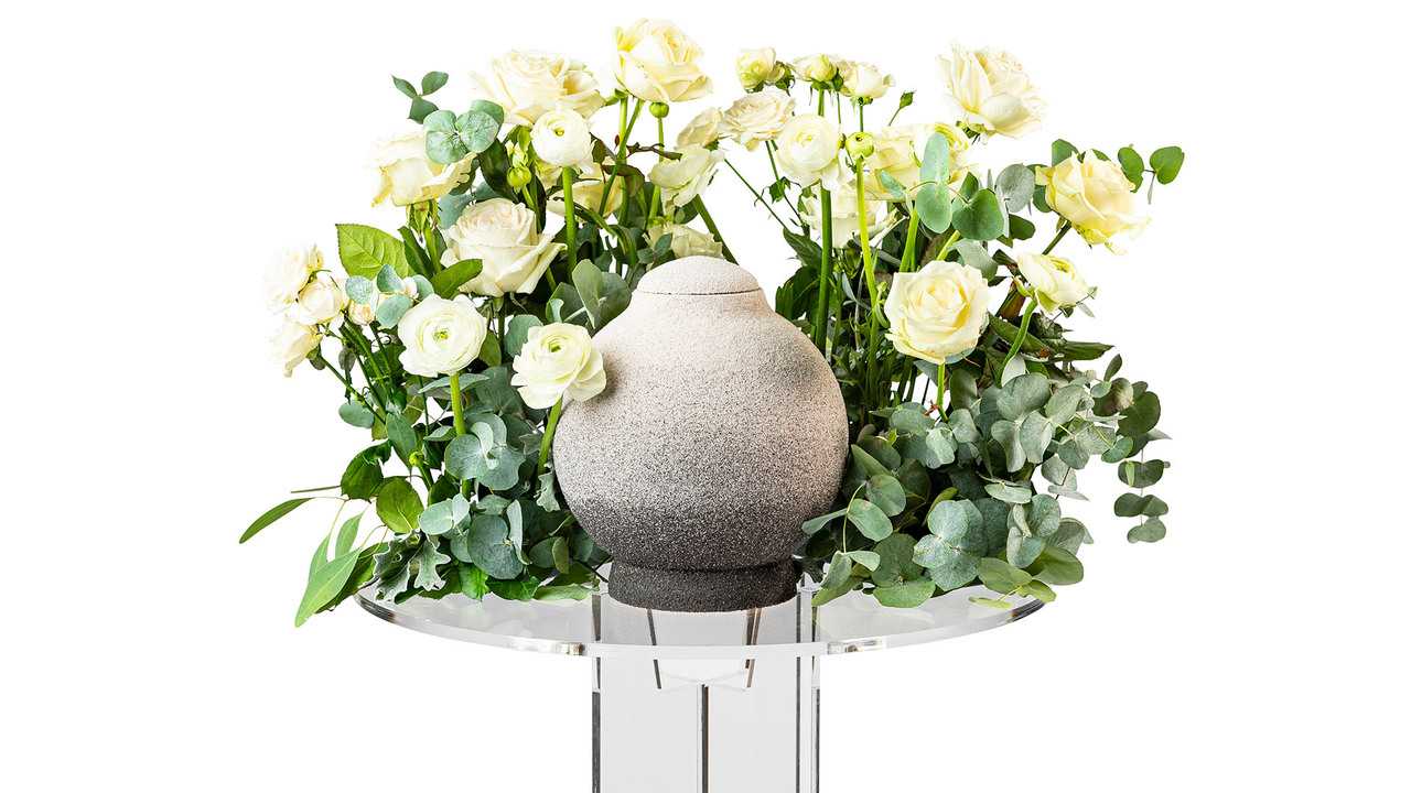 En urndekoration i form av en vacker berså med omfamnande känsla, bestående av bland annat cremevita rosor och silvergrå eukalyptus.Bredd: ca 45 cm