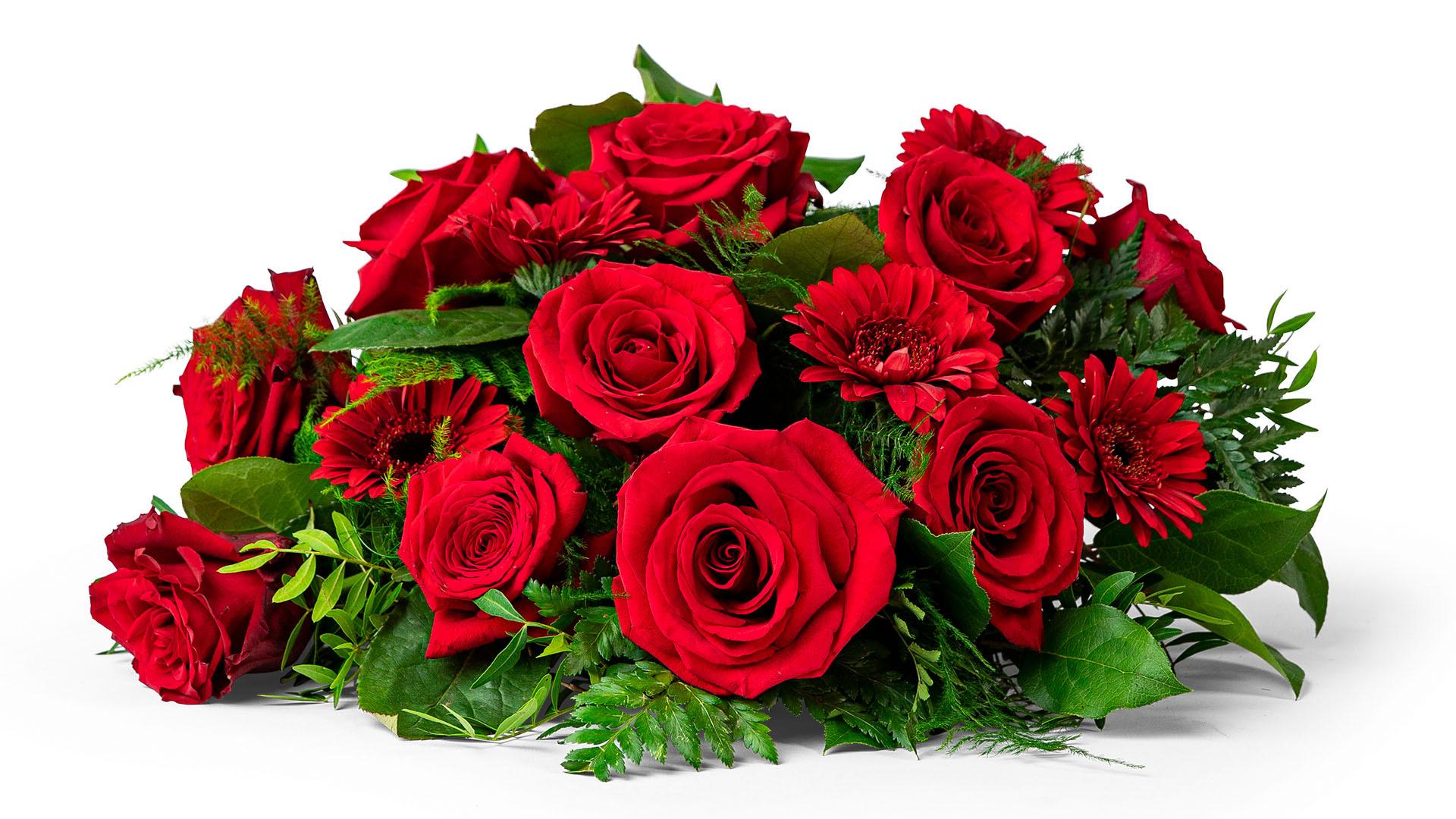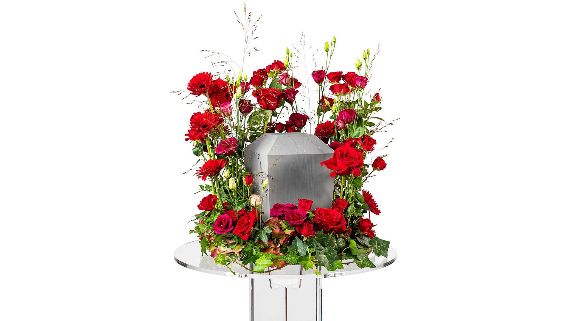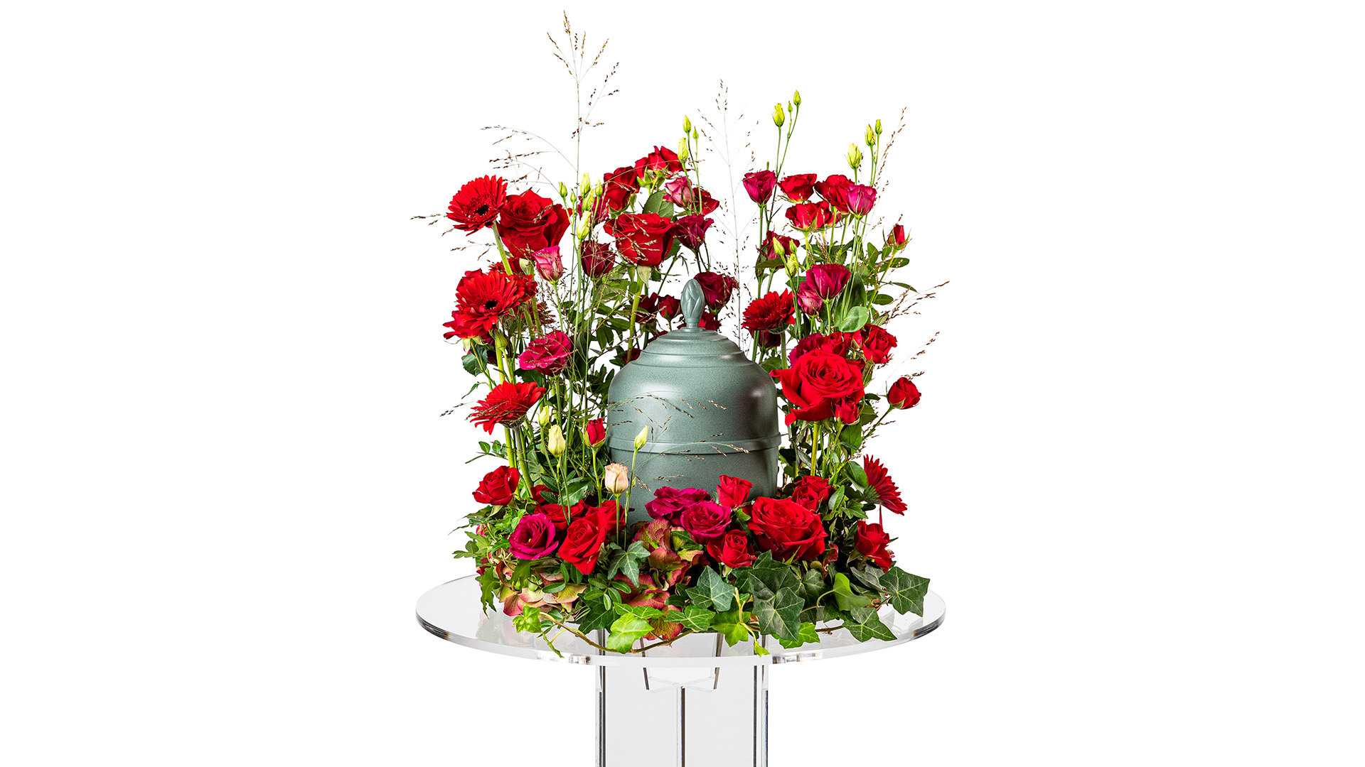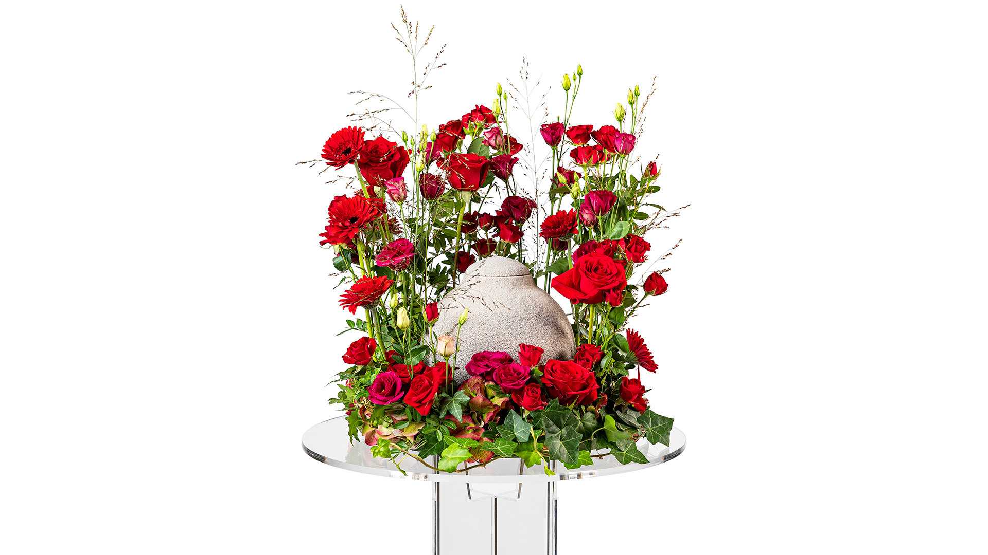 En urndekoration bestående av blommor i en röd färgskala som omfamnar urnan.
