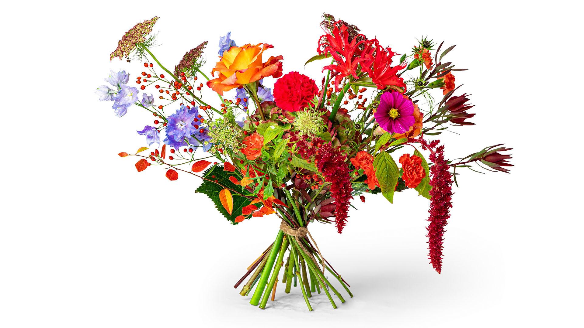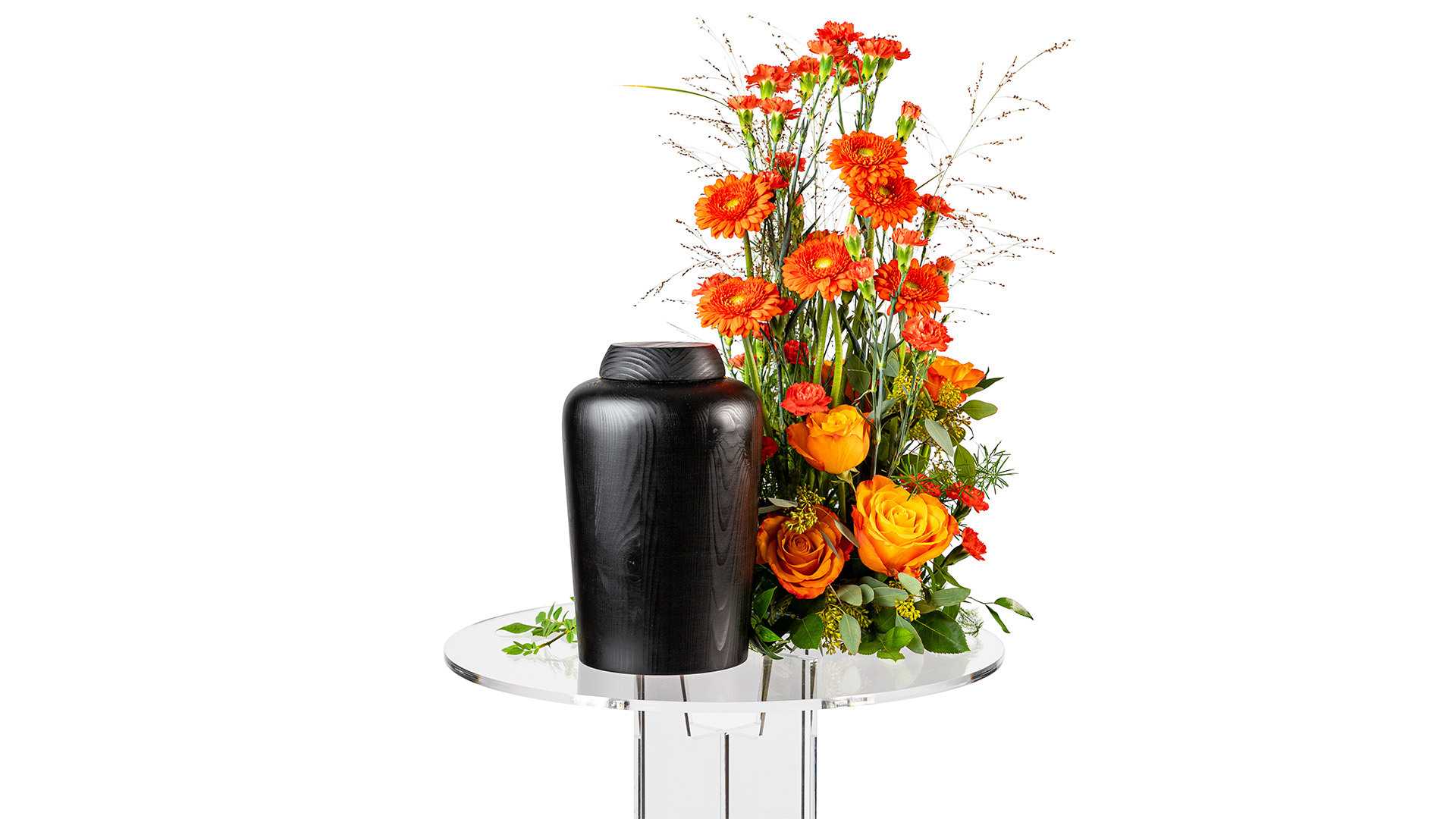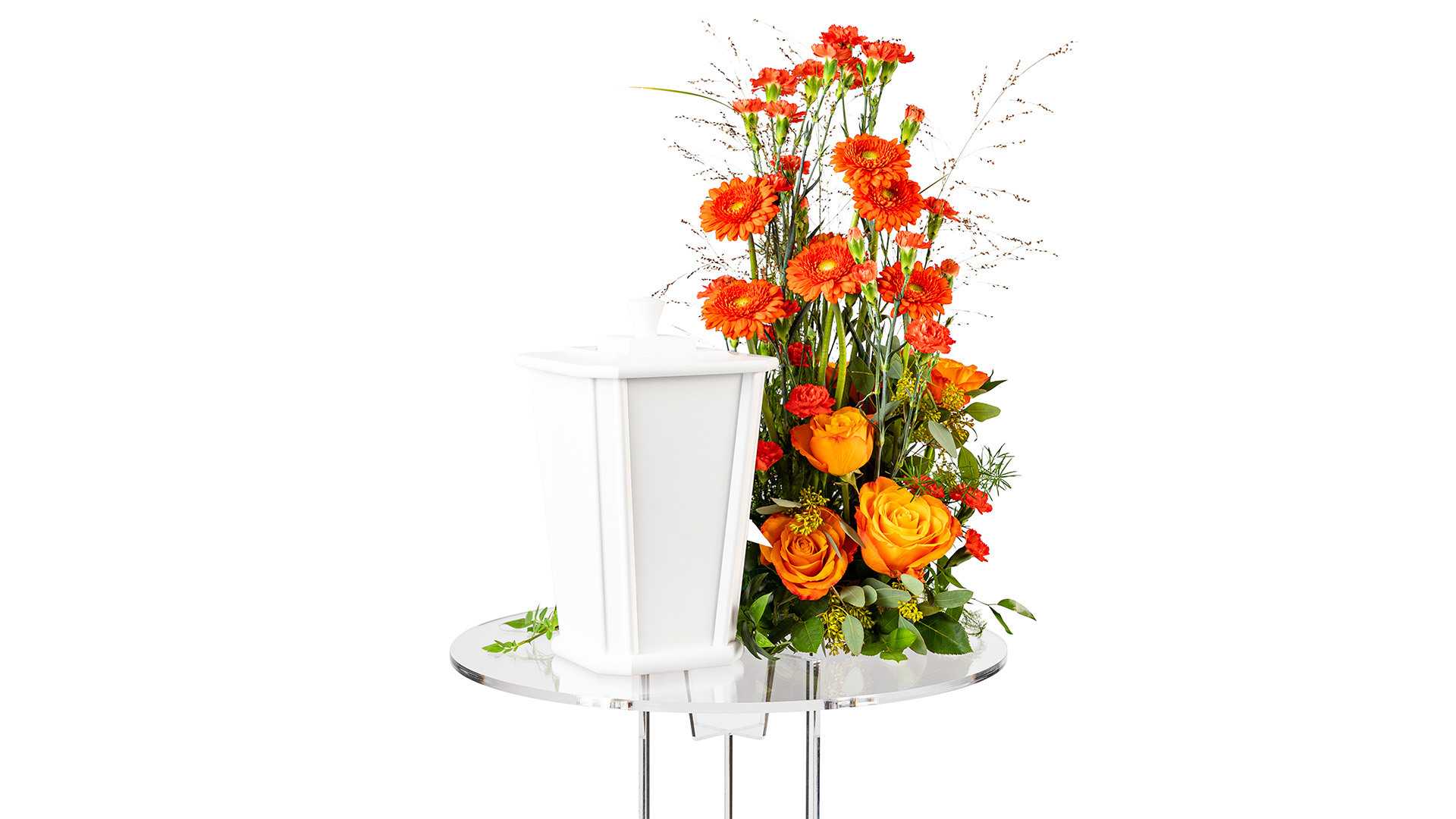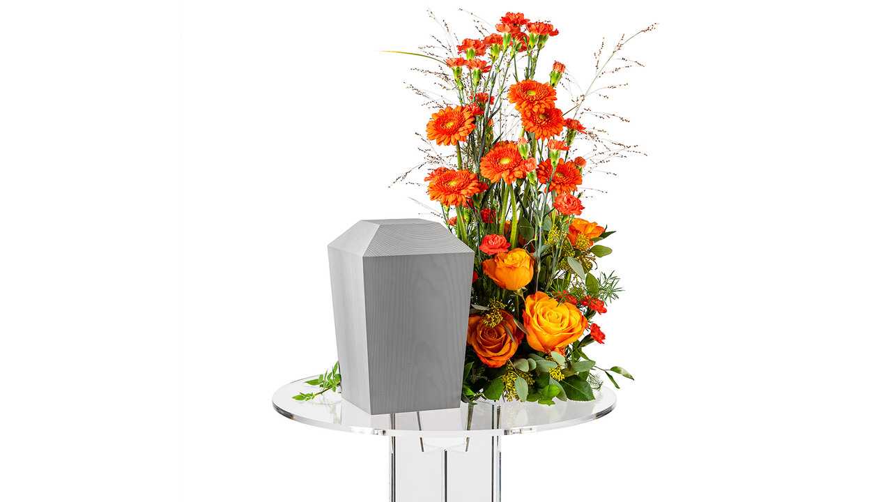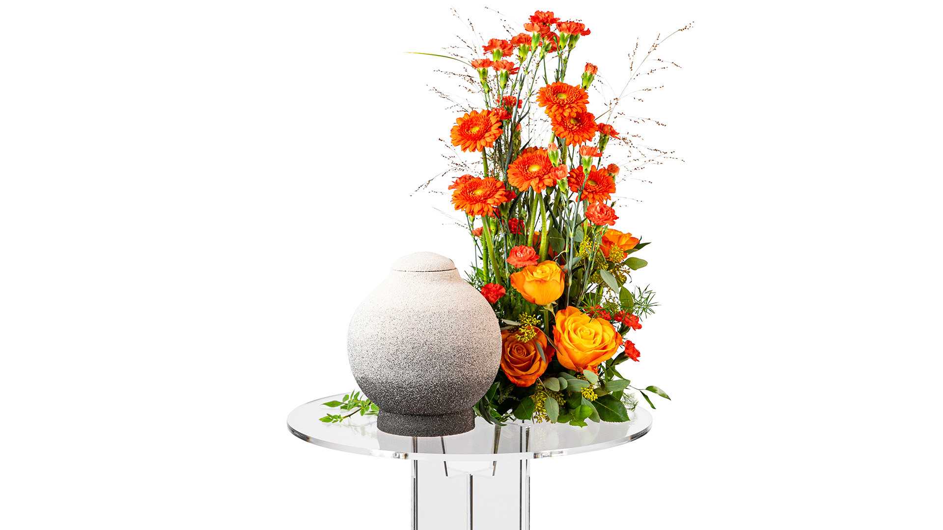 En färgstark hög urndekoration med blandade blommor i vackert orange och vippande gräs.Bredd: ca 30 cm
