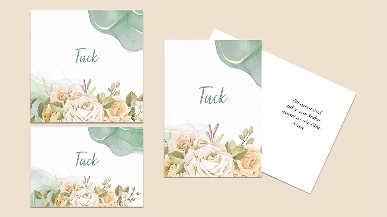 Tackkort är ett fint sätt att tacka släkt och vänner för deras deltagande i sorgen. De kan ha visat sin omtanke genom närvaro vid begravningen, minnesgåvor, blommor eller kondoleanser. Hos oss få du hjälp att utforma personliga tackkort.