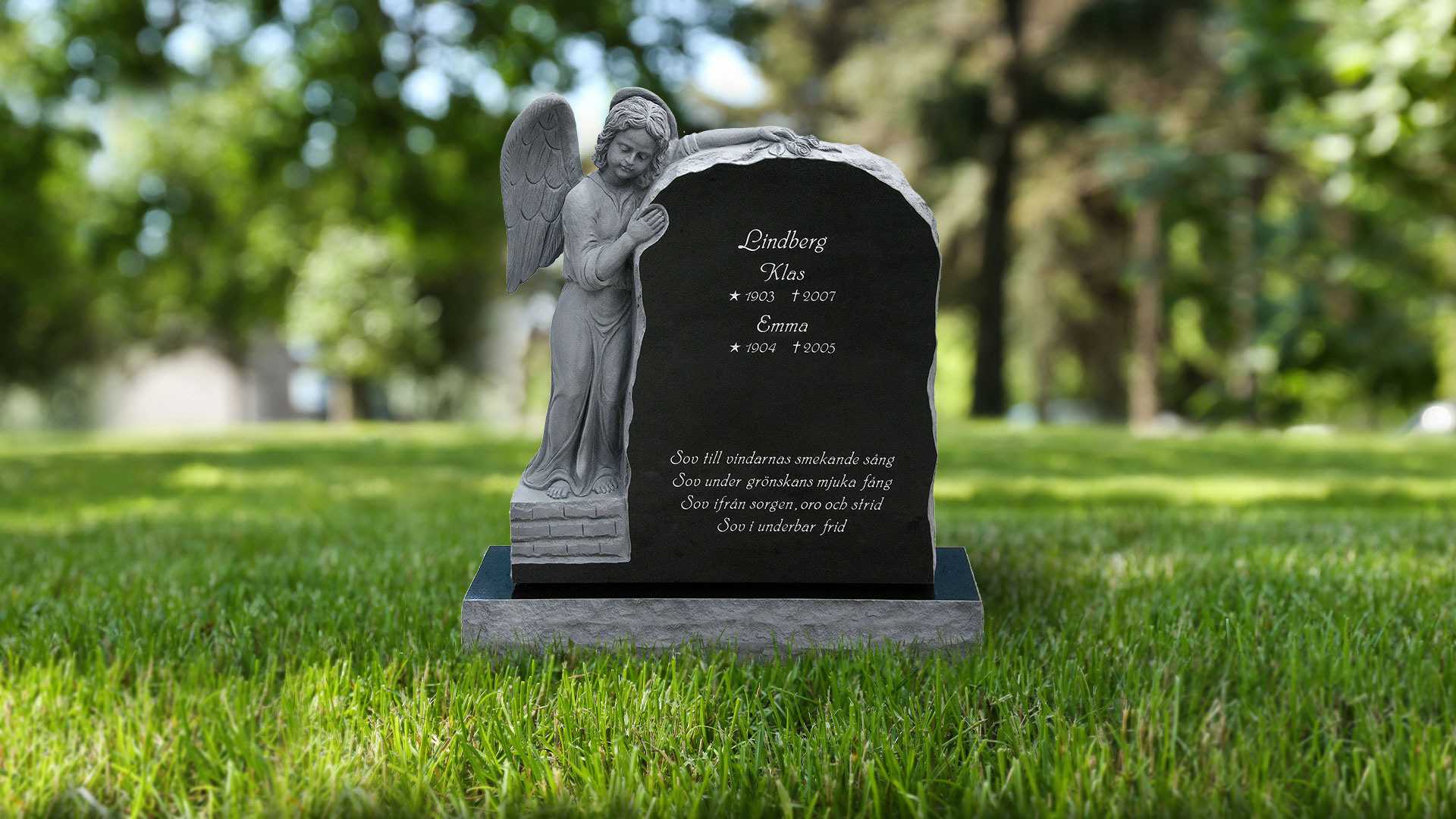 Stående sten med oregelbunden form och skulpterad ängel på sidan.- Modell: Stående hög