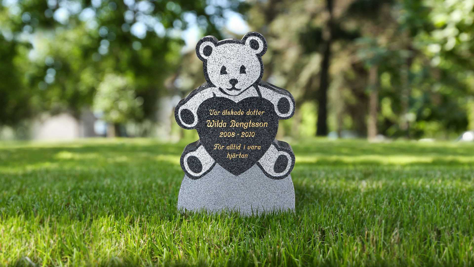 Stående sten med formen av en teddybjörn som håller i ett hjärta.- Modell: Stående hög