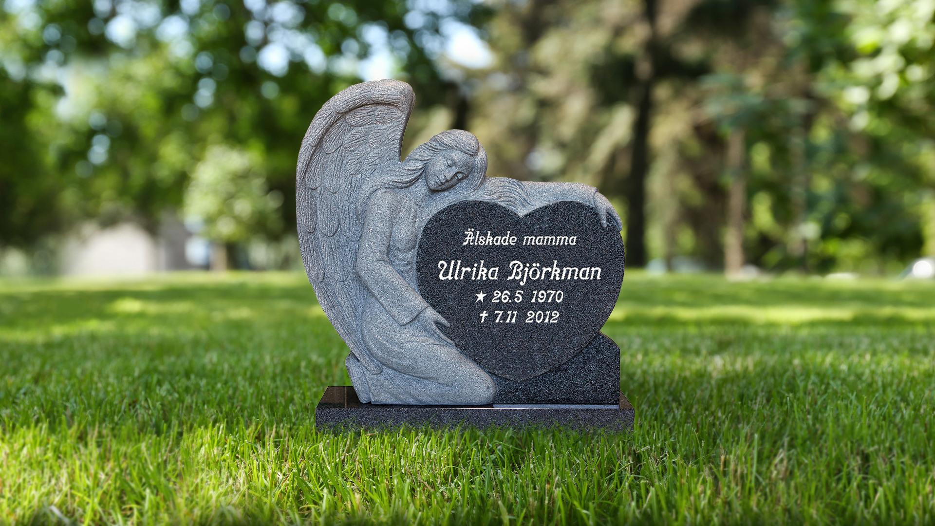 Stående sten med formen av en skulpterad ängel som omfamnar ett hjärta.- Modell: Stående hög