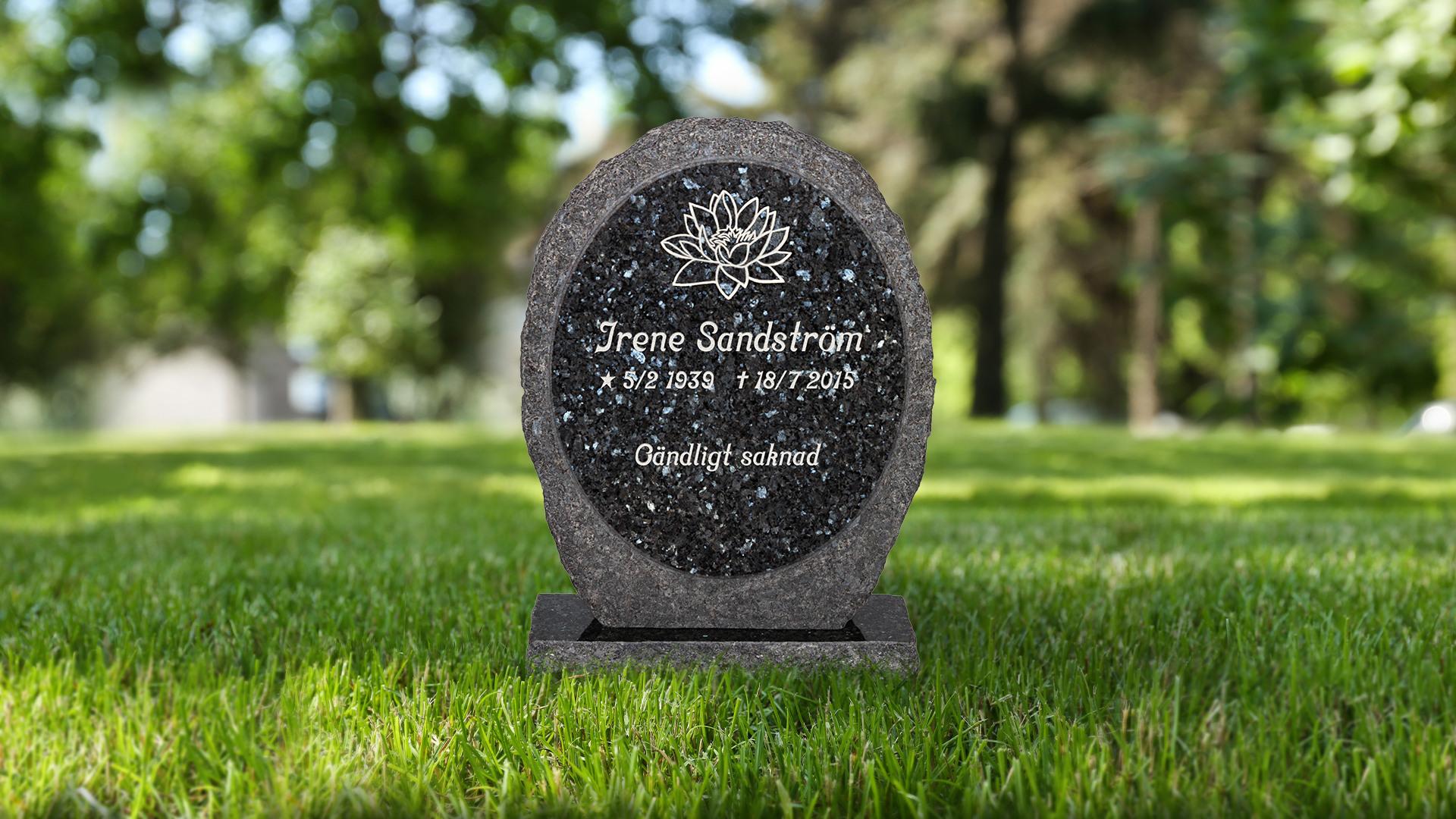 Rundad stående sten med polerad spegel och råhugget kantslag.- Modell: Stående hög