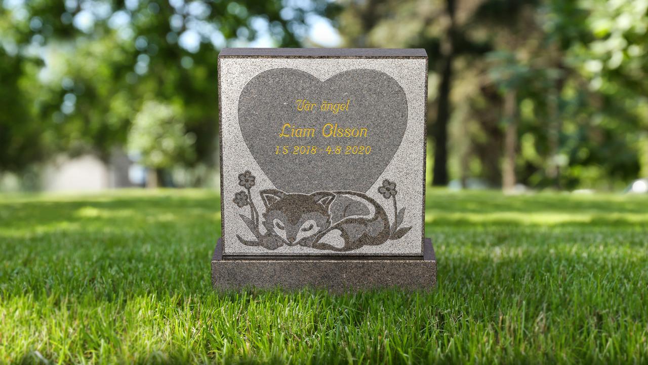 Stående kvadratisk sten med en sovande räv och ett hjärta som textyta.- Modell: Stående